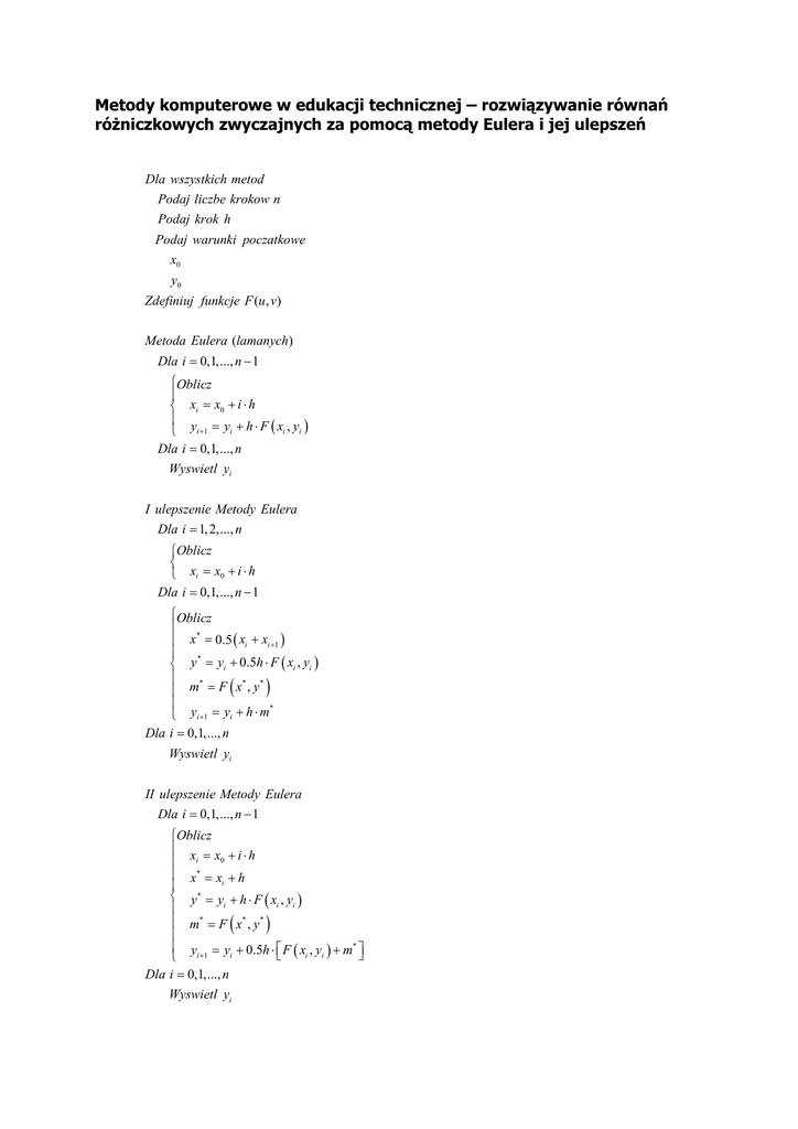 różniczkowych zwyczajnych za pomocą metody Eulera i jej ulepszeń