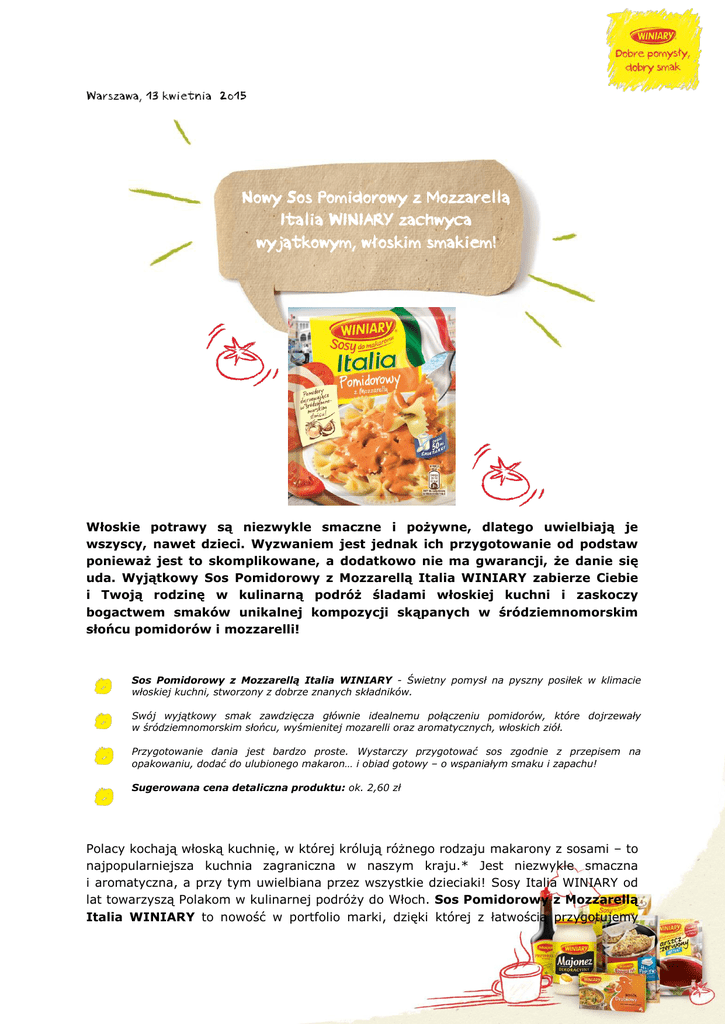 Warszawa, 13 kwietnia 2015 Nowy Sos Pomidorowy z Mozzarellą Italia WINIARY zachwyca wyjątkowym, włoskim smakiem! Włoskie potrawy są niezwykle smaczne i pożywne, dlatego uwielbiają je wszyscy, nawet dzieci. Wyzwaniem jest jednak ich przygotowanie od podstaw ponieważ jest to skomplikowane, a dodatkowo nie ma gwarancji, że danie się uda. Wyjątkowy Sos Pomidorowy z Mozzarellą Italia WINIARY zabierze Ciebie i Twoją rodzinę w kulinarną podróż śladami włoskiej kuchni i zaskoczy bogactwem smaków unikalnej kompozycji skąpanych w śródziemnomorskim słońcu pomidorów i mozzarelli! Sos Pomidorowy z Mozzarellą Italia WINIARY - Świetny pomysł na pyszny posiłek w klimacie włoskiej kuchni, stworzony z dobrze znanych składników. Swój wyjątkowy smak zawdzięcza głównie idealnemu połączeniu pomidorów, które dojrzewały w śródziemnomorskim słońcu, wyśmienitej mozarelli oraz aromatycznych, włoskich ziół. Przygotowanie dania jest bardzo proste. Wystarczy przygotować sos zgodnie z przepisem na opakowaniu, dodać do ulubionego makaron… i obiad gotowy – o wspaniałym smaku i zapachu! Sugerowana cena detaliczna produktu: ok. 2,60 zł Polacy kochają włoską kuchnię, w której królują różnego rodzaju makarony z sosami – to najpopularniejsza kuchnia zagraniczna w naszym kraju.* Jest niezwykle smaczna i aromatyczna, a przy tym uwielbiana przez wszystkie dzieciaki! Sosy Italia WINIARY od lat towarzyszą Polakom w kulinarnej podróży do Włoch. Sos Pomidorowy z Mozzarellą Italia WINIARY to nowość w portfolio marki, dzięki której z łatwością przygotujemy wyśmienity posiłek we włoskim stylu. Idealne połączenie składników, w tym dojrzewających w śródziemnomorskim słońcu pomidorów oraz mozzarelli z dodatkiem włoskich ziół sprawi, że nasze danie wręcz rozpłynie się w ustach. Wystarczy przygotować sos zgodnie z instrukcją na opakowaniu, a następnie dodać go do ulubionego makaronu, aby rozkoszować się połączeniem ulubionych włoskich smaków w jednym prostym, ale wyjątkowo pysznym i apetycznym daniu. Jednak powodów, które sprawiają, że Sos Pomidorowy z Mozzarellą Italia WINIARY jest w kuchni niezbędny, jest o wiele więcej. Nie lada sztuką jest przygotowanie obiadu, który będzie smakował wszystkim domownikom i w mgnieniu oka zniknie z wszystkich talerzy! Przygotuj pyszny sos według przepisu na opakowaniu, dodaj do niego ulubione składniki i każdego dnia ciesz się wyjątkowym daniem. Polecamy makaron spaghetti z sosem pomidorowym z mozzarellą WINIARY oraz dodatkiem szynki i rukoli! Makaron zrób według przepisu na opakowaniu, w międzyczasie pokrój szynkę w cienkie plasterki oraz przygotuj sos zgodnie z instrukcjami na etykiecie. Później wystarczy tylko wyłożyć makaron na talerz wraz ze wszystkimi składnikami, polać sosem, dodać rukolę i gotowe. To jedyny taki niepowtarzalny smak! Receptury wszystkich sosów do makaronu WINIARY ITALIA bazują na powszechnie znanych i cenionych składnikach, dobrze znanych z włoskiej kuchni. Serowy smak wzbogacony został o prawdziwy parmezan prosto z północnych Włoch, a smak pomidorowy – o pomidory, które wygrzewały się w promieniach śródziemnomorskiego słońca! Dodatkowo sosy mają idealną konsystencję a ich wyjątkowy smak przekona do obiadu nawet największego niejadka. Przygotuj się na zupełnie nowy wymiar smakowych doznań i wybierz sosy do makaronu Italia marki WINIARY, dzięki którym łatwo i szybko przyrządzisz pyszny posiłek dla całej rodziny. Sosy przygotujesz zaledwie w kilka minut, a dzięki dodaniu do nich ulubionych składników każdego dnia możemy zaserwować inne, wyjątkowe danie. Dania z makaronem to pole do popisu dla każdej pani domu. Dodatkowe ciekawe przepisy z wykorzystaniem sosów do makaronu z linii Italia WINIARY znajdziesz na www.winiary.pl * Badanie konsumenckie „Odkrywamy smaki rodzinnych chwil”, przeprowadzone przez firmę Millward Brown na zlecenie marki WINIARY. ## WINIARY to marka, która od lat jest gwarancją sukcesu w kuchni. Jej produkty inspirują współczesne panie domu do przygotowywania najsmaczniejszych potraw dla całej rodziny. Zupy, majonezy, buliony, sosy, Pomysły na…, dania instant, przyprawy, galaretki, kisiele czy budynie – w sumie ponad 230 różnych produktów kulinarnych WINIARY, które pozwalają w szybki i prosty sposób przyrządzić domowy posiłek. Na stronie www.winiary.pl panie domu znajdą przepisy oraz inspiracje kulinarne na każdy dzień. Produkty marki WINIARY rokrocznie zdobywają liczne nagrody przyznawane przez konsumentów i detalistów. W 2011 oraz 2012 roku redakcja „Rzeczpospolitej” przyznała marce WINIARY prestiżowy tytuł Najmocniejszej Marki Roku. Kontakt do biura prasowego: Edyta Szyszło kom. +48 519 429 226 email: [email protected] Kamila Dębniak kom. +48 508 988 861 email: [email protected]