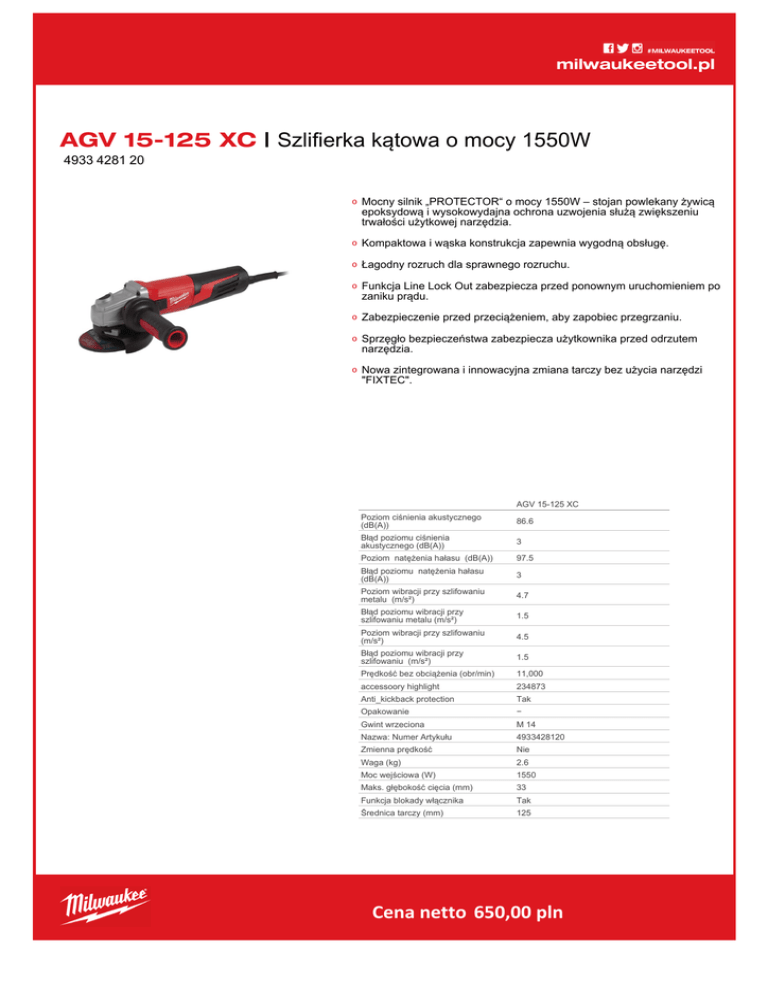 milwaukeetool.pl AGV 15-125 XC | Szlifierka kątowa o mocy 1550W 4933 4281 20 Mocny silnik „PROTECTOR“ o mocy 1550W – stojan powlekany żywicą epoksydową i wysokowydajna ochrona uzwojenia służą zwiększeniu trwałości użytkowej narzędzia. Kompaktowa i wąska konstrukcja zapewnia wygodną obsługę. Łagodny rozruch dla sprawnego rozruchu. Funkcja Line Lock Out zabezpiecza przed ponownym uruchomieniem po zaniku prądu. Zabezpieczenie przed przeciążeniem, aby zapobiec przegrzaniu. Sprzęgło bezpieczeństwa zabezpiecza użytkownika przed odrzutem narzędzia. Nowa zintegrowana i innowacyjna zmiana tarczy bez użycia narzędzi "FIXTEC". AGV 15-125 XC Poziom ciśnienia akustycznego (dB(A)) 86.6 Błąd poziomu ciśnienia akustycznego (dB(A)) 3 Poziom natężenia hałasu (dB(A)) 97.5 Błąd poziomu natężenia hałasu (dB(A)) 3 Poziom wibracji przy szlifowaniu metalu (m/s²) 4.7 Błąd poziomu wibracji przy szlifowaniu metalu (m/s²) 1.5 Poziom wibracji przy szlifowaniu (m/s²) 4.5 Błąd poziomu wibracji przy szlifowaniu (m/s²) 1.5 Prędkość bez obciążenia (obr/min) 11,000 accessoory highlight 234873 Anti_kickback protection Tak Opakowanie − Gwint wrzeciona M 14 Nazwa: Numer Artykułu 4933428120 Zmienna prędkość Nie Waga (kg) 2.6 Moc wejściowa (W) 1550 Maks. głębokość cięcia (mm) 33 Funkcja blokady włącznika Tak Średnica tarczy (mm) 125 Cena netto 650,00 pln