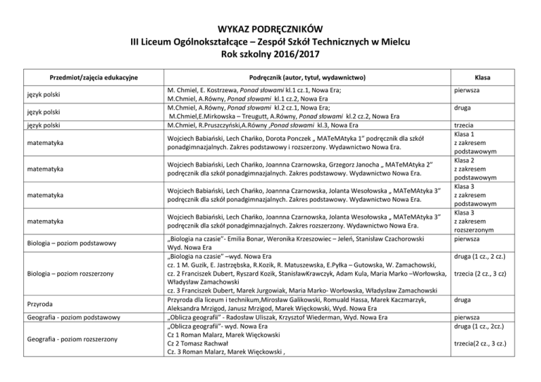 WYKAZ PODR CZNIKÓW III Liceum Ogólnokszta ce – Zespó Szkó Technicznych w Mielcu Rok szkolny 2016/2017 Przedmiot/zaj cia edukacyjne zyk polski zyk polski zyk polski Podr cznik (autor, tytu , wydawnictwo) M. Chmiel, E. Kostrzewa, Ponad s owami kl.1 cz.1, Nowa Era; M.Chmiel, A.Równy, Ponad s owami kl.1 cz.2, Nowa Era M.Chmiel, A.Równy, Ponad s owami kl.2 cz.1, Nowa Era; M.Chmiel,E.Mirkowska – Treugutt, A.Równy, Ponad s owami kl.2 cz.2, Nowa Era M.Chmiel, R.Pruszczy ski,A.Równy ,Ponad s owami kl.3, Nowa Era matematyka Wojciech Babia ski, Lech Cha ko, Dorota Ponczek „ MATeMAtyka 1” podr cznik dla szkó ponadgimnazjalnych. Zakres podstawowy i rozszerzony. Wydawnictwo Nowa Era. matematyka Wojciech Babia ski, Lech Cha ko, Joannna Czarnowska, Grzegorz Janocha „ MATeMAtyka 2” podr cznik dla szkó ponadgimnazjalnych. Zakres podstawowy. Wydawnictwo Nowa Era. matematyka Wojciech Babia ski, Lech Cha ko, Joannna Czarnowska, Jolanta Weso owska „ MATeMAtyka 3” podr cznik dla szkó ponadgimnazjalnych. Zakres podstawowy. Wydawnictwo Nowa Era. matematyka Wojciech Babia ski, Lech Cha ko, Joannna Czarnowska, Jolanta Weso owska „ MATeMAtyka 3” podr cznik dla szkó ponadgimnazjalnych. Zakres rozszerzony. Wydawnictwo Nowa Era. Biologia – poziom podstawowy Biologia – poziom rozszerzony Przyroda Geografia - poziom podstawowy Geografia - poziom rozszerzony „Biologia na czasie”- Emilia Bonar, Weronika Krzeszowiec – Jele , Stanis aw Czachorowski Wyd. Nowa Era „Biologia na czasie” –wyd. Nowa Era cz. 1 M. Guzik, E. Jastrz bska, R.Kozik, R. Matuszewska, E.Py ka – Gutowska, W. Zamachowski, cz. 2 Franciszek Dubert, Ryszard Kozik, Stanis awKrawczyk, Adam Kula, Maria Marko –Wor owska, adys aw Zamachowski cz. 3 Franciszek Dubert, Marek Jurgowiak, Maria Marko- Wor owska, W adys aw Zamachowski Przyroda dla liceum i technikum,Miros aw Galikowski, Romuald Hassa, Marek Kaczmarzyk, Aleksandra Mrzigod, Janusz Mrzigod, Marek Wi ckowski, Wyd. Nowa Era „Oblicza geografii” - Rados aw Uliszak, Krzysztof Wiederman, Wyd. Nowa Era „Oblicza geografii”- wyd. Nowa Era Cz 1 Roman Malarz, Marek Wi ckowski Cz 2 Tomasz Rachwa Cz. 3 Roman Malarz, Marek Wi ckowski , Klasa pierwsza druga trzecia Klasa 1 z zakresem podstawowym Klasa 2 z zakresem podstawowym Klasa 3 z zakresem podstawowym Klasa 3 z zakresem rozszerzonym pierwsza druga (1 cz., 2 cz.) trzecia (2 cz., 3 cz) druga pierwsza druga (1 cz., 2cz.) trzecia(2 cz., 3 cz.) WYKAZ PODR CZNIKÓW III Liceum Ogólnokszta ce – Zespó Szkó Technicznych w Mielcu Rok szkolny 2016/2017 Chemia – poziom podstawowy Chemia – poziom rozszerzony Fizyka- poziom podstawowy Fizyka- poziom rozszerzony Edukacja dla bezpiecze stwa. Ratownictwo medyczne Podstawy przedsi biorczo ci Marketing w turystyce historia – zakres podstawowy wiedza o spo ecze stwie – zakres podstawowy historia – zakres rozszerzony historia – zakres rozszerzony wiedza o spo ecze stwie - zakres rozszerzony „Odkrywamy na nowo”- Artur Sikorski, wyd. Operon „Odkrywamy na nowo” - Oficyna Pazdro cz. 1 S. Hejwowska, R. Marcinkowski, J.Staluszka cz. 2 Hejwowska, R. Marcinkowski, J.Staluszka cz. 3 S. Hejwowska, R. Marcinkowski, J.Staluszka, wyd. Operon Zbiór zada z chemii dla liceów i techników – zakres rozszerzony, K. Pazdro, A Rola – Noworyta, wyd. „Fizyka po prostu”- Ludwik Lehman, Witold Polesiuk, wyd. WSiP „Z fizyk w przysz ” wyd. Zamkor Cz. 1 Maria Fia kowska, Barbara Sagnowska, Jadwiga Salach Cz. 2 Maria Fia kowska, Barbara Sagnowska, Jadwiga Salach Cz. 3 Maria Fia kowska, Barbara Sagnowska, Jadwiga Salach „Edukacja dla bezpiecze stwa. Po prostu.” wydanie 4 zmienione (2015). Bogus aw Breitkopf, Mariusz Cie la, wyd. WSiP Podstawy ratownictwa medycznego dla funkcjonariuszy PSP i innych ratowników KSGR-G wydanie II G. Duga a, L. Smolarczyk , L. Wojtania, K. Jaros awska – Kolman, wyd. Komenda G ówna PSP, Fundacja Edukacja i Technika Ratownictwa Ratownik medyczny, wydanie II, J. Jakubaszko, wyd. Górnicki Wydawnictwo Medyczne „Krok w przedsi biorczo ”- Zbigniew Makie a, Tomasz Rachwa ,wyd. Nowa Era „Marketing us ug turystycznych” - Renata Tyli ska,wyd. Rea J. Ustrzycki – Ciekawi wiata. Historia. Podr cznik dla szkó ponadgimnazjalnych, wyd. Operon A. Janicki – W centrum uwagi – wiedza o spo ecze stwie. Podr cznik dla szkó ponadgimnazjalnych, wyd. Nowa Era R. Kulesza, K. Kowalewski – Zrozumie przesz . Staro ytno i redniowiecze. Podr cznik do historii dla liceum ogólnokszta cego i technikum. Cz 1, wyd. Nowa Era P. Klint, P. Gaik – Zrozumie przesz . Dzieje nowo ytne. Podr cznik do historii dla liceum ogólnokszta cego i technikum. Cz 2, wyd. Nowa Era A. Janicki, J. Kl czkowska, M. Menz – W centrum uwagi - wiedza o spo ecze stwie. Podr cznik dla liceum ogólnokszta cego i technikum. Cz 1, wyd. Nowa Era pierwsza druga (1 cz., 2cz.) trzecia( 3 cz.) pierwsza druga (1 cz., 2 cz.) trzecia (2 cz., 3 cz.) pierwsza druga i trzecia pierwsza druga i trzecia 1 1 2 2 2 WYKAZ PODR CZNIKÓW III Liceum Ogólnokszta ce – Zespó Szkó Technicznych w Mielcu Rok szkolny 2016/2017 T. Ma kowski – Pozna przesz . Ojczysty Panteon i ojczyste spory. Podr cznik do historii i spo ecze stwa dla liceum ogólnokszta cego i technikum, wyd. Nowa Era I. Janicka – Pozna przesz . Rz dz cy i rz dzeni. Podr cznik do historii i spo ecze stwa dla historia i spo ecze stwo liceum ogólnokszta cego i technikum, wyd. Nowa Era J. Centek – Pozna przesz . Wojna i wojskowo . Podr cznik do historii i spo ecze stwa dla historia i spo ecze stwo liceum ogólnokszta cego i technikum, wyd. Nowa Era K. K odzi ski, T. Krzemi ski – Pozna przesz . Europa i wiat. Podr cznik do historii i historia i spo ecze stwo spo ecze stwa dla liceum ogólnokszta cego i technikum, wyd. Nowa Era K. K odzi ski, T. Krzemi ski – Pozna przesz . Europa i wiat. Podr cznik do historii i historia – zakres rozszerzony spo ecze stwa dla liceum ogólnokszta cego i technikum. Cz 3, wyd. Nowa Era J. K aczkow