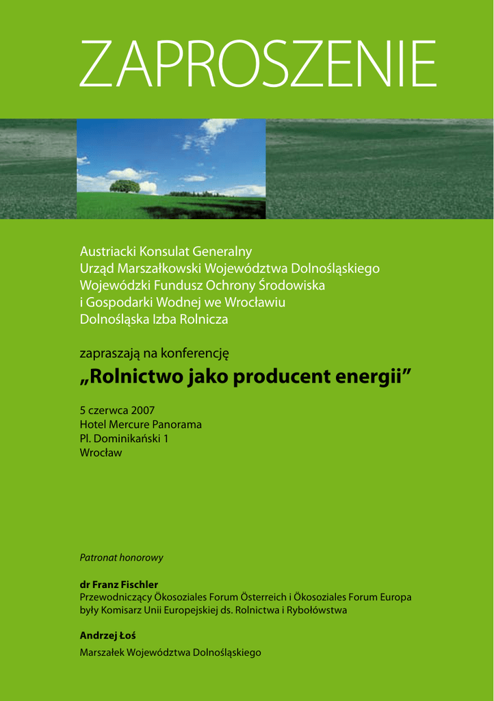 ZAPROSZENIE Austriacki Konsulat Generalny Urząd Marszałkowski Województwa Dolnośląskiego Wojewódzki Fundusz Ochrony Środowiska i Gospodarki Wodnej we Wrocławiu Dolnośląska Izba Rolnicza zapraszają na konferencję „Rolnictwo jako producent energii” 5 czerwca 2007 Hotel Mercure Panorama Pl. Dominikański 1 Wrocław Patronat honorowy dr Franz Fischler Przewodniczący Ökosoziales Forum Österreich i Ökosoziales Forum Europa były Komisarz Unii Europejskiej ds. Rolnictwa i Rybołówstwa Andrzej Łoś Marszałek Województwa Dolnośląskiego 8.00 - 9.00 Rejestracja uczestników Moderacja konferencji Richard Bisanz 9.00 - 9.45 9.45 - 10:00 Powitanie Andrzej Łoś Marszałek Województwa Dolnośląskiego Ewa Mańkowska Prezes Wojewódzkiego Funduszu Ochrony Środowiska i Gospodarki Wodnej we Wrocławiu Leszek Grala Prezes Dolnośląskiej Izby Rolniczej Hermine Poppeller Konsul Generalny Republiki Austrii w Krakowie Pakiet energetyczny UE i cele na 2020 w zakresie energetyki odnawialnej Grzegorz Wiśniewski Prezes Zarządu Instytutu Energetyki Odnawialnej, Wiceprezes EU Think Tank - ManagEnergy Reflection Group (MERG) 10.00 - 10.20 Stanowisko Polski wobec planu działań UE w zakresie odnawialnych źródeł energii Krystyna Panek-Gondek Ministerstwo Ochrony Środowiska, Departament Globalnych Problemów Środowiska i Zmian Klimatu 10.20 - 10.40 Sytuacja na rynku energetyki odnawialnej w Polsce Grzegorz Wiśniewski Prezes Zarządu Instytutu Energetyki Odnawialnej, Wiceprezes EU Think Tank - ManagEnergy Reflection Group (MERG) 10.40 - 11.00 Możliwości finansowania produkcji energii w rolnictwie Jan Krzysztof Ardanowski Podsekretarz Stanu Ministerstwa Rolnictwa i Rozwoju Wsi 11.00 - 11.15 Przerwa na kawę 11.15 - 12.00 Regionalna współpraca Polska – Austria, wspieranie energii odnawialnych w Austrii oraz stanowisko Austrii wobec planu działań UE Gerhard Burian Dyrektor Departamentu w Ministerstwie Gospodarki i Pracy Republiki Austrii 12.00 - 12.45 Produkcja energii szansą dla rolnictwa Heinz Kopetz Prezes Austriackiego Związku Biomasy 12.45 - 13.00 Dyskusja i podsumowanie 13.00 - 14.00 Lunch, Zwiedzanie stoisk informacyjnych, Networking 14.00 - 15.00 Przykłady zastosowania w Austrii Biogaz Josef Plank Styryjska Izba Rolnicza Lokalna kontraktacja energii Alexander Karner Austriacki Związek Biomasy Region samowystarczalny energetycznie – przykład Güssing Gerhard Burian Dyrektor Departamentu w Ministerstwie Gospodarki i Pracy Republiki Austrii Wydajność energetyczna Alois Geißlhofer Manager klastru Ökobau Cluster Niederösterreich Przykłady zastosowania w Polsce 15.00 - 15.30 Mozliwość produkcji biogazu na bazie surowców rolniczych Józef Szlachta Prorektor ds. Nauki, Uniwersytet Przyrodniczy we Wrocławiu Możliwości produkcji bioetanolu w dużych zakładach Przedstawiciel firmy DUDA S.A. Przerwa na kawę 15.30 - 15.45 Dyskusja panelowa: Produkcja energii szansą dla polskiego rolnictwa 15.45 - 17.00 Uczestnicy panelu: Leszek Grala Prezes Dolnośląskiej Izby Rolniczej Ewa Mańkowska Prezes Wojewódzkiego Funduszu Ochrony Środowiska i Gospodarki Wodnej we Wrocławiu Heinz Kopetz Prezes Austriackiego Związku Biomasy Gerhard Burian Dyrektor Departamentu w Ministerstwie Gospodarki i Pracy Republiki Austrii Grzegorz Wiśniewski Prezes Zarządu Instytutu Energetyki Odnawialnej, Wiceprezes EU Think Tank - ManagEnergy Reflection Group (MERG) 17.00 - 17.30 Podsumowanie W czasie przerw na kawę i przerwy na lunch będą się odbywać filmowe prezentacje projektów, które otrzymały austriackie i światowe nagrody „Energy Globe Award“ Tłumaczenie symultaniczne Udział w konferencji jest bezpłatny Miejsce konferencji i dojazd: Hotel Mercure Panorama, pl. Dominikański 1, 50-159 Wrocław Tel:+48 71 323 27 00, Fax: +48 71 344 36 81 e-mail: [email protected] Hotel znajduje się na terenie centrum handlowego Galeria Dominikańska Prosimy o potwierdzenie udziału do dnia 30 maja 2007: Austriacki Konsulat Generalny e-mail: [email protected] Tel.: 012 424 99 40 Fax: 012 421 67 64 lub Dolnośląska Izba Rolnicza e-mail: [email protected] Tel.: 071 339 98 26 Fax: 071 339 98 90 Patronat medialny: