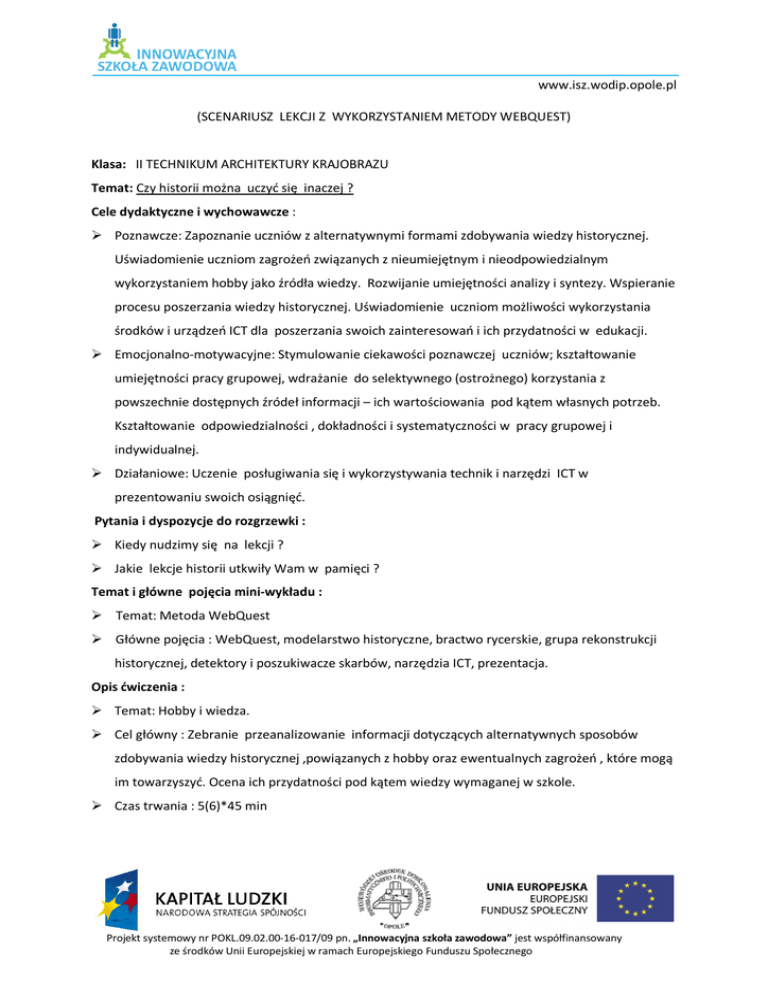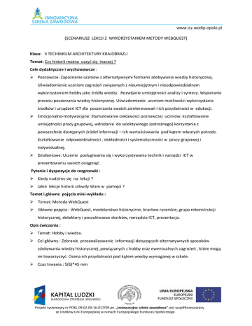 www.isz.wodip.opole.pl (SCENARIUSZ LEKCJI Z WYKORZYSTANIEM METODY WEBQUEST) Klasa: II TECHNIKUM ARCHITEKTURY KRAJOBRAZU Temat: Czy historii można uczyć się inaczej ? Cele dydaktyczne i wychowawcze : Poznawcze: Zapoznanie uczniów z alternatywnymi formami zdobywania wiedzy historycznej. Uświadomienie uczniom zagrożeń związanych z nieumiejętnym i nieodpowiedzialnym wykorzystaniem hobby jako źródła wiedzy. Rozwijanie umiejętności analizy i syntezy. Wspieranie procesu poszerzania wiedzy historycznej. Uświadomienie uczniom możliwości wykorzystania środków i urządzeń ICT dla poszerzania swoich zainteresowań i ich przydatności w edukacji. Emocjonalno-motywacyjne: Stymulowanie ciekawości poznawczej uczniów; kształtowanie umiejętności pracy grupowej, wdrażanie do selektywnego (ostrożnego) korzystania z powszechnie dostępnych źródeł informacji – ich wartościowania pod kątem własnych potrzeb. Kształtowanie odpowiedzialności , dokładności i systematyczności w pracy grupowej i indywidualnej. Działaniowe: Uczenie posługiwania się i wykorzystywania technik i narzędzi ICT w prezentowaniu swoich osiągnięć. Pytania i dyspozycje do rozgrzewki : Kiedy nudzimy się na lekcji ? Jakie lekcje historii utkwiły Wam w pamięci ? Temat i główne pojęcia mini-wykładu : Temat: Metoda WebQuest Główne pojęcia : WebQuest, modelarstwo historyczne, bractwo rycerskie, grupa rekonstrukcji historycznej, detektory i poszukiwacze skarbów, narzędzia ICT, prezentacja. Opis ćwiczenia : Temat: Hobby i wiedza. Cel główny : Zebranie przeanalizowanie informacji dotyczących alternatywnych sposobów zdobywania wiedzy historycznej ,powiązanych z hobby oraz ewentualnych zagrożeń , które mogą im towarzyszyć. Ocena ich przydatności pod kątem wiedzy wymaganej w szkole. Czas trwania : 5(6)*45 min Projekt systemowy nr POKL.09.02.00-16-017/09 pn. „Innowacyjna szkoła zawodowa” jest współfinansowany ze środków Unii Europejskiej w ramach Europejskiego Funduszu Społecznego www.isz.wodip.opole.pl Pomoce: notatnik, długopis , pisaki, szary papier, zestaw komputerowy z odpowiednim oprogramowaniem , aparat fotograficzny, kamera cyfrowa, projektor multimedialny, dowolny model plastikowy do samodzielnego montażu. Aranżacja przestrzeni: Ćwiczenia w kręgu i w ceowniku. Przebieg ćwiczenia : Siedząc w kręgu, uczniowie wraz z nauczycielem po zapoznaniu się z głównym celem zajęć i zarysem akcji WebQuestu dokonują podziału na grupy : I-Modelarze(„Zabawa i nauka”), IIPoszukiwacze skarbów („drążymy nie tylko ziemię”), III- Aktorzy historii ( członkowie bractw rycerskich i grup rekonstrukcji historycznych), IV-Nauczyciele („Co sprawdzone to pewne”) . Nauczyciel przedstawia opis rezultatu jaki mają osiągnąć uczniowie : Modelarze – wykazują , że konstruowanie modeli historycznych maszyn, urządzeń, makiet musi być podparte rzetelną wiedzą historyczną; przygotowują swoją część prezentacji multimedialnej oraz własny model. W trakcie pracy odwiedzają sugerowane strony internetowe : http://histmag.org/?id=2607 , http://modelarstwo.toplista.pl/ , http://www.modelegg.cal.pl/ , Poszukiwacze skarbów – przedstawiają „warsztat pracy” poszukiwacza oraz zaplecze teoretyczne niezbędne w realizowaniu tego hobby. W trakcie pracy korzystają z sugerowanych stron internetowych : http://www.poszukiwania.pl/portal/index.php , http://www.exploracjawielkopolska.dbv.pl/news.php , starają się dotrzeć do grup poszukiwaczy w swoim otoczeniu. Przygotowują swoją część prezentacji multimedialnej. Aktorzy historii – wykazują, że działalność grup rekonstrukcji historycznej i bractw rycerskich to nie tylko „zabawa w wojsko” -przygotowanie strojów i rynsztunku nie jest przypadkowe, lecz poprzedzone wnikliwą analizą historycznych źródeł i żmudną pracą. Grupa przygotowuje swoją część wspólnej prezentacji korzystając między innymi ze wskazanych stron : http://bractwa_rycerskie.najlepsze.net/ , http://draby.pl/wejscie.html , Projekt systemowy nr POKL.09.02.00-16-017/09 pn. „Innowacyjna szkoła zawodowa” jest współfinansowany ze środków Unii Europejskiej w ramach Europejskiego Funduszu Społecznego www.isz.wodip.opole.pl http://ulfhird.pl/glowna.html . Nauczyciele – wskazują niebezpieczeństwa i przekłamania tkwiące w postrzeganiu historii w formie zabawy lub hobby wykazują ,że „tradycyjna” historia nie musi być nudna i patetyczna. Przygotowują swoją część prezentacji. Pomocne strony : http://wiadomosci.gazeta.pl/Wiadomosci/1,80269,3421877.html , http://wyborcza.pl/1,75476,3573642.html , http://www.historycy.org/index.php?showtopic=457 Przydzielenie zadań każdej z grup oraz zapoznanie się z opisem ról. Zapoznanie się z ewentualnymi problemami, które mogą wystąpić w trakcie wykonywania zadań. Ustalenie czasu wykonywania zadań i kryteriów oceny. Wyznaczenie liderów grup i szczegółowego harmonogramu prac. Podział zadań wewnątrz grup. Indywidualna praca uczniów – zebranie informacji na zadany temat, niezbędnych do analizy i prezentacji problemu Na podstawie analizy zebranych informacji członkowie grup ustalają wspólne stanowisko i sporządzają notatkę. Liderzy grup spotykają się i ustalają plan wspólnej prezentacji. ( np. szczegóły szaty graficznej prezentacji i ram czasowych przewidzianych do wykorzystania przez każdą grupę. Przygotowanie prezentacji w grupach . Systematyczna obserwacja i ocena pracy uczniów nad postawionymi problemami przez nauczyciela. Przeprowadzenie końcowej prezentacji. Pytania i dyspozycje do omówienia ćwiczenia : Która część ćwiczenia sprawiła Ci największy problem ? Czy jesteś zadowolony ze swojej pracy? Czy odpowiada Ci praca metodą WebQuestu ? Projekt systemowy nr POKL.09.02.00-16-017/09 pn. „Innowacyjna szkoła zawodowa” jest współfinansowany ze środków Unii Europejskiej w ramach Europejskiego Funduszu Społecznego www.isz