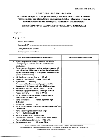 Załącznik Nr 6 do SIWZ PRZETARG NIEOGRANICZONY „Zakup sprzętu do obsługi konferencji, warsztatów i szkoleń w ramach realizowanego projektu „Smaki pogranicza: Polsko - Słowacka wymiana doświadczeń w dziedzinie turystki kulinarno - krajoznawczej" na SZCZEGÓŁOWY OPIS OFEROWANEGO PRZEDMIOTU ZAMÓWIENIA Część nr 1. Laptop - 1 szt. Nazwa producenta* Typ (model)* ...................................................................................... . Cena jednostkowa brutto* ..................... zł * należy wypełnić obowiązkowo Opis oferowanych parametrów Opis wymaganych parametrów minimalnych • • • • • • • • • • • • • • • • • • • Typ - komputer mobilny /biznesowy W ofercie wymagane jest podanie modelu, symbolu oraz producenta Zastosowanie: Komputer będzie wykorzystywany dla potrzeb aplikacji biurowych, aplikacji edukacyjnych, aplikacji obliczeniowych, dostępu do internetu oraz poczty elektronicznej 15 cali Minimalna przekątna ekranu Zalecana rozdzielczość 1366 x 768 pikseli matowy Typ ekranu Procesor wielordzeniowy osiągający w teście PassMark CPU Mark wynik min. 3800 punktów Minimalna wielkość pamięci RAM 4 GB Minimalna pojemność dysku twardego 500 GB Napęd optyczny DVD+/-RW DL Karta graficzna: zintegrowana ze sprzętowym wsparciem dla DirectX 11 stereo, zgodna z High karta dźwiękowa Definition czytnik kart pamięci SD Karta sieciowa bezprzewodowa WiFi IEEE 802.llb/g/n , Bluetooth Karta sieciowa przewodowa 100 Mbps Porty 2x USB, 2x USB 3.0 Wyjścia zewnętrzne: HDMI, O-Sub Wbudowana kamera rozdzielczość min 0.3 Mpix Pojemność akumulatora min. 4400 mAh System operacyjny Windows 8 Pro Projekt współfinansowany przez oraz budżet państwa za pośrednictwem Unię Europejską z Europejskiego Funduszu Rozwoju Regionalnego Euroregionu Karpackiego w ramach Programu Rzeczpospolita Polska - Republika ___ ______ ., Słowacka 2007 - 2013 Współpracy Transgranicznej 2.3 kg Maksymalna waga rok 1 Gwarancja Oprogramowanie Microsoft Office 2013 dla • • • Domowych i Małych Firm polska wersja językowa zawierająca min (Word, Excel, Powerpoint, Outlook) użytkowników • Powerpoint, Outlook) W powyższej tabeli obowiązkowo należy wypełnić wszystkie białe pola .. Laptop -1 szt. Nazwa producenta* Typ (model)* ...................................................................................... . Cena jednostkowa brutto* .................. ... zł * należy wypełnić obowiązkowo Opis oferowanych parametrów Opis wymaganych parametrów minimalnych • • • • • • • • • • • • • • • • • • • • • • • • • Typ-kompute r mobilny. W ofercie wymagane jest podanie modelu, symbolu oraz producenta Zastosowanie: Komputer będzie wykorzystywa ny dla potrzeb aplikacji edukacyjnych, , aplikacji biurowych, aplikacji obliczeniowych, dostępu do internetu oraz poczty elektronicznej 15 cali Minimalna przekątna ekranu Zalecana rozdzielczość 1366 x 768 pikseli matowy Typ ekranu Procesor wielordzeniow y osiągający w teście PassMark CPU Mark wynik min. 3300 punktów 4 GB Minimalna wielkość pamięci RAM Minimalna pojemność dysku twardego 500 GB DVD+/-RW DL Napęd optyczny Karta graficzna ze sprzętowym wsparciem dla DirectX 11 stereo zgodna z High karta dźwiękowa Definition SDXC, SDHC, SD, MMC czytnik kart pamięci Karta sieciowa bezprzewodowa WiFi IEEE 802.llb/g/n Karta sieciowa przewodowa 100 Mbps Porty 3x USB Wyjścia zewnętrzne: HDMI, O-Sub rozdzielczość min 0.3 Mpix Wbudowana kamera min. 4400 mAh Pojemność akumulatora 8 Windows System operacyjny 2.3 kg Maksymalna waga Maksymalna szerokość 381 mm Maksymalna głębokość 251 mm Maksymalna wysokość 33 mm min 2 lata Gwarancja: Oprogramowanie Microsoft Office 2013 polska Projekt współfinansowany przez oraz budżet państwa za Unię Europejską z Europejskiego Funduszu Rozwoju Regionalnego Współpracy Transgranicznej Euroregionu Karpackiego w ramach Programu Rzeczpospolita Polska - Republika Słowacka 2007 - 2013 pośrednictwem wersja językowa zawierająca min (Word, Excel, Powerpoint, Outlook) W powyższej tabeli obowiązkowo Część należy wypełnić wszystkie białe pola .. nr 2 - Aparat fotograficzny - 1 szt. Nazwa producenta* ............................................................................ . Typ (model)* ...................................................................................... . Cena jednostkowa brutto* ..................... zł * należy wypełnić obowiązkowo Opis oferowanych parametrów Opis wymaganych parametrów minimalnych • Gwarancja Przetwornik (min) Rozdzielczość • 20.4 MP • Nie mniej pikseli • Secure Digital SDXC SDHC microSDHC microSD Memory Stick PRO-HG Duo Memory Stick Pro Duo Memory Stick Micro Memory Stick Duo • • rodzaj • • obsługiwanej pamięci zewn. • • • • niż 5184 x 3888 • sox Minimalny zoom optyczny ogniskowa obiektywu wg filmu 35mm Szybkość minimum 2 lata w serwisie zewnętrznym migawki • 24-1200 mm • 30 s -1/4000 s Wbudowana lampa błyskowa Wbudowany wizjer optyczny Wbudowany wyświetlacz LCD Projekt współfinansowany przez oraz budżet państwa za Unię Europejską z Europejskiego Funduszu Rozwoju Regionalnego Współpracy Transgranicznej Euroregionu Karpackiego w ramach Programu Rzeczpospolita Polska - Republika Słowacka 2007 - 2013 pośrednictwem • 3 cale Interfejsy • • HDMI USB 2.0 Rodzaj zasilania • akumulator dedykowany Maksymalna szerokość • 129.6 mm Maksymalna wysokość • 93.2 mm Maksymalna głębokość • 103.2 mm • 623 g Minimalna przekątna LCD Maksymalna waga W powyższej tabeli obowiązkowo należy wypełnić W powyższej tabeli obowiązkowo należy wypełnić wszystkie białe pola. wszystkie białe pola .. UWAGA: W tabelach powyżej Wykonawca wymagane w nagłówkach tabel. „„„„„„„„„„„„„„, dn. „„„„„„„ obowiązkowo musi r. białe pola, podając z Europejs
