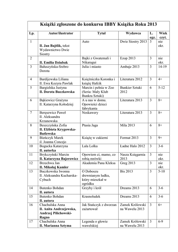 Książki zgłoszone do konkursu IBBY Książka Roku 2013 Lp. Autor/ilustrator 1 Tytuł Auto Il. Jan Bajtlik, tekst Wydawnictwo Dwie Siostry 2 3 4 5 Il. Emilia Dziubak Bałuszyńska-Srebro Dorota Bardijewska Liliana Il. Ewa Kozyra Pawlak Bargielska Justyna Il. Dorota Buczkowska 6 Bąkiewicz Grażyna Il. Katarzyna Kołodziej 7 Beręsewicz Paweł Il. Aleksandra Krzanowska Beszczyńska Zofia Il. Elżbieta KrygowskaButlewska Bieńczyk Marek il. Joanna Concejo Bogucka Katarzyna Il. autorka Brykczyński Marcin Il. Katarzyna Bajerowicz Brzechwa Jan Il. Mikołaj Kamler Buczkowska Iwonna Il. Aleksandra KucharskaCybuch 8 9 10 11 12 13 14 15 16 17 Butenko Bohdan Il. autora Butenko Bohdan Il. autora Chachulska Anna Il. Anita Andrzejewska, Andrzej PilichowskiRagno Chachulska Anna Il. Marianna Sztyma Wydawca L. Wiek egz. czyt. Dwie Siostry 2013 3 nie okr. Bajki z Gwatemali i Nikaragui Julia i miasto Ezop 2013 3 Ambaje 2013 3 nie okr. 14-19 Księżniczka Koronka i książę Hafcik Marcin i pełnia w Zoo (Seria: Mały Klub Bunkra Sztuki) A u nas w domu. Opowieści dzieci fabrykanta Noskawery Literatura 2012 3 4+ Bunkier Sztuki 2012 6 5-12 Literatura 2013 3 8+ Literatura 2013 3 8+ Ptasia Jaga Mila 2013 6 8+ Książę w cukierni Format 2013 3 9+ Lala Lolka Ładne Halo 2012 3 3-6 Opowiem ci, mamo, co robią mrówki Akademia Pana Kleksa Nasza Księgarnia 2013 Greg 2013 3 O Doboszu drewnianym ludku, który mieszkał w ogródku Grzyby i król Bis 2013 3 nie okr. nie okr. 5-10 Dreams 2013 6 3-6 Krasnoludek Dreams 2013 6 3-6 Jak Stańczyk z dworzan Zamek Królewski zażartował na Wawelu 2013 3 6+ Legenda o głowie wawelskiej 3 6-9 Zamek Królewski na Wawelu 2013 3 18 19 20 Chmielewska Iwona Il. autorki Chmielewska Iwona Il. autorki Chmielewska Iwona Il. autorki 21 22 Il. Elżbieta Wasiuczyńska Czerwińska-Rydel Anna Proj. graf. Marek Czernek 23 Czerwińska-Rydel Anna 24 Czerwińska-Rydel Anna Il. Katarzyna Bogucka 25 26 27 28 Il. Jola RichterMaguszewska Domazek-Pasierbek Lidia Il. Kamila Pasierbek Feleszko Wojciech Il. Ignacy Czwartos Frankowska Ewa Agnieszka Il. Marta Zalewska 29 Frączek Agnieszka Il. Joanna Rusinek 30 Fredro Aleksander Il. Adam Pękalski Gawryluk Barbara Gellner Dorota Il. Emilia Dziubak Gortat Grzegorz Il. Marta Krzywicka Gortat Grzegorz Il. Marta Krzywicka Grabowska-Grzyb Ałbena Il. Zuzanna Orlińska Grzegorczyk-Wosiek Agata Il. Jarosław Korzeniewski Hanak Sławomir 31 32 33 34 35 36 37 Cztery strony czasu Media Rodzina 2013 Format 2013 3 O tych, którzy się rozwijali Cudowna studzienka. Baśnie polskie. Opr. Joanna Papuzińska Media Rodzina 2013 Media Rodzina 2013 3 Kryształowe odkrycie. Powieść o Janie Czochralskim Mój brat czarodziej Debit 2013 3 12+ Akapit Press 2013 3 9-12 Przewodnik dla dzieci. Szczecin Danuta Wawiłow dzieciom Artmosphere 2013 Nasza Księgarnia 2013 3 8+ 3 nie okr. Dziewczynka z pytaniami Warszawska Firma Wydawnicza 2013 Hokus-Pokus 2013 Czerwona Papuga 2013 3 5-7 3 6+ 6 7-9 Literatura 2013 3 7+ Bajka 2013 3 5+ Cztery zwykłe miski Wielki grzmot. Biegunka Tajemnica klucza czyli o tym, czego Zosia i Boguś szukali na Saskiej Kępie Rany Julek! O tym, jak Julian Tuwim został poetą Paweł i Gaweł 6 3 nie okr. 4+ nie okr. nie okr. Dwa domy Mysia orkiestra Akapit Press 2013 3 Bajka 2013 6 10-12 4+ Ewelina i Czarny Ptak Ezop 2013 3 Nie budź mnie jeszcze Ezop 2013 3 Julek i Maja. Podróż w nieznane Tajemnice zamku nad Łyną Akapit Press 2013 3 nie okr. nie okr. 11-14 3 7-9 Dziewczyny i chłopaki. Niepotrzebne skreślić 3 7-9 Pracownia Wydawnicza ElSet 2013 Skrzat 2013 38 Horodecka-Wieczorek Joanna Hymn zawieszony w czasie 39 Jagielski Marek Koncepcja i ilustracje Ewa Kucharska Jagiełło Joanna Proj. okł. Olga Reszelska Jastrun Tomasz Il. Anna WizgirdStefanow Jaworek-Troć Joanna Il. autor Jędrzejewska-Wróbel Roksana Il. Paweł Pawlak 44 Kaminski Jehoszue Il. Ula Palusińska Majn alef bejs 45 Karwan-Jastrzębska Ewa Il. Anna Pol 46 Karwan-Jastrzębska Ewa Il. Anna Pol 47 Karwan-Jastrzębska Ewa Il. Ajka Karwowska Kasdepke Grzegorz Il. Aleksandra Woldańska-Płocińska Kasdepke Grzegorz Il. Artur Gulewicz Kiereś Emilia Agata z Placu Słonecznego. Przybycie Agaty Agata z Placu Słonecznego. Agata i jeszcze ktoś Banda Michałka 40 41 42 43 48 49 50 51 52 53 54 55 Kim Heekyoung Il. Krystyna LipkaSztarbałło Klimczak Rafał Il. Agnieszka KłosMilewska Kłaczyńska Małgorzata Danuta il. Agnieszka Pająk Kosik Rafał Il. autor Kosmowska Barbara Proj. okł. Elżbieta Chojna 3 13-20 Śląskie mity Educator Wyd. Akademii Polonijnej 2013 Brambla 2013 3 nie okr. Czekolada z chili Literatura 2013 3 15+ Antoś i jeszcze ktoś Czarna Owieczka 2013 3 6+ ABC MAVI 2013 3 0-6 O Melanii, Melchiorze i Panu Przypadku Bajka 2013 6 4+ Żydowskie Stowarzyszenie Czulent 2013 Marginesy 2012 3 3-7 3 7+ Marginesy 2013 3 7+ Znak Emotikon 2013 Narodowe Centrum Kultury 2013 Nasza Księgarnia 2013 Akapit Press 2013 3 nie okr. nie okr. Pestka, drops, cukierek. Liczby kultury Potworak i inne ko(s)miczne opowieści Kwadrans 3 3 3 nie okr. 9-12 Dokąd iść? Mapy mówią do nas Entliczek 2012 3 7+ Nudzimisie idą do szkoły Skrzat 2013 3 4-7 Ważne rozmowy Krysi o świecie. T. 1. Rozmowy o tolerancji Felix, Net i Nika oraz Świat Zero 2. Alternauci Niechciana Novae Res 2013 3 4-9 Powergraph 2012 3 12+ Literatura 2013 3 15+ 56 Kosmowska Barbara 57 Kozubska Katarzyna Ewa Il. Aleksandra Kucharska-Cybuch Królak Agata Il. autorki Krygier Michał Il. Alicja Wasilka Kwaśniewski Tomasz Il. Anna Bedyńska Lewicka Beata Il. Aleksandra Niesłuchowska Łacina Anna 58 59 60 61 62 63 64 65 66 67 68 69 70 71 72 73 74 75 Łoziński Mikołaj Il. Marta Ignerska Maciaszek Marta Proj. okł. Wiola Pierzgalska Maciaszek Marta proj. okł. Karolina Kucharska Majewski Łukasz Il. Krzysztof Krawiec Maleszka Andrzej Il. autor Mancomble Gérard Il. Paweł Pawlak Marciniak Katarzyna Il. Marta Kurczewska Mildner Paweł Il. autora Mortka Marcin Il. Marta Kurczewska Mortka Marcin Il. Marta Kurczewska Mortka Marcin I