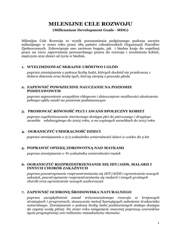 MILENIJNE CELE ROZWOJU (Millennium Development Goals - MDG) Milenijne Cele Rozwoju to wynik porozumienia podpisanego podczas szczytu milenijnego w 2000 roku przez 189 państw członkowskich Organizacji Narodów Zjednoczonych. Zobowiązuje ono zarówno bogate, jak i biedne kraje do wspólnej pracy na rzecz zapewnienia powszechnego prawa do rozwoju i uwolnienia kobiet, mężczyzn oraz dzieci od życia w biedzie. 1. WYELIMINOWAĆ SKRAJNE UBÓSTWO I GŁÓD poprzez zmniejszenie o połowę liczby ludzi, których dochód nie przekracza 1 dolara dziennie oraz liczbę tych, którzy cierpią z powodu głodu 2. ZAPEWNIĆ POWSZECHNE NAUCZANIE NA POZIOMIE PODSTAWOWYM poprzez zapewnienie wszystkim chłopcom i dziewczętom możliwości ukończenia pełnego cyklu nauki na poziomie podstawowym 3. PROMOWAĆ RÓWNOŚĆ PŁCI I AWANS SPOŁECZNY KOBIET poprzez wyeliminowanie nierównego dostępu płci do pierwszego i drugiego szczebla edukacyjnego do 2005 roku, a na wyższych szczeblach do 2015 roku 4. OGRANICZYĆ UMIERALNOŚĆ DZIECI poprzez zmniejszenie o 2/3 wskaźnika umieralności dzieci w wieku do 5 lat 5. POPRAWIĆ OPIEKĘ ZDROWOTNĄ NAD MATKAMI poprzez zmniejszenie o ¾ wskaźnika umieralności matek 6. OGRANICZYĆ ROZPRZESTRZENIANIE SIĘ HIV/AIDS, MALARII I INNYCH CHORÓB ZAKAŹNYCH poprzez powstrzymanie rozprzestrzeniania się HIV/AIDS i ograniczenie nowych zakażeń, powstrzymanie rozprzestrzeniania się malarii i innych groźnych chorób oraz ograniczenie nowych zachorowań 7. ZAPEWNIĆ OCHRONĘ ŚRODOWISKA NATURALNEGO poprzez uwzględnienie zasad zrównoważonego rozwoju w krajowych strategiach i programach, stosowanie metod hamujących zubożenie środowiska naturalnego. Zmniejszenie o połowę liczby ludzi pozbawionych stałego dostępu do czystej wody pitnej. Do 2020 roku osiągnięcie znacznej poprawy warunków życia przynajmniej 100 milionów mieszkańców slumsów 1 8. STWORZYĆ GLOBALNE PARTNERSKIE POROZUMIENIE NA RZECZ ROZWOJU poprzez wypracowanie dostępnego dla wszystkich, opartego na jasnych przepisach, przewidywalnego i nikogo nie dyskryminującego systemu handlowo – finansowego, zobowiązanie uczestników systemu do podejmowania działalności promującej dobre praktyki rządzenia, rozwój i ograniczanie ubóstwa, uwzględnienie szczególnych potrzeb państw najsłabiej rozwiniętych, wyspiarskich i śródlądowych (zwłaszcza zwiększenie dostępu do rynków krajów rozwiniętych, redukcję długów, zwiększenie pomocy rozwojowej), wypracowanie strategii na rzecz zapewnienia pracy młodemu pokoleniu, zwiększenie dostępu do leków dla krajów rozwijających się oraz umożliwienie im korzystania z dobrodziejstw nowoczesnej technologii. Więcej informacji o inicjatywach, które stanowią realizację Milenijnych Celów Rozwojowych znaleźć można miedzy innymi na stronach: http://www.polskapomoc.gov.pl, http://www.ecdpm.org http://www.euforic.org 2