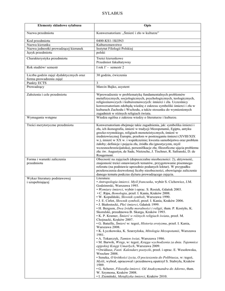 SYLABUS Elementy składowe sylabusu Opis Nazwa przedmiotu Konwersatorium: „Śmierć i zło w kulturze” Kod przedmiotu Nazwa kierunku Nazwa jednostki prowadzącej kierunek Język przedmiotu 0400-KS1-1KON3 Kulturoznawstwo Instytut Filologii Polskiej polski Charakterystyka przedmiotu Treści kierunkowe Przedmiot fakultatywny Rok studiów/ semestr I rok I˚ - semestr 2 Liczba godzin zajęć dydaktycznych oraz forma prowadzenia zajęć Punkty ECTS Prowadzący 30 godzin, ćwiczenia Założenia i cele przedmiotu Wprowadzenie w problematykę fundamentalnych problemów metafizycznych, socjologicznych, psychologicznych, teologicznych, religioznawczych i kulturoznawczych: śmierci i zła. Uczestnicy konwersatorium zdobędą wiedzę z zakresu symboliki śmierci i zła w kulturach Zachodu i Wschodu, a także stosunku do wymienionych zagadnień w różnych religiach świata. Wiedza ogólna z zakresu wiedzy o literaturze i kulturze. Wymagania wstępne Treści merytoryczne przedmiotu Forma i warunki zaliczenia przedmiotu Wykaz literatury podstawowej i uzupełniającej 3 Marcin Bajko, asystent Konwersatorium obejmuje takie zagadnienia, jak: symbolika śmierci i zła, ich ikonografia, śmierć w tradycji Mezopotamii, Egiptu, antyku grecko-rzymskiego, religiach monoteistycznych, śmierć w średniowiecznej Europie, przełom w postrzeganiu śmierci (XVIII/XIX w.), śmierć w XX w. i współcześnie; kwestia samobójstwa oraz problem żałoby; definicje i pojęcia zła, źródła zła (gnostycyzm, myśl wczesnochrześcijańska), personifikacje zła; filozoficzne ujęcia problemu zła: św. Augustyn, de Sade, Nietzsche, J. Tischner, R. Safranski, D. de Rougemont. Obecność na zajęciach (dopuszczalne nieobecności: 2), aktywność, znajomość treści omawianych tematów, przygotowanie pisemnego referatu (na podstawie uprzednio podanych lektur). W przypadku przekroczenia dozwolonej liczby nieobecności, obowiązuje zaliczenie danego tematu podczas dyżuru prowadzącego zajęcia. Literatura: • Antropologia śmierci. Myśl francuska, wybór S. Cichowicz, J.M. Godzimrski, Warszawa 1993. • Wymiary śmierci, wybór i oprac. S. Rosiek, Gdańsk 2003. • C. Ripa, Ikonologia, przeł. I. Kania, Kraków 2008. • W. Kopaliński, Słownik symboli, Warszawa 1990. • J. E. Cirlot, Słownik symboli, przeł. I. Kania, Kraków 2006. • J. Białostocki, Płeć śmierci, Gdańsk 1999. • H. Bergson, Dwa źródła moralności i religii, tłum. P. Kostyło, K. Skorulski, przedmowa B. Skarga, Kraków 1993. • K. P. Kramer, Śmierć w różnych religiach świata, przeł. M. Chojnacki, Kraków 2007. • G. Bataille, Śmierć w: tegoż, Historia erotyzmu, przeł. I. Kania, Warszawa 2008. • K. Łyczkowska, K. Szarzyńska, Mitologia Mezopotamii, Warszawa 1981. • A. Tokarczyk, Tamten świat, Warszawa 1986. • M. Barwik, Wstęp, w: tegoż, Księga wychodzenia za dnia. Tajemnice egipskiej Księgi Umarłych, Warszawa 2009. • Owidiusz, Fasti. Kalendarz poetycki, przeł. i oprac. E. Wesołowska, Wrocław 2008. • Seneka, O krótkości życia, O pocieszeniu do Polibiusza, w: tegoż, Myśli, wybrał, opracował i przedmową opatrzył S. Stabryła, Kraków 1989. • G. Scherer, Filozofia śmierci. Od Anaksymandra do Adorno, tłum. W. Szymona, Kraków 2008. • I. Ziemiński, Metafizyka śmierci, Kraków 2010. • M. Vovelle, Śmierć w cywilizacji Zachodu. Od roku 1300 po współczesność, Gdańsk 2004. • Philippe Ariès, Człowiek i śmierć, tłum. E. Bąkowska, Warszawa 1989. • A. Schopenhauer, O samobójstwie i inne pisma pomniejsze, wybrał, przełożył i wstępem opatrzył G. Sowiński, Kraków 2000. • Tegoż, Metafizyka życia i śmierci, tłum. J. Marzęcki, Warszawa 1995. • M. Praz, Zmysły, śmierć i diabeł w literaturze romantycznej, przeł. K. Żaboklicki, Gdańsk 2010. • K. Ziemba, Kilka uwag o samobójstwie, w: Osoby, wybór, opracowanie i redakcja M. Janion i S. Rosiek, Gdańsk 1984. • J. Améry, O starzeniu się. Bunt i rezygnacja. Podnieść na siebie rękę: dyskurs o dobrowolnej śmierci, przeł. B. Baran, Warszawa 2007 • L-V. Thomas, Trup. Od biologii do antropologii, tłum. K. Kocjan, Łódź 1991. • A. M. di Nola, Tryumf śmierci. Antropologia żałoby, red. M. Woźniak, tłum. J. Kornecka, Kraków 2006. • P. Singer, O życiu i śmierci, przeł. i posłowiem opatrzyły A. Alichniewicz i A. Szczęsna, Warszawa 1997. • B. Skarga, Skończoność, w: tejże, Tercet metafizyczny, Kraków 2009. • I. Kant, Religia w obrębie samego rozumu, tłum. oraz wstępem i przypisami opatrzył A. Bobko, Kraków 1993, część pierwsza. • R. Safranski, Zło. Dramat wolności, przeł. I. Kania, Warszawa 1999. • K. Hubaczek, Bóg a zło. Problematyka teodycealna w filozofii analitycznej, Wrocław 2010. • H. Rousseau, Bóg zła, przeł. A. Kotalska, Warszawa 1988. • H. Jonas, Religia gnozy, przeł. M. Klimowicz, Kraków 1994. • Św. Augustyn, O wolnej woli, w: tegoż, Dialogi filozoficzne, oprac. W. Seńko, tłum. A. Świderkówna, Kraków 2001. • D. de Rougemont, Udział diabła, przeł. A. Frybes, Warszawa 1992. • J. Delumeau, Strach w kulturze Zachodu XIV-XVIII w. Oblężony gród, przeł. A. Szymanowski, Warszawa 2011. • P. Oczko, Mit Lucyfera. Literackie dzieje Upadłego Anioła od starożytności po wiek XVII, Kraków 2005. Rozdział I. • M. Rudwin, Diabeł w legendzie i literaturze, przeł. J. Illg, Kraków 1999. • F. Nietzsche, Z genealogii moralności. Pismo polemiczne, przełożył L. Staff, posłowie J. Hartman, Kraków 2003. • D. A. F. de Sade, Rozprawa Clairwil o piekle. System Saint-Fonda, w: tegoż, Julietta. Powodzenie występku, wybór i tłum. B. Banasiak, K. Matuszewski, Kraków 2003. • B. Banasiak, Integralna potworność, Markiz de Sade. Filozofia libertynizmu czyli konsekwencje „śmierci Boga”, Łódź – Wrocław 2006. • B. Baczko, Hiob, mój przyjaciel. Obietnice szczęścia i nieuchronność zła, przeł. J. Niecikowski, rozdz. XII tłum. M. 