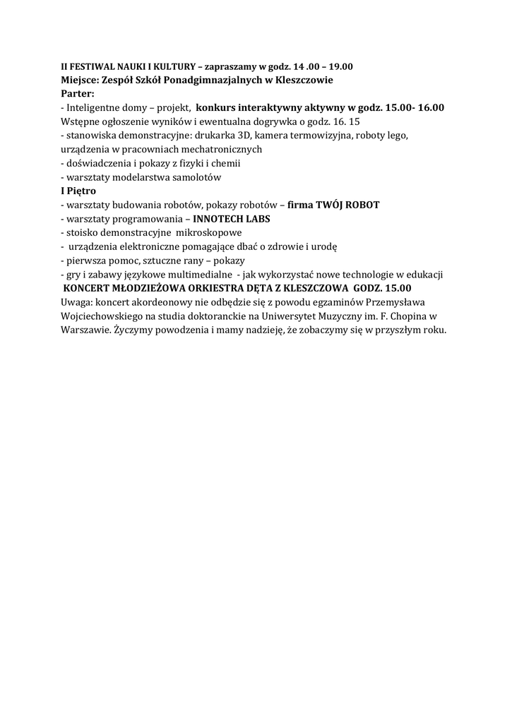 II FESTIWAL NAUKI I KULTURY – zapraszamy w godz. 14 .00 – 19.00 Miejsce: Zespół Szkół Ponadgimnazjalnych w Kleszczowie Parter: - Inteligentne domy – projekt, konkurs interaktywny aktywny w godz. 15.00- 16.00 Wstępne ogłoszenie wyników i ewentualna dogrywka o godz. 16. 15 - stanowiska demonstracyjne: drukarka 3D, kamera termowizyjna, roboty lego, urządzenia w pracowniach mechatronicznych - doświadczenia i pokazy z fizyki i chemii - warsztaty modelarstwa samolotów I Piętro - warsztaty budowania robotów, pokazy robotów – firma TWÓJ ROBOT - warsztaty programowania – INNOTECH LABS - stoisko demonstracyjne mikroskopowe - urządzenia elektroniczne pomagające dbać o zdrowie i urodę - pierwsza pomoc, sztuczne rany – pokazy - gry i zabawy językowe multimedialne - jak wykorzystać nowe technologie w edukacji KONCERT MŁODZIEŻOWA ORKIESTRA DĘTA Z KLESZCZOWA GODZ. 15.00 Uwaga: koncert akordeonowy nie odbędzie się z powodu egzaminów Przemysława Wojciechowskiego na studia doktoranckie na Uniwersytet Muzyczny im. F. Chopina w Warszawie. Życzymy powodzenia i mamy nadzieję, że zobaczymy się w przyszłym roku.