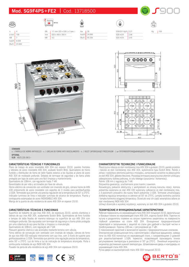 Mod. SG9F4PS+FE2 | Cod. 13718500 GN. 1/1 mm 325 x 530 ( x 3 pos. ) Kw 28 G30/G31 Kg/h 2,21 108 mm kcal/h 24.080 G20 m3/h 2,96 kW 7 kW 620 x 400 x 300 h 4,5 Btu/h 95.536 G25 m3/h 3,45 kcal/h 6.020 Btu/h 23.884 900 4 ø mm Kg 158 35 3/8” n. / 35 3 900 8” 800 31 1/2” STANDARD n. 1 PARRILLA DE HORNO ANTIVUELCO - n. 1 GRELHA DO FORNO ANTI-BASCULAMENTO - n. 1 RUSZT ZAPOBIEGAJĄCY PRZECHYŁOM - 1 шт ПРОТИВООПРОКИДЫВАЮЩАЯСЯ РЕШЕТКА OPTIONAL V3/B VOLTS 220-240 3~ CARACTERÍSTICAS TÉCNICAS Y FUNCIONALES CHARAKTERYSTYKI TECHNICZNE I FUNKCJONALNE Plano de trabajo de acero inoxidable AISI 304 con espesor 20/10, paneles frontales y laterales de acero inoxidable AISI 304, acabado Scotch Brite. Quemadores de hierro fundido y distribuidor de llama de latón fijados estanco a los líquidos al plano de acero AISI 304 de moldeado profundo. Dotados de termopar de seguridad y de llama piloto protegida por tapa de acero para una fácil limpieza y mantenimiento. Quemadores de 108mm, con regulación hasta 7 kW. Garantizados de por vida y accionados por llave de válvula. Horno eléctrico de convección con ventilador con inversión de giro, cámara horno de AISI 430 enteramente de acero inoxidable con soportes de 3 niveles para parrillas/fuentes 1/1GN. Termostato que permite una precisa regulación de la temperatura de 50° a 270°C. Indicador luminoso de línea e indicador luminoso de alcance de temperatura. Puerta y contrapuerta estampadas de acero INOXIDABLE AISI 304. Manija de la puerta de alta resistencia de acero AISI 304 en espesor 20/10. Płaszczyzna robocza ze stali nierdzewnej inox AISI 304 o grubości 20/10, panele przednie i boczne ze stali nierdzewnej inox AISI 304, wykończenie typu Scotch Brite. Palniki z żeliwa i rozdzielacz płomienia palnika z mosiądzu, zamocowane szczelnie na płaszczyźnie ze stali AISI 304, głęboko tłoczonej. Posiadają termoparę awaryjną oraz płomień pilotujący zabezpieczony stalową pokrywą, w celu łatwego czyszczenia i konserwacji. Palniki 108 mm z regulacją do 7 kW. Dożywotnia gwarancja, uruchamianie przez kranik z zaworem. Konwekcyjny piekarnik elektryczny z wentylatorem ze zmianą kierunku rotacji, komora piekarnika wykonana ze stali AISI 430 wykonany całkowicie ze stali nierdzewnej inox, z 3 poziomami prowadnic dla rusztu/ blach piekarnika 1/1GN. Termostat umożliwiający dokładną regulację temperatury w zakresie od 50° do 270°C. Lampka kontrolna zasilania i lampka kontrolna osiąganej temperatury. Drzwiczki oraz ich część wewnętrzna odlane ze stali nierdzewnej INOX AISI 304. Uchwyt drzwiczek o wysokiej rezystancji, wykonany ze stali AISI 304 o grubości 20/10. CARACTERÍSTICAS TÉCNICAS E FUNCIONAIS ТЕХНИЧЕСКИЕ И ФУНКЦИОНАЛЬНЫЕ ХАРАКТЕРИСТИКИ Superfície de trabalho de aço inox AISI 304, de espessura 20/10, painéis dianteiros e laterais de aço inox AISI 304, acabamento Scotch Brite. Queimadores de ferro fundido e tampas de latão fixados de maneira estanque na superfície de aço AISI 304 com moldagem profunda. São equipados com termopar de segurança e chama piloto protegida por uma cobertura de aço para facilitar a limpeza e a manutenção. Queimadores de 108mm, com regulação até 7 kW. Possuem garantia vitalícia e são acionados mediante torneira com válvula. Forno elétrico de convecção com ventilador com inversão de rotação, câmara do forno de aço inox AISI 430 realizada inteiramente com aço inox, com 3 níveis de suporte para grelhas/assadeiras 1/1GN. Termostato que permite uma regulação precisa da temperatura, entre 50° e 270°C. Luz de linha e luz de indicação de temperatura alcançada. Porta e contra-porta moldadas de aço INOX AISI 304. Puxador da porta de alta resistência de aço AISI 304 com espessura 20/10. Рабочая поверхность из нержавеющей стали AISI 304 толщиной 20/10, фронтальные и боковые панели из нержавеющей стали AISI 304, отделка Scotch Brite. Горелки из чугуна и разделитель пламени из латуни герметично закреплены на поверхности глубокой штамповки из стали AISI 304. Оснащенные предохранительной термопарой и запальником с защитой из стали для удобной и быстрой чистки и техобслуживания. Горелки 108 мм, с регулировкой до 7 кВт. С пожизненной гарантией и включаются краном с предохранительным клапаном. Электрическая конвекционная печь с вентилятором с обратным вращением, камера печи из AISI 430 полностью из нержавеющей стали, с направляющими 3 уровней для решеток/противней 1/1GN. термостат, позволяющий производить точное регулирование температуры в диапазоне от 50° до 270°C. Линейный индикатор и индикатор достижения нужной температуры. Штампованная дверь и контрдверь из нержавеющей стали AISI 304. Ручка двери из высокопрочной стали AISI 304 толщиной 20/10. 5