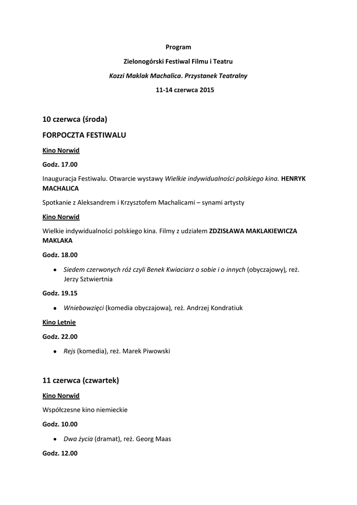 Program Zielonogórski Festiwal Filmu i Teatru Kozzi Maklak Machalica. Przystanek Teatralny 11-14 czerwca 2015 10 czerwca (środa) FORPOCZTA FESTIWALU Kino Norwid Godz. 17.00 Inauguracja Festiwalu. Otwarcie wystawy Wielkie indywidualności polskiego kina. HENRYK MACHALICA Spotkanie z Aleksandrem i Krzysztofem Machalicami – synami artysty Kino Norwid Wielkie indywidualności polskiego kina. Filmy z udziałem ZDZISŁAWA MAKLAKIEWICZA MAKLAKA Godz. 18.00 Siedem czerwonych róż czyli Benek Kwiaciarz o sobie i o innych (obyczajowy), reż. Jerzy Sztwiertnia Godz. 19.15 Wniebowzięci (komedia obyczajowa), reż. Andrzej Kondratiuk Kino Letnie Godz. 22.00 Rejs (komedia), reż. Marek Piwowski 11 czerwca (czwartek) Kino Norwid Współczesne kino niemieckie Godz. 10.00 Dwa życia (dramat), reż. Georg Maas Godz. 12.00 Między nami dobrze jest (groteska filmowa, dramat) Dorota Masłowska, reż. Grzegorz Jarzyna Café Film Godz. 16.00 Promocja książek Świat Maklaka oraz Maklak. Oczami córki. Spotkanie autorskie z córką Zdzisława Maklakiewicza MARTĄ MAKLAKIEWICZ Godz. 18.00 Promocja książki Zapomniałam o tobie. Spotkanie autorskie z GRAŻYNĄ SZAPOŁOWSKĄ Cinema Film Godz. 19.00 Debiut reżyserski Piąte: nie odchodź! (dramat obyczajowy), reż. Katarzyna Jungowska Po projekcji spotkanie z KATARZYNĄ JUNGOWSKĄ i aktorką GRAŻYNĄ SZAPOŁOWSKĄ Kino Norwid (patio) Wielkie indywidualności polskiego kina. Film z udziałem HENRYKA MACHALICY Godz. 22.00 Dzień kolibra (obyczajowy), reż. Ryszard Rydzewski 12 czerwca (piątek) Kino Norwid Współczesne kino niemieckie Godz. 10.00 Siostry i Schiller (melodramat biograficzny), reż. Dominik Graf Godz. 12.30 Jak całkowicie zniknąć (dramat), reż. Przemysław Wojcieszek Cinema Film Godz. 12.00 Grand Prix 24. FilmFestival Cottbus. Rekomendacja Festiwalu Filmowego w Cottbus Zapowiedź filmu – Bernd Buder, Dyrektor Programowy FilmFestival Cottbus Corrections Class/Klasa wyrównawcza (dramat), reż. Ivan Tverdovskij Café Film Godz. 16.00 Spotkanie z aktorem ADAMEM WORONOWICZEM Kino Zgora Godz. 17.00 Adam Woronowicz w „Braciach Karamazow”, reż. Janusz Opryński. Teatr Provisorium. Projekcja tv Sala Kolumnowa Godz. 18.00 Adam Woronowicz „Miłość” – reż. Janusz Kukuła, spektakl poetycki na podstawie wierszy ks. Jana Twardowskiego, akompaniament Janusz Strobel. Teatr Mazowiecki z Warszawy Sala Piekarnia Godz. 20.30 „Dzień dobry i do widzenia” Athol Fugard, reż. Magda Skiba. Teatr Modrzejewskiej z Legnicy Cinema Film Godz. 22.00 Służby specjalne (sensacyjny), reż. Patryk Vega 13 czerwca (sobota) Kino Norwid Godz. 11.00 Zapowiedź filmu – aktorka Anna Haba Kebab i Horoskop (dramat, komedia), reż. Grzegorz Jaroszuk Współczesne kino niemieckie Godz. 13.00 Wilgotne miejsca (dramat, komedia), reż. David Wnendt Cinema Film Godz. 16.00 Body/Ciało (dramat), reż. Małgorzata Szumowska. Srebrny Niedźwiedź 65. Międzynarodowego Festiwalu Filmowego Berlinale 2015. Nagroda główna w konkursie filmu polskiego PKO OFF Camera Kraków 2015 Café Film Godz. 15.00 Promocja książki Zwierzenia kontestatora. Spotkanie autorskie z MARKIEM PIEKARCZYKIEM Kino Zgora Wielkie indywidualności polskiego kina. Film z udziałem MACIEJA KOZŁOWSKIEGO KOZZI Godz. 15.30 Balanga (dramat), reż. Łukasz Wylężałek Sala Piekarnia Godz. 17.00 Koncert MAREK PIEKARCZYK „Akustycznie” Kino Norwid Godz. 20.00 Fotograf (thriller sensacyjny), reż. Waldemar Krzystek Cinema Film Godz. 22.00 Carte Blanche (dramat obyczajowy), reż. Jacek Lusiński 14 czerwca (niedziela) Kino Norwid Godz. 11.00 Onirica (dramat), reż. Lech Majewski Godz. 13.00 Jeziorak (dramat kryminalny), reż. Michał Otłowski Współczesne kino niemieckie Godz. 15.00 Między światami (dramat), reż. Feo Aladag Café Film Godz. 12.00 Promocja książki 07 zgłasza się. Spotkanie z BRONISŁAWEM CIEŚLAKIEM i autorem książki PIOTREM K. PIOTROWSKIM Kino Zgora Wielkie indywidualności polskiego kina. Filmy z udziałem HENRYKA MACHALICY Godz. 17.00 Klucznik (dramat psychologiczny), reż. Wojciech Marczewski Godz. 18.30 Rajska jabłoń (obyczajowy dramat psychologiczny), reż. Barbara Sass-Zdort Kino Norwid Godz. 16.00 JOANNA SZCZEPKOWSKA – monodram „Goła Baba”, reż. Agnieszka Glińska Café Film Godz. 17.45 Promocja książek Kto ty jesteś oraz Kto ty jesteś. Tom 2. Wygrasz jak przegrasz. Spotkanie autorskie z JOANNĄ SZCZEPKOWSKĄ Sala Kolumnowa Godz. 19.00 Gala Festiwalowa ze specjalnym udziałem ANDRZEJA PONIEDZIELSKIEGO Kino Norwid Godz. 21.00 WOJCIECH PSZONIAK – monodram „Belfer” Jean-Pierre Dopagne, reż. Michał Kwieciński Kino Norwid (patio) Godz. 22.30 Recital LECHA DYBLIKA „Towarzysze czas wstawać!” Cinema Film Godz. 22.00 Bogowie (dramat biograficzny), reż. Łukasz Palkowski. Grand Prix „Złote Lwy” Gdynia Film Festival 2014. Polskie Nagrody Filmowe 2015: siedem „Orłów”, w tym dla najlepszego filmu, za reżyserię, dla aktora pierwszo- i drugoplanowego oraz „Orzeł Publiczności” Miejsca prezentacji Kino Norwid Sala Dębowa WiMBP Kino Zgora Mediateka Góra Mediów WiMBP Café Film Deptak/Pomnik Bachusa Sala Kolumnowa Urząd Marszałkowski Kino Letnie Wzgórze Winne/Palmiarnia Cinema Film Cinema City/Galeria Focus Sala Piekarnia Piekarnia Cichej Kobiety, ul. Fabryczna 13 Klub Festiwalowy: Galeria u Jadźki NA WSZYSTKIE WYDARZENIA FESTIWALOWE OBOWIĄZUJĄ BEZPŁATNE WEJŚCIÓWKI DOSTĘPNE W HOLU BIBLIOTEKI IM. NORWIDA WWW.FESTIWAL.ZGORA.PL