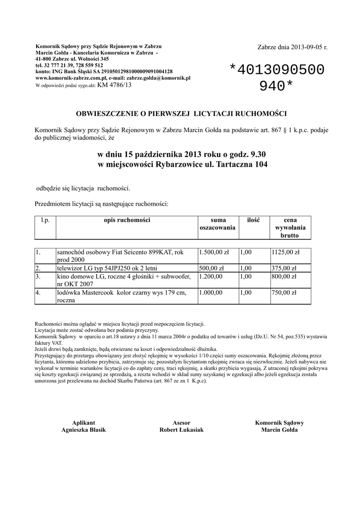 Komornik Sądowy przy Sądzie Rejonowym w Zabrzu Marcin Gołda - Kancelaria Komornicza w Zabrzu 41-800 Zabrze ul. Wolności 345 tel. 32 777 21 39, 728 559 512 konto: ING Bank Śląski SA 29105012981000009091004128 www.komornik-zabrze.com.pl, e-mail: [email protected] W odpowiedzi podać sygn.akt: KM Zabrze dnia 2013-09-05 r. *4013090500 940* 4786/13 OBWIESZCZENIE O PIERWSZEJ LICYTACJI RUCHOMOŚCI Komornik Sądowy przy Sądzie Rejonowym w Zabrzu Marcin Gołda na podstawie art. 867 § 1 k.p.c. podaje do publicznej wiadomości, że w dniu 15 października 2013 roku o godz. 9.30 w miejscowości Rybarzowice ul. Tartaczna 104 odbędzie się licytacja ruchomości. Przedmiotem licytacji są następujące ruchomości: l.p. 1. 2. 3. 4. opis ruchomości suma oszacowania samochód osobowy Fiat Seicento 899KAT, rok prod 2000 telewizor LG typ 54JPJ250 ok 2 letni kino domowe LG, roczne 4 głośniki + subwoofer, nr OKT 2007 lodówka Mastercook kolor czarny wys 179 cm, roczna ilość cena wywołania brutto 1.500,00 zł 1,00 1125,00 zł 500,00 zł 1.200,00 1,00 1,00 375,00 zł 800,00 zł 1.000,00 1,00 750,00 zł Ruchomości można oglądać w miejscu licytacji przed rozpoczęciem licytacji. Licytacja może zostać odwołana bez podania przyczyny. Komornik Sądowy w oparciu o art.18 ustawy z dnia 11 marca 2004r o podatku od towarów i usług (Dz.U. Nr 54, poz.535) wystawia faktury VAT. Jeżeli drzwi będą zamknięte, będą otwierane na koszt i odpowiedzialność dłużnika. Przystępujący do przetargu obowiązany jest złożyć rękojmię w wysokości 1/10 części sumy oszacowania. Rękojmię złożoną przez licytanta, któremu udzielono przybicia, zatrzymuje się; pozostałym licytantom rękojmię zwraca się niezwłocznie. Jeżeli nabywca nie wykonał w terminie warunków licytacji co do zapłaty ceny, traci rękojmię, a skutki przybicia wygasają. Z utraconej rękojmi pokrywa się koszty egzekucji związanej ze sprzedażą, a reszta wchodzi w skład sumy uzyskanej w egzekucji albo jeżeli egzekucja została umorzona jest przelewana na dochód Skarbu Państwa (art. 867 ze zn 1 K.p.c). Aplikant Agnieszka Błasik Asesor Robert Łukasiak Komornik Sądowy Marcin Gołda