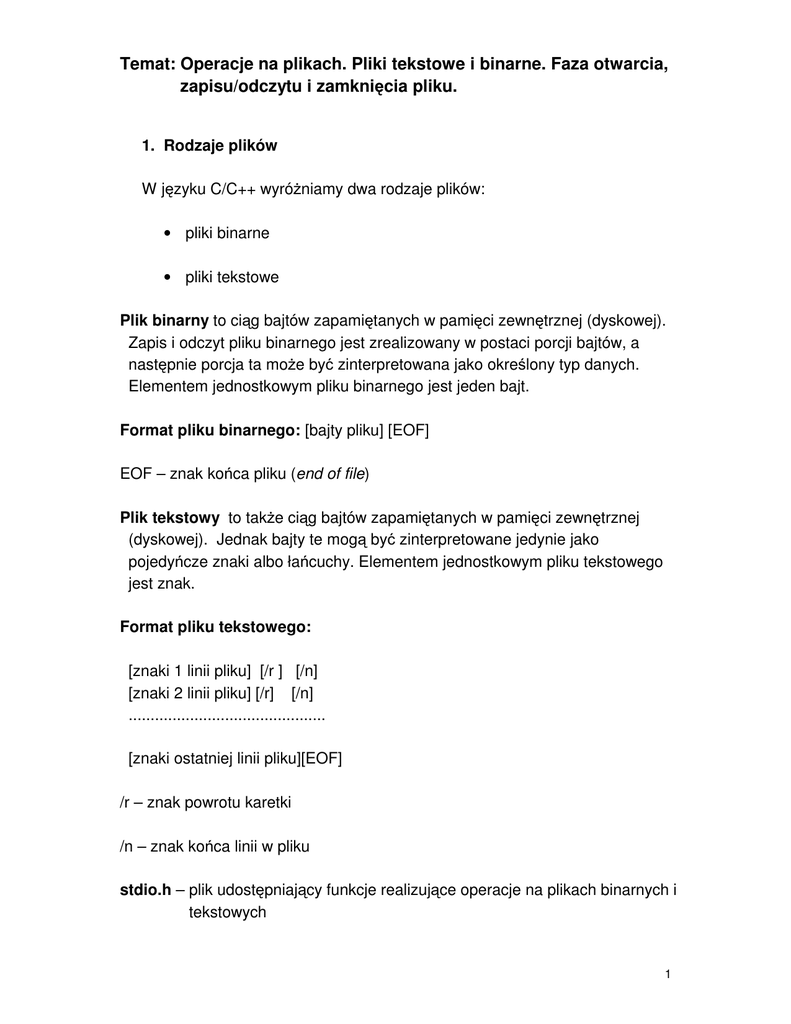 Temat: Operacje na plikach. Pliki tekstowe i binarne. Faza otwarcia