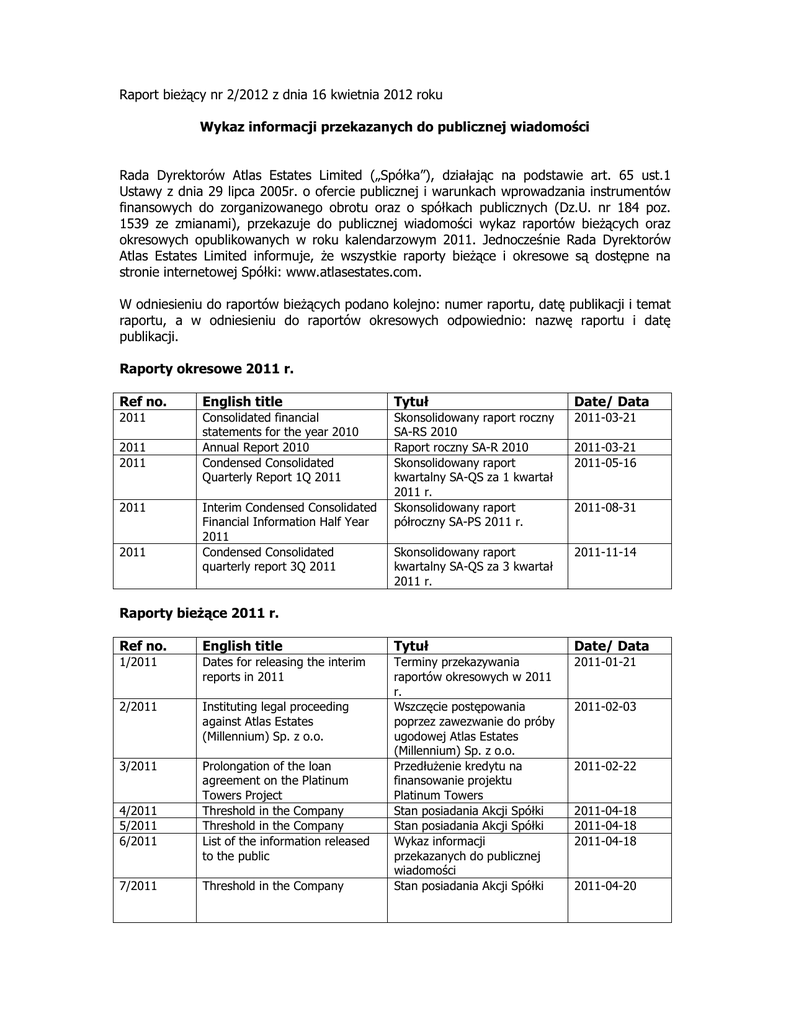 Raport bieŜący nr 2/2012 z dnia 16 kwietnia 2012 roku Wykaz informacji przekazanych do publicznej wiadomości Rada Dyrektorów Atlas Estates Limited („Spółka”), działając na podstawie art. 65 ust.1 Ustawy z dnia 29 lipca 2005r. o ofercie publicznej i warunkach wprowadzania instrumentów finansowych do zorganizowanego obrotu oraz o spółkach publicznych (Dz.U. nr 184 poz. 1539 ze zmianami), przekazuje do publicznej wiadomości wykaz raportów bieŜących oraz okresowych opublikowanych w roku kalendarzowym 2011. Jednocześnie Rada Dyrektorów Atlas Estates Limited informuje, Ŝe wszystkie raporty bieŜące i okresowe są dostępne na stronie internetowej Spółki: www.atlasestates.com. W odniesieniu do raportów bieŜących podano kolejno: numer raportu, datę publikacji i temat raportu, a w odniesieniu do raportów okresowych odpowiednio: nazwę raportu i datę publikacji. Raporty okresowe 2011 r. Ref no. English title Tytuł Date/ Data 2011 Consolidated financial statements for the year 2010 Annual Report 2010 Condensed Consolidated Quarterly Report 1Q 2011 Skonsolidowany raport roczny SA-RS 2010 Raport roczny SA-R 2010 Skonsolidowany raport kwartalny SA-QS za 1 kwartał 2011 r. Skonsolidowany raport półroczny SA-PS 2011 r. 2011-03-21 Skonsolidowany raport kwartalny SA-QS za 3 kwartał 2011 r. 2011-11-14 2011 2011 2011 2011 Interim Condensed Consolidated Financial Information Half Year 2011 Condensed Consolidated quarterly report 3Q 2011 2011-03-21 2011-05-16 2011-08-31 Raporty bieŜące 2011 r. Ref no. English title Tytuł Date/ Data 1/2011 Dates for releasing the interim reports in 2011 2011-01-21 2/2011 Instituting legal proceeding against Atlas Estates (Millennium) Sp. z o.o. 3/2011 Prolongation of the loan agreement on the Platinum Towers Project Threshold in the Company Threshold in the Company List of the information released to the public Terminy przekazywania raportów okresowych w 2011 r. Wszczęcie postępowania poprzez zawezwanie do próby ugodowej Atlas Estates (Millennium) Sp. z o.o. PrzedłuŜenie kredytu na finansowanie projektu Platinum Towers Stan posiadania Akcji Spółki Stan posiadania Akcji Spółki Wykaz informacji przekazanych do publicznej wiadomości Stan posiadania Akcji Spółki 4/2011 5/2011 6/2011 7/2011 Threshold in the Company 2011-02-03 2011-02-22 2011-04-18 2011-04-18 2011-04-18 2011-04-20 8/2011 Instituting legal proceeding against Atlas Estates Investment B.V. and Atlas Estates Limited 9/2011 Notice of Annual General Meeting and Annual Report and Accounts 10/2011 Result of Annual General Meeting held on 15 June 2011 11/2011 List of the shareholders possessing at least 5% of the votes on the Annual General Meeting dated 15 June 2011 Update on sale of Slovakian portfolio 12/2011 13/2011 Update on sale of Slovakian portfolio 14/2011 Execution of a general contractor agreement with Unibep S.A. (material agreement) Material loan agreement with Bank Polska Kasa Opieki S.A. and the establishment of a mortgage on material assets 15/2011 15/2011 Material loan agreement with Bank Polska Kasa Opieki S.A. and the establishment of a mortgage on material assets 16/2011 17/2011 Transaction on Company Shares Material loan agreement with Bank Zachodni WBK S.A. and the establishment of a mortgage on material assets 17/2011 Correction of current report regarding material loan agreement with Bank Zachodni WBK S.A. and the establishment of a mortgage on material assets 17/2011 Correction of current report regarding material loan agreement with Bank Zachodni WBK S.A. and the establishment of a mortgage on material assets Wszczęcie postępowania prawnego przeciwko Atlas Estates Investment B.V. oraz Atlas Estates Limited Informacja o Walnym Zgromadzeniu Akcjonariuszy oraz Rocznym Sprawozdaniu Finansowym Zwyczajne Walne Zgromadzenie zwołane na 15 czerwca 2011 r. – podjęte uchwały Powołanie nowych dyrektorów Wykaz akcjonariuszy posiadających co najmniej 5% liczby głosów na WZA w dniu 15 czerwca 2011 r. Aktualizacja dotycząca sprzedaŜy słowackiego portfolio Aktualizacja dotycząca sprzedaŜy słowackiego portfolio Znacząca umowa o generalne wykonawstwo z Unibep S.A. 2011-05-05 Znacząca umowa kredytowa zawarta z Bankiem Polska Kasa Opieki S.A. oraz ustanowienie hipoteki na aktywach o znacznej wartości Korekta raportu bieŜącego dotycząca znaczącej umowy kredytowej zawartej z Bankiem Polska Kasa Opieki S.A. oraz ustanowienia hipoteki na aktywach o znacznej wartości Transakcja na akcjach Spółki Znacząca umowa kredytowa zawarta z Bankiem Zachodnim WBK S.A. oraz ustanowienie hipoteki na aktywach o znacznej wartości Korekta raportu bieŜącego dotycząca znaczącej umowy kredytowej zawartej z Bankiem Zachodnim WBK S.A. oraz ustanowienia hipoteki na aktywach o znacznej wartości Korekta raportu bieŜącego dotycząca znaczącej umowy kredytowej zawartej z Bankiem Zachodnim WBK S.A. oraz ustanowienia hipoteki na aktywach o znacznej wartości 2011-07-30 2011-05-23 2011-06-16 2011-06-16 2011-06-22 2011-07-27 2011-07-28 2011-07-30 2011-09-26 2011-11-03 2011-11-03 2011-11-03 17/2011 Correction of current report regarding material loan agreement with Bank Zachodni WBK S.A. and the establishment of a mortgage on material assets 17/2011 Current report No. 17/2011, published on 03.11.2011 18/2011 Information on the appointment of the auditor of financial statements of Atlas Estates Limited Korekta raportu bieŜącego dotycząca znaczącej umowy kredytowej zawartej z Bankiem Zachodnim WBK S.A. oraz ustanowienia hipoteki na aktywach o znacznej wartości Korekta raportu bieŜącego dotycząca znaczącej umowy kredytowej zawartej z Bankiem Zachodnim WBK S.A. oraz ustanowienia hipoteki na aktywach o znacznej wartości Informacja o wyborze podmiotu uprawnionego do badania sprawozdań finansowych Spółki Atlas Estates Limited 2011-11-03 2011-11-09 2011-12-15 Podstawa prawna: art.65 ust.1 ustawy z dnia 29 lipca 2005 r. o ofercie publicznej i warunkach wprowadzania
