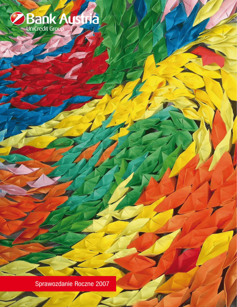 Sprawozdanie Roczne 2007 Doznanie sztuki Pod względem działalności kulturalnych rok 2007 był międzynarodowo znaczącym rokiem: Przyniósł ze sobą intensywną debatę nad sztuką we wszystkich krajach, w których działamy. Jesteśmy zdania, że kultura przyczynia się długofalowo do tworzenia znaczących wartości i wspierania nowych pomysłów. Nowe pomysły są istotne dla innowacji i zrównoważonego rozwoju w gospodarce i społeczeństwie. W sprawozdaniu za rok 2007 pokazujemy zamiast pojedynczych dzieł z naszych zbiorów, obrazy z imprez międzynarodowych jako część naszej pracy z ważnymi partnerami w zakresie sztuki i kultury. Wyróżnić należy wśród nich imprezy, przeprowadzone wspólnie z mieszczącym się w Castello di Rivoli muzeum sztuki współczesnej. W ramach tych inicjatyw, ze sztuką zetknąć się może szeroki krąg publiczności. Wyraża się w tym również znaczenie, jakie UniCredit Group przypisuje wspieraniu aktywnego dialogu z miastami i gminami, w których nasza Grupa wykonuje swoją działalność. Place miast i muzea są miejscami spotkań tysięcy ludzi. Obrazy w niniejszym sprawozdaniu pokazują spontaniczną wymowność tysiąca rąk, łączących się w pełną radości, kreatywną wspólność. Kontakt z międzynarodowymi artystami i ważnymi protektorami kultury w otoczeniu różnych języków, stylów i technik pozwala rozpoznać, jak bardzo sztuka pobudza rozwój umiejętności międzyludzkich, kompetencji spostrzegania i indywidualnego potencjału. Sztuka uwidacznia jednak przede wszystkim znaczącą pozytywną energię, mogącą łączyć ludzi, przezwyciężać różnice i wspierać dialog. Sztuka oferuje liczne możliwości uczenia się, badania i eksperymentowania, a także interpretowania rzeczywistości, w celu kształtowania z tego przyszłości. Sztuka przybliża ludzi do siebie. Dlatego twierdzimy, że: SZTUKA ŁĄCZY. Sprawozdanie Roczne 2007 Bank Austria Creditanstalt w przekroju Wskaźniki sukcesu Wynik z tytułu odsetek Wynik z tytułu prowizji Wynik handlowy Przychody z tytułu działalności operacyjnej Koszty działalności operacyjnej Wynik na działalności operacyjnej Zysk brutto z działalności Zysk netto na koniec okresu bez udziałów mniejszości (mln €) 2007 2006 +/– 3.936 2.124 141 6.414 – 3.346 3.069 2.745 2.258 2.681 1.667 348 4.762 – 2.757 2.005 3.272 3.022 46,8% 27,4 % – 59,6 % 34,7 % 21,4 % 53,0 % – 16,1 % – 25,3 % 1) 1) 1) W rachunku zysków i strat za rok 2006 zawarte zostały efekty jednorazowe w wys. 1.758 mln €. (Zyski ze sprzedaży 2.267 mln €, dopasowanie odpisów na utratę wartości 278 mln €, koszty integracji 231 mln €) Wartości wolumenów Suma bilansowa Należności od klientów Środki podstawowe Kapitał własny (bez udziałów mniejszości) Aktywa ważone ryzykiem (portfel bankowy) (mln €) 31.12. 2007 31.12. 2006 +/– 209.170 115.341 119.699 14.676 110.418 154.255 80.104 80.316 9.927 73.136 35,6 % 44,0 % 49,0 % 47,8 % 51,0 % 2007 2006 2) 17,0 % 1,18 % 48,9 % 52,2 % 4,08 % 12,3 % 0,50 % 11,4 % 8,8 % 15,8 % 0,70 % 44,9 % 57,9 % 3,50 % 14,9 % 0,52 % 14,7 % 11,6 % 31.12. 2007 31.12. 2006 +/– 54.387 43.648 10.739 21.087 8.973 12.114 157,9 % 386,4 % – 11,4 % 31.12. 2007 31.12. 2006 +/– 2.343 1.977 366 1.070 681 389 119,0 % 190,3 % – 5,9 % Wskaźniki Wskaźnik rentowności kapitału netto (ROE netto) Wskaźnik rentowności aktywów (ROA) Udział EŚW w zysku brutto z działalności Wskaźnik koszty / dochody (Cost / Income-Ratio) Wynik z tytułu odsetek / Ø aktywa ważone ryzykiem (portfel bankowy) Odpisy na utratę wartości / Wynik z tytułu odsetek (Risk / Earnings-Ratio) Odpisy na utratę wartości / Ø aktywa ważone ryzykiem (portfel bankowy) Wskaźnik kapitału całkowitego Wskaźnik kapitału podstawowego 2) Po skorygowaniu o efekty jednorazowe Pracownicy Bank Austria Creditanstalt (w osobolatach) CEE Austria i inne spółki zależne Placówki Bank Austria Creditanstalt CEE Austria i inne spółki zależne 2 Sprawozdanie Roczne 2007 · Bank Austria Spis treści Wprowadzenie Profil przedsiębiorstwa UniCredit Group 5 6 Strategia, wyniki i model działalności Posłanie – Alessandro Profumo Posłanie – Erich Hampel Rozwój i strategia Banku Austria Zakresy działalności w Bank Austria Pion Retail Pion Private Banking & Asset Management Pion Corporates Pion Markets & Investment Banking Pion Europa Środkowo-Wschodnia Pion Global Banking Services Human Resources i Corporate Social Responsibility Human Resources Zrównoważona gospodarka Financial Statements – Raport o sytuacji Grupy 107 Otoczenie działalności bankowej w roku 2007 Raport o sytuacji Grupy w roku 2007 Banku Austria Creditanstalt Financial Statements – Skonsolidowane Sprawozdanie Finansowe wg MSSF Spis treści RZiS, Bilans Kapitał własny Rachunek przepływów pieniężnych Dane objaśniające (Noty) do Skonsolidowanego Sprawozdania Finansowego łącznie z Raportem dotyczącym ryzyka Uwaga końcowa Zarządu Raport biegłych rewidentów Raport Rady Nadzorczej 19 20 22 24 36 38 44 50 56 62 86 93 94 100 108 *) 110 133 133 134 136 137 139 207 208 210 Ład korporacyjny (Corporate Governance), Oświadczenie przedstawicieli ustawowych i Organy BA-CA Ład korporacyjny Skonsolidowane Sprawozdanie Finansowe 2007 Grupy BA-CA Oświadczenie przedstawicieli ustawowych Organy Banku Austria Creditanstalt Rada Nadzorcza Zarząd Komisje Rady Nadzorczej 217 218 218 219 219 Dane uzupełniające RZiS w pełni skonsolidowanych Banków zależnych Glosariusz Oddziały Relacje Inwestorskie, Impressum, Uwagi 221 222 224 230 234 213 214 *) Część składowa Sprawozdania Finansowego zgodnie z MSSF Bank Austria · Sprawozdanie Roczne 2007 3 Wprowadzenie UniCredit Group – Profil przedsiębiorstwa Bank Austria · Sprawozdanie Roczne 2007 6 5 Wprowadzenie UniCredit Group – Profil przedsiębiorstwa Wajątkowa pozycja rynkowa w przeglądzie Highlights UniCredit Group jest jednym z wielkich międzynarodowych usłu