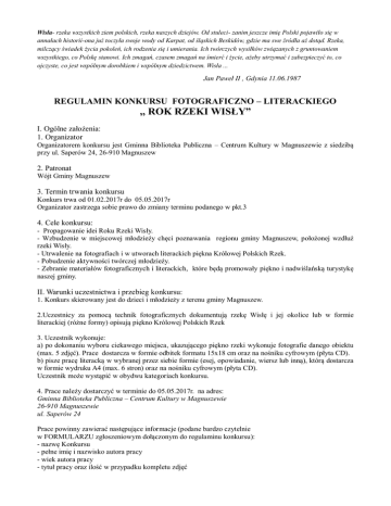 Wisła- rzeka wszystkich ziem polskich, rzeka naszych dziejów. Od stuleci- zanim jeszcze imię Polski pojawiło się w annałach historii-ona już toczyła swoje wody od Karpat, od śląskich Beskidów, gdzie ma swe źródła aż dotąd. Rzeka, milczący świadek życia pokoleń, ich rodzenia się i umierania. Ich twórczych wysiłków związanych z gruntowaniem wszystkiego, co Polskę stanowi. Ich zmagań, czasem zmagań na śmierć i życie, ażeby utrzymać i zabezpieczyć to, co ojczyste, co jest wspólnym dorobkiem i wspólnym dziedzictwem. Wisła ... Jan Paweł II , Gdynia 11.06.1987 REGULAMIN KONKURSU FOTOGRAFICZNO – LITERACKIEGO ,, ROK RZEKI WISŁY” I. Ogólne założenia: 1. Organizator Organizatorem konkursu jest Gminna Biblioteka Publiczna – Centrum Kultury w Magnuszewie z siedzibą przy ul. Saperów 24, 26-910 Magnuszew 2. Patronat Wójt Gminy Magnuszew 3. Termin trwania konkursu Konkurs trwa od 01.02.2017r do 05.05.2017r Organizator zastrzega sobie prawo do zmiany terminu podanego w pkt.3 4. Cele konkursu: - Propagowanie idei Roku Rzeki Wisły. - Wzbudzenie w miejscowej młodzieży chęci poznawania regionu gminy Magnuszew, położonej wzdłuż rzeki Wisły. - Utrwalenie na fotografiach i w utworach literackich piękna Królowej Polskich Rzek. - Pobudzenie aktywności twórczej młodzieży. - Zebranie materiałów fotograficznych i literackich, które będą promowały piękno i nadwiślańską turystykę naszej gminy. II. Warunki uczestnictwa i przebieg konkursu: 1. Konkurs skierowany jest do dzieci i młodzieży z terenu gminy Magnuszew. 2.Uczestnicy za pomocą technik fotograficznych dokumentują rzekę Wisłę i jej okolice lub w formie literackiej (różne formy) opisują piękno Królowej Polskich Rzek 3. Uczestnik wykonuje: a) po dokonaniu wyboru ciekawego miejsca, ukazującego piękno rzeki wykonuje fotografie danego obiektu (max. 5 zdjęć). Prace dostarcza w formie odbitek formatu 15x18 cm oraz na nośniku cyfrowym (płyta CD). b) pisze pracę literacką w wybranej przez siebie formie (esej, opowiadanie, wiersz lub inną), którą dostarcza w formie wydruku A4 (max. 6 stron) oraz na nośniku cyfrowym (płyta CD). Uczestnik może wystąpić w obydwu kategoriach konkursu. 4. Prace należy dostarczyć w terminie do 05.05.2017r. na adres: Gminna Biblioteka Publiczna – Centrum Kultury w Magnuszewie 26-910 Magnuszewie ul. Saperów 24 Prace powinny zawierać następujące informacje (podane bardzo czytelnie w FORMULARZU zgłoszeniowym dołączonym do regulaminu konkursu): - nazwę Konkursu - pełne imię i nazwisko autora pracy - wiek autora pracy - tytuł pracy oraz ilość w przypadku kompletu zdjęć - nazwa i adres szkoły, bądź placówki kierującej prace na Konkurs - adres mailowy lub telefon uczestnika bądź nauczyciela prowadzącego Uczestnik powinien dostarczyć: wypełniony formularz, pracę literacką w formie papierowej lub wywołanej fotografii (prace należy podpisać, a w przypadku zdjęcia opisać miejsce, które ono przedstawia) oraz płytę CD z zapisem pracy literackiej bądź fotograficznej. 5. Koszty wykonania oraz dostarczenia prac ponosi uczestnik konkursu. Osoby, które nie ukończyły 18 lat, mogą wziąć udział w konkursie za zgodą rodziców lub innych opiekunów prawnych. Zgodę tę rodzice bądź opiekunowie wyrażają podpisując formularz zgłoszeniowy do uczestnictwa w konkursie. 6. Kategorie i kryteria oceny prac: Prace będą oceniane przez pięcioosobowe jury wybrane przez Organizatora, w skład którego będzie wchodzić polonista oraz fotograf. Klasyfikacja kategorii ze względu na technikę uwzględnia dwie grupy: kategorię literacką oraz kategorię fotograficzną. Przy ocenie prac będą brane pod uwagę: Dla prac literackich: zgodność pracy pisemnej z tematem założonym przez organizatora, poprawność językowa i ciekawe ujęcie tematu , zgodność z wymogami Regulaminu . Dla prac fotograficznych: zgodność pracy fotograficznej z tematem założonym przez organizatora, jakość techniczna, artyzm i ciekawe ujęcie fotografowanego motywu, zgodność z wymogami Regulaminu. Najlepsze prace zostaną nagrodzone w dwóch kategoriach: - literackiej - fotograficznej Wszyscy uczestnicy konkursu wezmą udział w warsztatach fotograficznych prowadzonych przez profesjonalnego fotografa zorganizowanych przez Gminnej Biblioteki Publicznej – Centrum Kultury w Magnuszewie. Wyniki konkursu zostaną ogłoszone w I połowie maja 2017r. Po zakończeniu konkursu zostanie zorganizowana wystawa pokonkursowa nadesłanych prac. Nagrodzone prace literackie i fotograficzne zostaną opublikowane na stronie internetowej Gminnej Biblioteki Publicznej – Centrum Kultury w Magnuszewie. Organizator zastrzega sobie prawo do niezakwalifikowania prac nie spełniających warunków Regulaminu . III. Postanowienia końcowe: 1. Prace nadesłane na konkurs przechodzą na własność Gminnej Biblioteki Publicznej – Centrum Kultury w Magnuszewie. 2. Dane Uczestników konkursu będą chronione zgodnie z Ustawą o Ochronie Danych Osobowych (DZ. U. Nr 133/97, poz. 883). Uczestnikom konkursu przysługuje prawo dostępu do treści swoich danych oraz ich poprawiania, w tym celu powinni skontaktować się oni z Organizatorem, który jest administratorem danych w rozumieniu Ustawy o Ochronie Danych Osobowych (DZ. U. Nr 133/97, poz. 883). Podanie danych jest dobrowolne, lecz konieczne do wzięcia udziału w konkursie . KARTA ZGŁOSZENIA DO KONKURSU FOTOGRAFICZNO – LITERACKIEGO ,, ROK RZEKI WISŁY” Imię i nazwisko opiekuna Adres zamieszkania Imię i nazwisko uczestnika konkursu wiek E-mail, telefon Tytuł oraz liczba zgłoszonych prac Nazwa i adres szkoły, bądź placówki kierującej prace na konkurs Wyrażam zgodę na udział mojego podopiecznego/dziecka Imię i nazwisko: ................................................na udział w konkursie fotograficzno-literackim „Rok rzeki Wisły” ................................................ data i miejsco