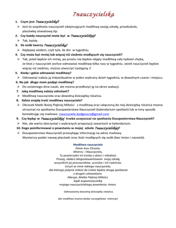 7nauczycielska 1. Czym jest 7nauczycielska? Jest to wspólnota nauczycieli obejmujących modlitwą swoją szkołę, przedszkole, placówkę oświatową itp. 2. Czy każdy nauczyciel może być w 7nauczycielskiej? Tak, każdy. 3. Ile osób tworzy 7nauczycielską? Najlepiej siedem, czyli tyle, ile dni w tygodniu. 4. Czy może być mniej lub więcej niż siedmiu modlących się nauczycieli? Tak, jeżeli będzie ich mniej, po prostu nie będzie objęty modlitwą cały tydzień chyba, że ktoś z nauczycieli zechce odmawiać modlitwę kilka razy w tygodniu. Jeżeli nauczycieli będzie więcej niż siedmiu, można utworzyć następną 7. 5. Kiedy i gdzie odmawiać modlitwę? Odmawiać należy ją indywidualnie w jeden wybrany dzień tygodnia, w dowolnym czasie i miejscu. 6. Na jak długo mam podjąć modlitwę? Do ostatniego dnia nauki, ale można przedłużyć ją na okres wakacji. 7. Jaką modlitwę należy odmówić? Modlitwę nauczyciela oraz dowolną dziesiątkę różańca. 8. Gdzie znajdę treść modlitwy nauczyciela? Obrazek Matki Bożej Pięknej Miłości z modlitwą oraz załączoną do niej dziesiątką różańca można otrzymać na spotkaniu Duszpasterstwa Nauczycieli (kalendarium spotkań) lub w inny sposób kontaktując się mailowo: [email protected] 9. Czy będąc w 7nauczycielskiej trzeba uczęszczać na spotkania Duszpasterstwa Nauczycieli? Nie, ale warto skorzystać z wybranych propozycji zawartych w kalendarium. 10. Kogo poinformować o powstaniu w mojej szkole 7nauczycielskiej? Duszpasterstwo Nauczycieli przesyłając informację na adres mailowy. Wystarczy podać nazwę placówki oraz ilość modlących się osób (bez imion i nazwisk). Modlitwa nauczyciela Panie Jezu Chryste, Mistrzu i Nauczycielu, Ty powierzyłeś mi troskę o dzieci i młodzież. Proszę, obdarz błogosławieństwem moją szkołę, wszystkich jej pracowników, uczniów i ich rodziców. Uczyń ze mnie takiego nauczyciela, dla którego jedynie miłość do Ciebie będzie drogą spotkania z drugim człowiekiem. Maryjo, Matko Pięknej Miłości, bądź wspomożycielką mojego nauczycielskiego powołania. Amen. Odmawiamy dowolną dziesiątkę różańca. (do modlitwy można dodać szczegółowe intencje)