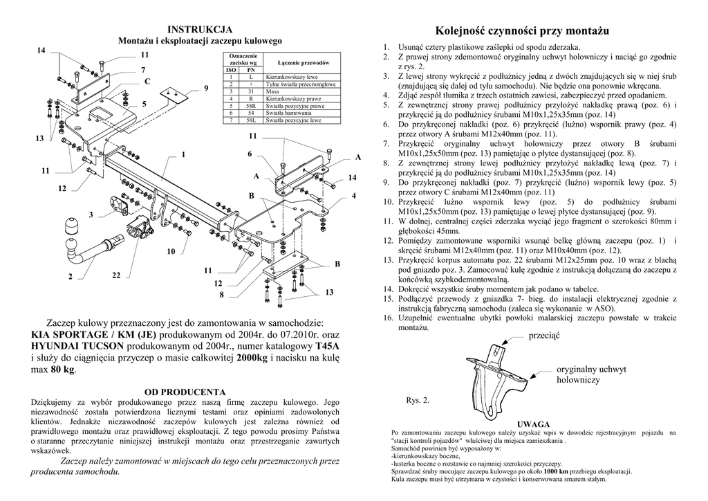 INSTRUKCJA Kolejność czynności przy montaŜu MontaŜu i eksploatacji zaczepu kulowego 14 11 7 C Oznaczenie zacisku wg ISO PN 1 L 2 + 3 31 4 R 5 58R 6 54 7 58L 9 5 1. 2. Łączenie przewodów 3. Kierunkowskazy lewe Tylne światła przeciwmgłowe Masa Kierunkowskazy prawe Światła pozycyjne prawe Światła hamowania Światła pozycyjne lewe 4. 5. 6. 11 13 7. 6 1 11 A A 12 14 4 B 3 8. 9. 10. 11. 12. 10 2 22 B 11 12 8 13 Zaczep kulowy przeznaczony jest do zamontowania w samochodzie: KIA SPORTAGE / KM (JE) produkowanym od 2004r. do 07.2010r. oraz HYUNDAI TUCSON produkowanym od 2004r., numer katalogowy T45A i słuŜy do ciągnięcia przyczep o masie całkowitej 2000kg i nacisku na kulę max 80 kg. 13. 14. 15. 16. Usunąć cztery plastikowe zaślepki od spodu zderzaka. Z prawej strony zdemontować oryginalny uchwyt holowniczy i naciąć go zgodnie z rys. 2. Z lewej strony wykręcić z podłuŜnicy jedną z dwóch znajdujących się w niej śrub (znajdującą się dalej od tyłu samochodu). Nie będzie ona ponownie wkręcana. Zdjąć zespół tłumika z trzech ostatnich zawiesi, zabezpieczyć przed opadaniem. Z zewnętrznej strony prawej podłuŜnicy przyłoŜyć nakładkę prawą (poz. 6) i przykręcić ją do podłuŜnicy śrubami M10x1,25x35mm (poz. 14) Do przykręconej nakładki (poz. 6) przykręcić (luźno) wspornik prawy (poz. 4) przez otwory A śrubami M12x40mm (poz. 11). Przykręcić oryginalny uchwyt holowniczy przez otwory B śrubami M10x1,25x50mm (poz. 13) pamiętając o płytce dystansującej (poz. 8). Z zewnętrznej strony lewej podłuŜnicy przyłoŜyć nakładkę lewą (poz. 7) i przykręcić ją do podłuŜnicy śrubami M10x1,25x35mm (poz. 14) Do przykręconej nakładki (poz. 7) przykręcić (luźno) wspornik lewy (poz. 5) przez otwory C śrubami M12x40mm (poz. 11) Przykręcić luźno wspornik lewy (poz. 5) do podłuŜnicy śrubami M10x1,25x50mm (poz. 13) pamiętając o lewej płytce dystansującej (poz. 9). W dolnej, centralnej części zderzaka wyciąć jego fragment o szerokości 80mm i głębokości 45mm. Pomiędzy zamontowane wsporniki wsunąć belkę główną zaczepu (poz. 1) i skręcić śrubami M12x40mm (poz. 11) oraz M10x40mm (poz. 12). Przykręcić korpus automatu poz. 22 śrubami M12x25mm poz. 10 wraz z blachą pod gniazdo poz. 3. Zamocować kulę zgodnie z instrukcją dołączaną do zaczepu z końcówką szybkodemontowalną. Dokręcić wszystkie śruby momentem jak podano w tabelce. Podłączyć przewody z gniazdka 7- bieg. do instalacji elektrycznej zgodnie z instrukcją fabryczną samochodu (zaleca się wykonanie w ASO). Uzupełnić ewentualne ubytki powłoki malarskiej zaczepu powstałe w trakcie montaŜu. przeciąć oryginalny uchwyt holowniczy OD PRODUCENTA Dziękujemy za wybór produkowanego przez naszą firmę zaczepu kulowego. Jego niezawodność została potwierdzona licznymi testami oraz opiniami zadowolonych klientów. JednakŜe niezawodność zaczepów kulowych jest zaleŜna równieŜ od prawidłowego montaŜu oraz prawidłowej eksploatacji. Z tego powodu prosimy Państwa o staranne przeczytanie niniejszej instrukcji montaŜu oraz przestrzeganie zawartych wskazówek. Zaczep naleŜy zamontować w miejscach do tego celu przeznaczonych przez producenta samochodu. Rys. 2. UWAGA Po zamontowaniu zaczepu kulowego naleŜy uzyskać wpis w dowodzie rejestracyjnym pojazdu na "stacji kontroli pojazdów" właściwej dla miejsca zamieszkania . Samochód powinien być wyposaŜony w: -kierunkowskazy boczne, -lusterka boczne o rozstawie co najmniej szerokości przyczepy. Sprawdzać śruby mocujące zaczepu kulowego po około 1000 km przebiegu eksploatacji. Kula zaczepu musi być utrzymana w czystości i konserwowana smarem stałym. PPUH AUTO-HAK Sp.J. WyposaŜenie zaczepu: Produkcja Zaczepów Kulowych Henryk & Zbigniew Nejman 76-200 SŁUPSK ul. Słoneczna 16K tel/fax (059) 8-414-414; 8-414-413 E-mail: [email protected] www. autohak.com.pl Zaczep kulowy bez wyposaŜenia elektrycznego Klasa: A50-X Nr kat. T45A Przeznaczony do zamontowania w samochodach: KIA SPORTAGE / KM (JE) produkowany od 2004r. do 07.2010r. oraz Dane techniczne: Wartość siły D: 10,3 kN maksymalna masa przyczepy: 2000 kg maksymalny nacisk na kulę: 80 kg HYUNDAI TUCSON produkowany od 2004r. Numer homologacji zgodnie z wytycznymi regulaminu EKG/ONZ 55.01 : E20 55R-01 1603 KARTA GWARANCYJNA Producent udziela gwarancji niniejszą kartą gwarancyjną na okres 24 miesięcy licząc od dnia zakupu zaczepu kulowego do samochodu: Zalecany moment skręcający dla śrub i nakrętek 8,8: M6 - 11 Nm M8 - 25 Nm M10 - 50 Nm M12 - 87 Nm M14 - 138 Nm M16 - 210 Nm KIA SPORTAGE / KM (JE) produkowanego od 2004r. do 07.2010r. oraz HYUNDAI TUCSON produkowanego od 2004r. Data produkcji .............................. Data zakupu................................... Zakres gwarancji obejmuje wyłącznie wady jakościowe wynikające z winy producenta. Gwarancja nie obejmuje natomiast uszkodzeń zawinionych przez nabywcę, wynikających z niewłaściwego montaŜu, uŜytkowania lub konserwacji, uszkodzeń mechanicznych, normalnego zuŜycia podczas eksploatacji itp. Gwarancja udzielona na zakupiony towar nie wyłącza, nie ogranicza ani nie zawiesza uprawnień kupującego wynikających z niezgodności towaru z umową. Reklamacje naleŜy zgłaszać w punkcie sprzedaŜy, składając jednocześnie kartę gwarancyjną. Usunięcie "wady" następuje po stwierdzeniu przez punkt sprzedaŜy wspólnie z producentem słuszności złoŜonej reklamacji. Reklamacja powinna być załatwiona w ciągu 14 dni od dnia uznania reklamacji. Karta gwarancyjna jest niewaŜna jeŜeli nie jest wypełniona i podpisana. Data zgłoszenia reklamacji: ................................................................... INFORMACJA WSTĘPNA Zaczep kulowy jest skonstruowany zgodnie z zasadami bezpieczeństwa ruchu drogowego. Zaczep kulowy jest elementem wpływającym na bezpieczeństwo jazdy i moŜe zostać zainstalowany wyłącznie przez personel wyspecjalizow