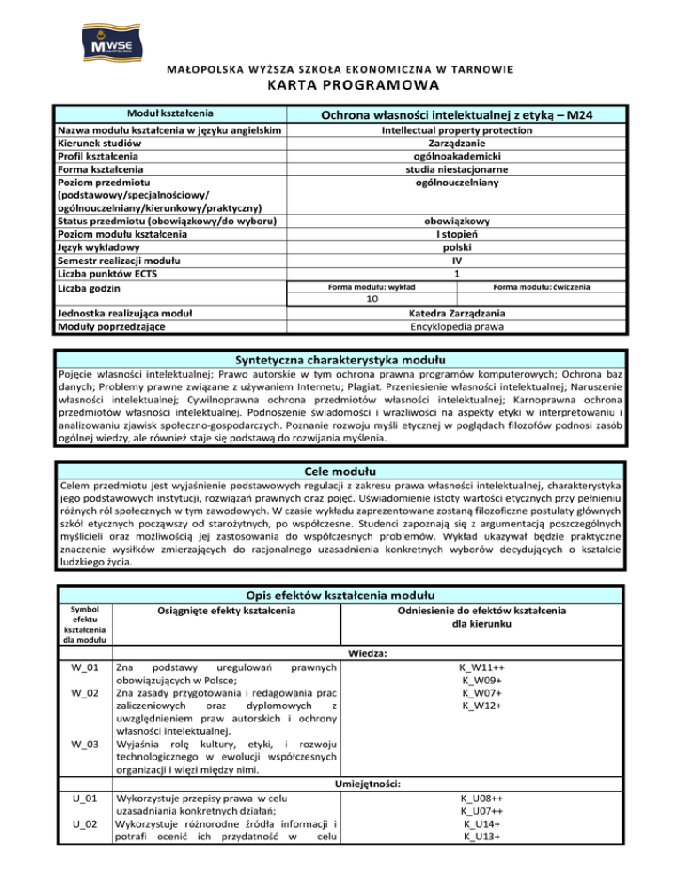 M AŁOPOLSKA WYŻSZA SZKOŁA EK ON OM ICZN A W TAR N OWIE KARTA PROGRAMOWA Moduł kształcenia Ochrona własności intelektualnej z etyką – M24 Nazwa modułu kształcenia w języku angielskim Kierunek studiów Profil kształcenia Forma kształcenia Poziom przedmiotu (podstawowy/specjalnościowy/ ogólnouczelniany/kierunkowy/praktyczny) Status przedmiotu (obowiązkowy/do wyboru) Poziom modułu kształcenia Język wykładowy Semestr realizacji modułu Liczba punktów ECTS Liczba godzin Intellectual property protection Zarządzanie ogólnoakademicki studia niestacjonarne ogólnouczelniany obowiązkowy I stopień polski IV 1 Forma modułu: wykład Forma modułu: ćwiczenia 10 Jednostka realizująca moduł Moduły poprzedzające Katedra Zarządzania Encyklopedia prawa Syntetyczna charakterystyka modułu Pojęcie własności intelektualnej; Prawo autorskie w tym ochrona prawna programów komputerowych; Ochrona baz danych; Problemy prawne związane z używaniem Internetu; Plagiat. Przeniesienie własności intelektualnej; Naruszenie własności intelektualnej; Cywilnoprawna ochrona przedmiotów własności intelektualnej; Karnoprawna ochrona przedmiotów własności intelektualnej. Podnoszenie świadomości i wrażliwości na aspekty etyki w interpretowaniu i analizowaniu zjawisk społeczno-gospodarczych. Poznanie rozwoju myśli etycznej w poglądach filozofów podnosi zasób ogólnej wiedzy, ale również staje się podstawą do rozwijania myślenia. Cele modułu Celem przedmiotu jest wyjaśnienie podstawowych regulacji z zakresu prawa własności intelektualnej, charakterystyka jego podstawowych instytucji, rozwiązań prawnych oraz pojęć. Uświadomienie istoty wartości etycznych przy pełnieniu różnych ról społecznych w tym zawodowych. W czasie wykładu zaprezentowane zostaną filozoficzne postulaty głównych szkół etycznych począwszy od starożytnych, po współczesne. Studenci zapoznają się z argumentacją poszczególnych myślicieli oraz możliwością jej zastosowania do współczesnych problemów. Wykład ukazywał będzie praktyczne znaczenie wysiłków zmierzających do racjonalnego uzasadnienia konkretnych wyborów decydujących o kształcie ludzkiego życia. Opis efektów kształcenia modułu Symbol efektu kształcenia dla modułu Osiągnięte efekty kształcenia Odniesienie do efektów kształcenia dla kierunku Wiedza: W_01 W_02 W_03 U_01 U_02 Zna podstawy uregulowań prawnych obowiązujących w Polsce; Zna zasady przygotowania i redagowania prac zaliczeniowych oraz dyplomowych z uwzględnieniem praw autorskich i ochrony własności intelektualnej. Wyjaśnia rolę kultury, etyki, i rozwoju technologicznego w ewolucji współczesnych organizacji i więzi między nimi. Umiejętności: Wykorzystuje przepisy prawa w celu uzasadniania konkretnych działań; Wykorzystuje różnorodne źródła informacji i potrafi ocenić ich przydatność w celu K_W11++ K_W09+ K_W07+ K_W12+ K_U08++ K_U07++ K_U14+ K_U13+ U_03 K_01 K_02 rozwiązania problemu. Interpretuje literaturę z zakresu etyki w kontekście działań pragmatycznych. Kompetencje społeczne: Zachowuje się profesjonalnie i etycznie, zwłaszcza w sytuacjach konfliktowych Rozumie problematykę etyczną w powiązaniu z realizowanymi zadaniami i działalnością gospodarczą, ma świadomość ważności działań profesjonalnych, zgodnych z zasadami etyki zawodowej i poszanowania różnorodności poglądów i kultur. K_K01++ K_K05++ K_K04++ Treści kształcenia modułu Forma modułu: wykład 1. Ogólna charakterystyka praw autorskich i pokrewnych. 2. Utwór jako przedmiot prawa autorskiego. Podmiot prawa autorskiego. Rodzaje utworów. 3. Autorskie prawa majątkowe. 4. Dozwolony użytek osobisty i publiczny. Ograniczenia zbiorowego zarządzania prawami autorskimi lub prawami pokrewnymi. 5. Umowy prawnoautorskie. 6. Autorskie prawa osobiste. 7. Plagiat. Odpowiedzialność cywilna i karna z tytułu naruszenia autorskich praw 8. majątkowych i osobistych. 9. Ogólna charakterystyka własności przemysłowej. Prawo patentowe. 10. Prawo znaków towarowych. 11. Prawo wzorów przemysłowych Literatura podstawowa Literatura uzupełniająca Forma modułu: ćwiczenia R. Golat, Prawo autorskie i prawa pokrewne,Wydawnictwo C.H.Beck, Warszawa 2008 M. Załucki, Prawo własności intelektualnej, Difin, Warszawa 2010 Metody dydaktyczne Wykład z prezentacjami graficznymi