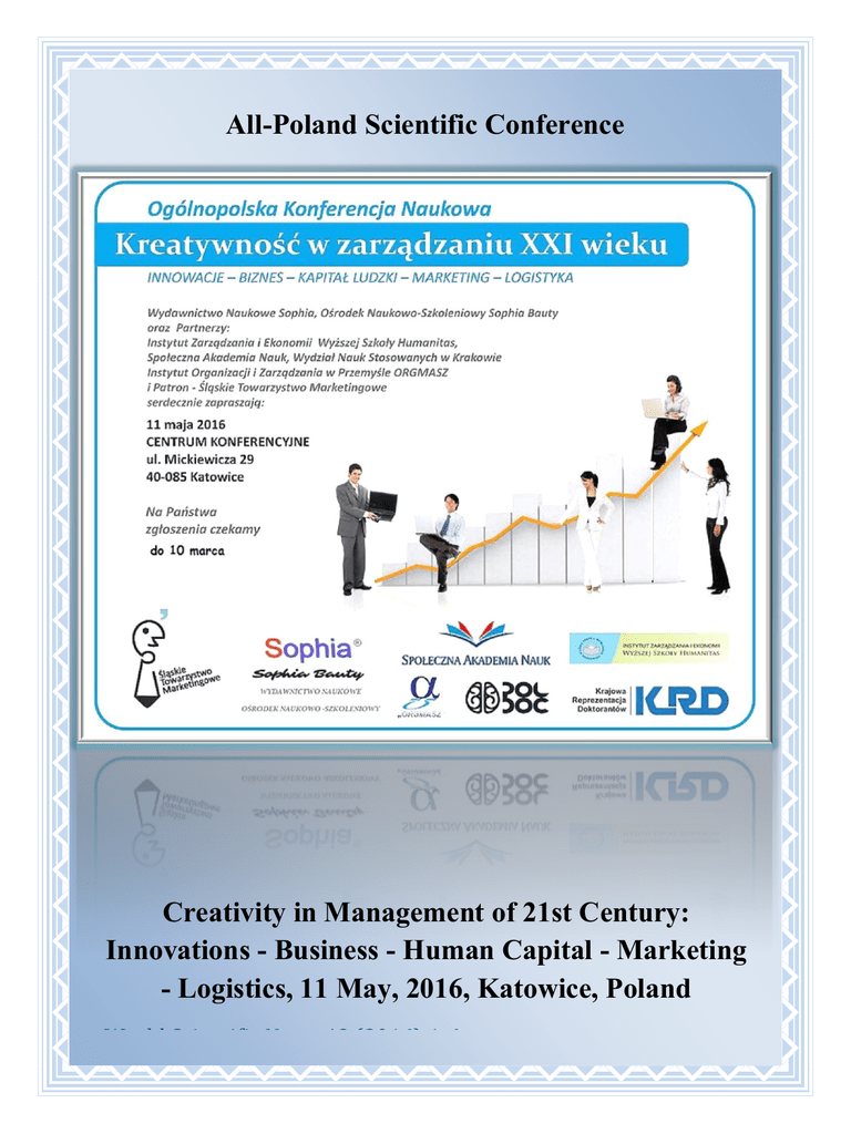 All-Poland Scientific Conference Creativity in Management of 21st Century: Innovations - Business - Human Capital - Marketing - Logistics, 11 May, 2016, Katowice, Poland World Scientific News 48 (2016) 1-6 Organizing Team Prof. Joanna Nowakowska- Grunt Chairwoman of Program Advice Faculty of Management Czestochowa University of Technology Poland Prof. Agata Mesjasz-Lech Vice of Chairwoman of Program Advice Faculty of Management Czestochowa University of Technology Poland Advisory Team Dr. Małgorzata Smolarek Chairwoman of Scientific Advice Institute of Management and Economy Humanitas University in Sosnowiec Poland Prof. Roman Olejnik Czestochowa University of Technology Poland Prof. Izabella Krawczyk-Sokołowska Czestochowa University of Technology Poland Prof. Ludmiła Szulgina National Technical University of Ukraine “Kyiv Polytechnic Institute” Ukraine Prof. Piotr Pachura University of Presov Slovakia Prof. Olena Kolomytseva Cherkassy State Technologik University Ukraine Prof. Róża Milic-Czerniak The Helena Chodkowska University of Technology and Economics Poland Prof. Agnieszka Rochmańska University of Lodz Poland Dr. Paweł Dec Institute of Organization and Management in Industry "ORGMASZ" Poland Dr. Monika Mynarzová VŠB - Technical University of Ostrava Czech Republic Dr. Katarina Haviernikova Alexander Dubček University of Trenčín Slovakia Dr. Rafał Kasprzak Warsaw School of Economics Poland Dr. Justyna Malkuch-Switalska Université de Lorraine France Dr. Ireneusz Miciuła University of Szczecin Poland Dr. Marzena Kruk Maria Curie-Skłodowska University Poland Dr. Anna Bęczkowska Gniezno of Higher School Millenium Poland Dr. Agnieszka Kańczukowska-Stadnik Gniezno of Higher School Millenium Poland Dr. Agnieszka Górka-Chowaniec The Jerzy Kukuczka Academy of Physical Education in Katowice Poland Dr. Michał Czuba University of Silesia in Katowice Poland Dr. Marika Świeszczak University of Lodz Poland Dr. Krzysztof Świeszczak University of Lodz Poland Dr. Bartosz Fortuński University of Opole Poland Dr. Barbara Czerniachowicz University of Szczecin Poland Dr. Jarosław Czaja Wrocław University of Economics poland Dr. Mirosława Skalik The Jan Długosz University in Częstochowa Poland Dr. Iwona Staniec Lodz University of Technology Poland Dr. Aneta Pachura Czestochowa University of Technology Poland Dr. Małgorzata Hordyńska Silesian University of Technology Poland Dr. Paweł Bator Higher School of Management and Banking in Poznan Poland Dr. Kajetan Bator Higher School of Management and Banking in Poznan Poland Dr. Lena Staś Collegium Da Vinci in Poznan Poland Dr. Wojciech Janik Elblab University of Humanistic – Economic, Poland Dr. Błażej Kmieciak Medical University of Lodz Poland Dr. Anna Lemańska-Majdzik Czestochowa University of Technology Poland Dr. Małgorzata Okręglicka Czestochowa University of Technology Poland Dr. Joanna Dzieńdziora Higher School of Business in Dabrowa Gornicza Poland Dr. Jadwiga Bakonyi Higher School of Humanitas in Sosnowiec Poland Dr. Agnieszka Górka-Chowaniec The Jerzy Kukuczka Academy of Physical Education in Katowice Poland Dr. Agnieszka Kurc-Lisiecka Higher School of Business in Olkusz Poland Dr. Judyta Kabus Czestochowa University of Technology Poland Dr. Monika Sipa Czestochowa University of Technology Poland Dr. Izabela Turek Czestochowa University of Technology Poland Dr. Piotr Kardasz Cluster Research and Development Innovation Foundation for Development of Science and Business on Medical and Exact Science, Wroclaw Poland Dr. Jacek Doskocz Cluster Research and Development Innovation Foundation for Development of Science and Business on Medical and Exact Science, Wroclaw Poland
