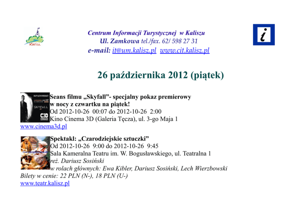 Centrum Informacji Turystycznej w Kaliszu Ul. Zamkowa tel./fax. 62/ 598 27 31 e-mail: [email protected] www.cit.kalisz.pl 26 października 2012 (piątek) Seans filmu „Skyfall”- specjalny pokaz premierowy w nocy z czwartku na piątek! Od 2012-10-26 00:07 do 2012-10-26 2:00 Kino Cinema 3D (Galeria Tęcza), ul. 3-go Maja 1 www.cinema3d.pl Spektakl: „Czarodziejskie sztuczki” Od 2012-10-26 9:00 do 2012-10-26 9:45 Sala Kameralna Teatru im. W. Bogusławskiego, ul. Teatralna 1 reż. Dariusz Sosiński w rolach głównych: Ewa Kibler, Dariusz Sosiński, Lech Wierzbowski Bilety w cenie: 22 PLN (N-), 18 PLN (U-) www.teatr.kalisz.pl IV Samorządowe Forum Kultury Blok tematyczny pt. „Po co seniorom kultura?” Od 2012-10-26 10:00 do 2012-10-26 13:30 Collegium Novum (sala audytoryjna „Błękitna”) Państwowej Wyższej Szkoły Zawodowej im. Prezydenta St. Wojciechowskiego, ul. Nowy Świat 4a org. Związek Miast Polskich, Miasto Kalisz www.zmp.miasto.biz, www.kalisz.pl Spektakl: „Szalone nożyczki” Od 2012-10-26 11:00 do 2012-10-26 13:00 Duża Scena Teatru im. W. Bogusławskiego, Plac W. Bogusławskiego 1 reż. Marcin Sławiński w rolach głównych: Agnieszka Dulęba- Kasza, Szymon Mysłakowski, Zbigniew Antoniewicz Bilety w cenie: 39 PLN (N-), 25 PLN (U-) www.teatr.kalisz.pl Koncert Charytatywny dla Melanii Od 2012-10-26 19:00 do 2012-10-26 21:30 Pub BeKa, ul. Piekarska 13 wystąpią: Akaw i herCu (beatbox) Qbafari Yard, The Riskers, The Flash, Bilety- cegiełki: 5 PLN www.pubbeka.pl Spektakl: „Szalone nożyczki” Od 2012-10-26 19:00 do 2012-10-26 21:00 Duża Scena Teatru im. W. Bogusławskiego, Plac W. Bogusławskiego 1 reż. Marcin Sławiński w rolach głównych: Agnieszka Dulęba- Kasza, Szymon Mysłakowski, Zbigniew Antoniewicz Bilety w cenie: 39 PLN (N-), 29 PLN (U-) www.teatr.kalisz.pl Międzynarodowy Festiwal „Bursztynowy Szlak” MULTIMEDIA Amber Road Festival „Drogi Europejskiego Romantyzmu” Od 2012-10-26 19:30 2012-10-26 21:00 Sala Koncertowa Filharmonii Kaliskiej Aula im. Prof. Jerzego Rubińskiego WPA-UAM, ul. Nowy Świat 28-30 wystąpią: Jeanne Christee- skrzypce Orkiestra Symfoniczna Filharmonii Kaliskiej Adam Klocek- dyrygent w programie: Karol Kurpiński- Uwertura „Zamek na Czorsztynie” Ludwig Spohr- VIII Koncert Skrzypcowy a-moll op. 47 „In Form Einer Gesangszene” Felix Mendelssohn- Bartholdy- III Symfonia a-moll op. 56 „Szkocka” w przerwie koncertu: Galeria Młodych Talentów Kwartet Smyczkowy PSM II st. im. H. Melcera w Kaliszu w składzie: Eliza Derbiszewska- I skrzypce Alicja Matuszczak- II skrzypce Aleksandra Szymańska- altówka Magdalena Łączek- wiolonczela uczennice Joanny Bary i Tofika Alidżanowa w programie: Wolfgang Amadeus Mozart- „Eine Kleine Nachtmusik” Menuet i Rondo John Williams- Theme from „Schindler's List” Piotr Czajkowski- Kwartet nr 1 „Andante Cantabile” Dofinansowano ze środków Ministra Kultury i Dziedzictwa Narodowego Bilety w cenie: 40 PLN (N-), 30 PLN (U-) www.filharmoniakaliska.pl Impreza: DVJ Rink in the BLUE! Od 2012-10-26 20:00 do 2012-10-27 05:00 BLUE Bowling & Club (Kaliski Park Wodny), ul. Sportowa 10 Bilety w cenie: 10 PLN (18+), panie do godz: 22:00 wstęp wolny www.bluebowling.pl Koncert: Maleo Reggae Rockers Od 2012-10-26 20:00 do 2012-10-26 22:00 Klub Studencki „Pod Muzami”, al. Wolności 27 Bilety w cenie: 20 PLN (przedsprzedaż), 25 PLN (w dniu koncertu) www.partypeople.pl, www.maleo.pl 27 października 2012 (sobota) „Biała Sobota” na Rajskowie i Winiarach Od 2012-10-27 10:00 do 2012-10-27 14:00 Szkoła Podstawowa nr 6, ul. Chełmska 18 org. Wydział Spraw Społecznych i Mieszkaniowych Urzędu Miejskiego w Kaliszu, Stowarzyszenie „Wszystko dla Kalisza” im. Prof. J. Rubińskiego, Rada Osiedla Rajsków, Rada Osiedla Winiary, dyrekcja Szkoły Podstawowej nr 6 Akcja zdrowotna finansowana z budżetu Kalisza- miasta na prawach powiatu www.kalisz.pl Cykl „Spojrzenie Daragana” Akcja sprzątania Cmentarza Ewangelicko- Augsburskiego Od 2012-10-27 12:00 do 2012-10-27 15:00 Cmentarz Ewangelicko- Augsburski, ul. Harcerska 1 org. Koło Naukowe Ochrony Dóbr Kultury (WPA- UAM w Kaliszu), Stowarzyszenie „Poza Kadrem”, Parafia Ewangelicko- Augsburska w Kaliszu, Towarzystwo Opieki nad Zabytkami Oddział w Kaliszu oraz Maciej Błachowicz i Beny'amin Neogenn www.calisia.pl, www.tonz.pl, www.pozakadrem.comm.pl Mecz Koszykówki- III Liga MKS Kalisz- MKS MOS Konin Od 2012-10-27 13:00 do 2012-10-27 14:30 Hala Widowiskowo- Sportowa „Kalisz-Arena”, ul. H. Sawickiej 22-24 (wejście od strony lodowiska) Wstęp wolny www.facebook.com/Koszykówka-w-Kaliszu Turniej w piłkę nożną Roczniki 1996 i młodsze Od 2012-10-27 15:00 do 2012-10-27 17:00 Boisko „ORLIK 2012”, ul. Graniczna 56-58 www.osir.kalisz.pl Mecz Piłki Nożnej- II Liga KP Calisia Kalisz- MKS Kluczbork Od 2012-10-27 15:00 do 2012-10-27 17:00 Stadion Miejski, ul. Łódzka 19 Bilety w cenie: 10 PLN (N-), 5 PLN (U-), 15 PLN (N-VIP), 7 PLN (U-VIP) www.kpcalisia.pl Spotkanie z Ewą Stankiewicz- reżyserką, scenarzystką i dziennikarką telewizyjną Od 2012-10-27 17:00 do 2012-10-27 19:30 Zespół Szkół Gastronomiczno- Hotelarskich im. Janka Bytnara „Rudego”, ul. Wodna 11-13 Wstęp wolny org. Zespół Szkół Gastronomiczno- Hotelarskich im. Janka Bytnara „Rudego”, kaliski Klub „Gazety Polskiej” www.zsgh.kalisz.pl Mecz Piłki Ręcznej- I Liga MKS Szczypiorno Kalisz- KPR Ostrovia Ostrów Wlkp. Od 2012-10-27 18:00 do 2012-10-27 20:00 Hala Widowiskowo- Sportowa „Kalisz-Arena”, ul. H. Sawickiej 22-24 Bilety w cenie: 7 PLN (N-), 3 PLN (U-) org. MKS Kalisz www.kpr-kalisz.pl XI Koncert z cyklu „A my tak łatwopalni...” Janusz Radek- „Serwus Madonna” Od 2012-10-27 19:00 do 2012-10-27 21:00 Sala Widowiskowa Centrum Kultury i Sztuki, ul. Łazienna 6 w programie: piosenki Ewy Demarczyk i innych artystów „Piwnicy pod Baranami” wystąpią: Janusz Radek- śpiew Marcin Sanakiewicz- instrumenty klawiszowe Tomasz Góra