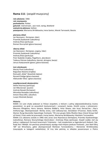 Rama 111 (zespół muzyczny) rok założenia: 1966 rok rozwiązania: pochodzenie: Polska gatunek: mainstream, jazz-rock, swing, dixieland wytwórnia płytowa: Soliton powiązania: Marianna Wróblewska, Irena Santor, Marek Tarnowski, Baszta pierwszy skład: Jan Rejnowicz (fortepian, lider) Przemek Dyakowski (saksofony) Andrzej Śliwa (perkusja) Roman Skurzyoski (gitara basowa) obecny skład: Jan Rejnowicz (fortepian, organy, lider) Przemek Dyakowski (saksofony) Andrzej Śliwa (perkusja) Piotr Nadolski (trąbka, flügelhorn, akordeon) Tadeusz Petrow (saksofony, klarnet, skrzypce, banjo) Janusz Kadyszewski (gitara, gitara basowa) inni członkowie: Maciej Flont (saksofony) Bogusław Skawina (trąbka) Romuald „Mały” Skawioski (śpiew) Ryszard Szeliga (gitara basowa) Aleksander Śliwa (gitara basowa) współpracowali okazjonalnie: Stefan Kearney (perkusja) Jan Młynarczyk (puzon) Andrzej Nowak (fortepian) Mirosław Romejko (saksofony) Antoni Śliwa (flet, saksofon) Lucjan Woźniak (banjo) Historia: RAMA 111 jest chyba jedynym w Polsce zespołem, o którym z pełną odpowiedzialnością można powiedzied, że grali na wszystkich kontynentach i oceanach świata. Dzielili scenę z orkiestrami: Mercera Ellingtona, Harry Jamesa, Nelsona Riddle’a, Artie Shawa, obu braci Dorsey’ów i Ray’a Anthony’ego. Akompaniowali: Shirley Jones, Cab Calloway’owi, Donaldowi O’Connor, Keely Smith, Marion Rung (laureatka Sopockiego Festiwalu ‘74) oraz grupie Delta Rhythm Boys (Vocal Group Hall of Fame). Przez wiele lat pracowali z Ireną Santor, Marianną Wróblewską i Markiem Tarnowskim. RAMA 111 założona została w 1966 roku przez Jana Rejnowicza (fortepian), Przemka Dyakowskiego (saksofony), Romana Skurzyoskiego (kontrabas) i Andrzeja Śliwę (perkusja). Zespół szybko stał się jedną z najlepszych formacji tanecznych Trójmiasta – byli rezydentami w legendarnych klubach: Żak, Rudy Kot i Medyk. Ich pierwszy poważniejszy występ miał miejsce podczas Festiwalu „Jazz Nad Odrą ‘68” we Wrocławiu, gdzie akompaniowali Markowi Tarnowskiemu i Mariannie Wróblewskiej (zwyciężyła w kategorii wokalistów). W trzy lata później, w składzie poszerzonym o Piotra Nadolskiego (trąbka), wystąpili tam powtórnie i za jazzowe opracowanie staropolskiej pieśni rycerskiej „Bogurodzica” otrzymali trzecią nagrodę. Od tego czasu, wojażując po świecie, występowali również m.in. na festiwalach „Jazz Jamboree” i „Jazz Jantar”, w warszawskiej Filharmonii Narodowej i katowickim Spodku, w sopockiej Operze Leśnej i w Non-Stopie. Przez dekadę byli też zespołem Rozgłośni Polskiego Radia w Gdaosku, gdzie regularnie nagrywali. Od roku 1972 do zespołu dołączył multiinstrumentalista Tadeusz Petrow. W roku następnym nagrali z Marianną Wróblewską jej album „Bylebym się zakochała”. W latach następnych występowali głównie poza granicami kraju i dzisiaj są chyba jedynym zespołem w Polsce, o którym można powiedzied, że grał na wszystkich kontynentach i oceanach świata. Muzyka: RAMA 111 od początku grała nowocześnie aranżowany mainstream, w którym słychad było wszystko to, co działo się wówczas w muzycznym świecie. Na początku lat 70-tych eksperymentowali z jazzrockiem, by dwie dekady później zwrócid się ku muzyce swingowej i dixielandowi. Prezentują tę muzykę z powodzeniem do dzisiaj. Grają standardy, evergreeny oraz kompozycje własne. Dyskografia: 2000 – Sound of Gdynia (Polonia Records) 2012 – Swingujące 3-miasto – Rama 111 (Soliton)