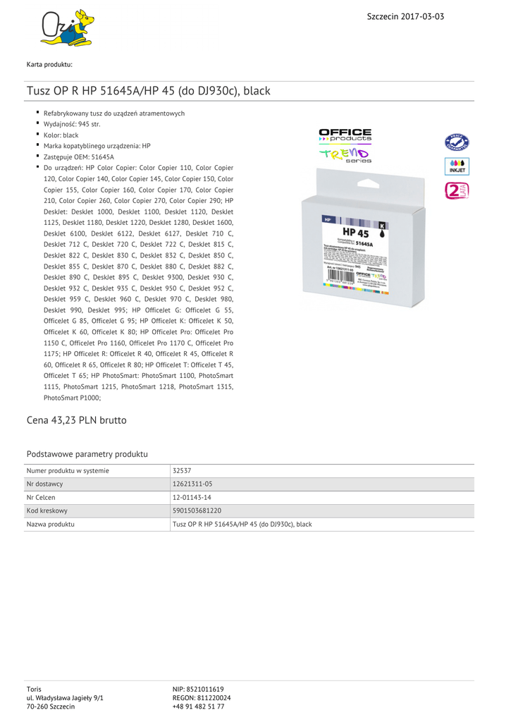 Szczecin 2017-03-03 Karta produktu: Tusz OP R HP 51645A/HP 45 (do DJ930c), black Refabrykowany tusz do uządzeń atramentowych Wydajność: 945 str. Kolor: black Marka kopatyblinego urządzenia: HP Zastępuje OEM: 51645A Do urządzeń: HP Color Copier: Color Copier 110, Color Copier 120, Color Copier 140, Color Copier 145, Color Copier 150, Color Copier 155, Color Copier 160, Color Copier 170, Color Copier 210, Color Copier 260, Color Copier 270, Color Copier 290; HP DeskJet: DeskJet 1000, DeskJet 1100, DeskJet 1120, DeskJet 1125, DeskJet 1180, DeskJet 1220, DeskJet 1280, DeskJet 1600, DeskJet 6100, DeskJet 6122, DeskJet 6127, DeskJet 710 C, DeskJet 712 C, DeskJet 720 C, DeskJet 722 C, DeskJet 815 C, DeskJet 822 C, DeskJet 830 C, DeskJet 832 C, DeskJet 850 C, DeskJet 855 C, DeskJet 870 C, DeskJet 880 C, DeskJet 882 C, DeskJet 890 C, DeskJet 895 C, DeskJet 9300, DeskJet 930 C, DeskJet 932 C, DeskJet 935 C, DeskJet 950 C, DeskJet 952 C, DeskJet 959 C, DeskJet 960 C, DeskJet 970 C, DeskJet 980, DeskJet 990, DeskJet 995; HP OfficeJet G: OfficeJet G 55, OfficeJet G 85, OfficeJet G 95; HP OfficeJet K: OfficeJet K 50, OfficeJet K 60, OfficeJet K 80; HP OfficeJet Pro: OfficeJet Pro 1150 C, OfficeJet Pro 1160, OfficeJet Pro 1170 C, OfficeJet Pro 1175; HP OfficeJet R: OfficeJet R 40, OfficeJet R 45, OfficeJet R 60, OfficeJet R 65, OfficeJet R 80; HP OfficeJet T: OfficeJet T 45, OfficeJet T 65; HP PhotoSmart: PhotoSmart 1100, PhotoSmart 1115, PhotoSmart 1215, PhotoSmart 1218, PhotoSmart 1315, PhotoSmart P1000; Cena 43,23 PLN brutto Podstawowe parametry produktu Numer produktu w systemie 32537 Nr dostawcy 12621311-05 Nr Celcen 12-01143-14 Kod kreskowy 5901503681220 Nazwa produktu Tusz OP R HP 51645A/HP 45 (do DJ930c), black Toris ul. Władysława Jagieły 9/1 70-260 Szczecin NIP: 8521011619 REGON: 811220024 +48 91 482 51 77 Szczecin 2017-03-03 Karta katalogowa produktu cd. Tusz OP R HP 51645A/HP 45 (do DJ930c), black Opis Refabrykowany tusz do uządzeń atramentowych; wydajność: 945 str.; kolor: black; marka kopatyblinego urządzenia: HP; zastępuje OEM: 51645A; do urządzeń: HP Color Copier: Color Copier 110, Color Copier 120, Color Copier 140, Color Copier 145, Color Copier 150, Color Copier 155, Color Copier 160, Color Copier 170, Color Copier 210, Color Copier 260, Color Copier 270, Color Copier 290; HP DeskJet: DeskJet 1000, DeskJet 1100, DeskJet 1120, DeskJet 1125, DeskJet 1180, DeskJet 1220, DeskJet 1280, DeskJet 1600, DeskJet 6100, DeskJet 6122, DeskJet 6127, DeskJet 710 C, DeskJet 712 C, DeskJet 720 C, DeskJet 722 C, DeskJet 815 C, DeskJet 822 C, DeskJet 830 C, DeskJet 832 C, DeskJet 850 C, DeskJet 855 C, DeskJet 870 C, DeskJet 880 C, DeskJet 882 C, DeskJet 890 C, DeskJet 895 C, DeskJet 9300, DeskJet 930 C, DeskJet 932 C, DeskJet 935 C, DeskJet 950 C, DeskJet 952 C, DeskJet 959 C, DeskJet 960 C, DeskJet 970 C, DeskJet 980, DeskJet 990, DeskJet 995; HP OfficeJet G: OfficeJet G 55, OfficeJet G 85, OfficeJet G 95; HP OfficeJet K: OfficeJet K 50, OfficeJet K 60, OfficeJet K 80; HP OfficeJet Pro: OfficeJet Pro 1150 C, OfficeJet Pro 1160, OfficeJet Pro 1170 C, OfficeJet Pro 1175; HP OfficeJet R: OfficeJet R 40, OfficeJet R 45, OfficeJet R 60, OfficeJet R 65, OfficeJet R 80; HP OfficeJet T: OfficeJet T 45, OfficeJet T 65; HP PhotoSmart: PhotoSmart 1100, PhotoSmart 1115, PhotoSmart 1215, PhotoSmart 1218, PhotoSmart 1315, PhotoSmart P1000; Kategoria Tusze Klasa Ekonomiczne Marka HP Cecha W ofercie od 2016-07 Produkt HP Typ Refabrykowany Wspólny słownik zamówień CPV 30192113-6 Wkłady drukujące Kolor Kolor Black Certyfikaty Nowy produkt w ofercie Standard Hit Standard Zastosowanie Zastosowanie Do urządzeń atramentowych Serdecznie zapraszamy do współpracy Toris ul. Władysława Jagieły 9/1 70-260 Szczecin NIP: 8521011619 REGON: 811220024 +48 91 482 51 77 Szczecin 2017-03-03 Toris zespół. Toris ul. Władysława Jagieły 9/1 70-260 Szczecin NIP: 8521011619 REGON: 811220024 +48 91 482 51 77
