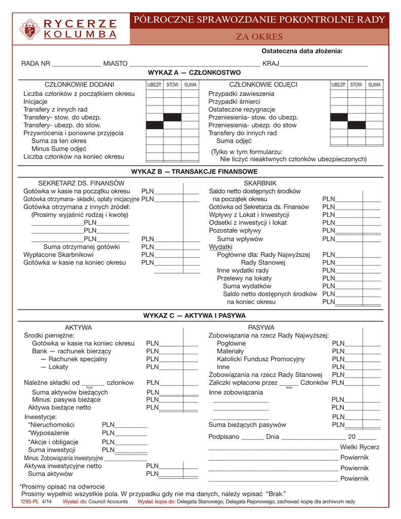 RYCERZE PÓŁROCZNE SPRAWOZDANIE POKONTROLNE RADY KOLUMBA ZA OKRES Ostateczna data złożenia: RADA NR _______________ MIASTO ________________________________________ KRAJ___________________________ WYKAZ A — CZŁONKOSTWO CZŁONKOWIE DODANI Liczba członków z początkiem okresu Inicjacje Transfery z innych rad Transfery- stow. do ubezp. Transfery- ubezp. do stow. Przywrócenia i ponowne przyjęcia Suma za ten okres Minus Sumę odjęć Liczba członków na koniec okresu UBEZP. STOW. SUMA CZŁONKOWIE ODJĘCI Przypadki zawieszenia Przypadki śmierci Ostateczne rezygnacje Przeniesienia- stow. do ubezp. Przeniesienia- ubezp. do stow Transfery do innych rad Suma odjęć UBEZP. STOW. SUMA (Tylko w tym formularzu: Nie liczyć nieaktwnych członków ubezpieczonych) WYKAZ B — TRANSAKCJE FINANSOWE SEKRETARZ DS. FINANSÓW Gotówka w kasie na początku okresu PLN______________ Gotówka otrzymana- składki, opłaty inicjacyjne PLN______________ Gotówka otrzymana z innych żródeł: (Prosimy wyjaśnić rodzaj i kwotę) ________________PLN__________ ________________PLN__________ ________________PLN__________ PLN______________ Suma otrzymanej gotówki PLN______________ Wypłacone Skarbnikowi PLN______________ Gotówka w kasie na koniec okresu PLN______________ ______________ SKARBNIK Saldo netto dostępnych środków na początek okresu Gotówka od Sekretarza ds. Finansów Wpływy z Lokat i Inwestycji Odsetki z inwestycji i lokat Pozostałe wpływy Suma wpływów Wydatki Pogłówne dla: Rady Najwyższej Rady Stanowej Inne wydatki rady Przelewy na lokaty Suma wydatków Saldo netto dostępnych środków na koniec okresu PLN______________ PLN______________ PLN______________ PLN______________ PLN______________ ______________ PLN______________ PLN______________ PLN______________ PLN______________ PLN______________ PLN______________ PLN______________ PLN______________ ______________ WYKAZ C — AKTYWA I PASYWA AKTYWA Środki pieniężne: Gotówka w kasie na koniec okresu Bank — rachunek bierzący — Rachunek specjalny — Lokaty PLN____________ PLN____________ PLN____________ PLN____________ Należne składki od _______ członkow PLN____________ ilość Suma aktywów bieżących PLN____________ ____________ Minus: pasywa bieżące PLN____________ Aktywa bieżące netto PLN____________ ____________ Inwestycje: *Nieruchomości PLN__________ *Wyposażenie PLN__________ *Akcje i obligacje PLN__________ Suma inwestycji PLN__________ __________ Minus: Zobowiązania inwestycyjne _____________ Aktywa inwestycyjne netto PLN____________ Suma aktywów PLN____________ ____________ PASYWA Zobowiązania na rzecz Rady Najwyższej: Pogłówne Materiały Katolicki Fundusz Promocyjny Inne Zobowiązania na rzecz Rady Stanowej Zaliczki wpłacone przez ______ Członków ilość Inne zobowiązania _________________ _________________ _________________ Suma bieżących pasywów PLN___________ PLN___________ PLN___________ PLN___________ PLN___________ PLN___________ PLN___________ PLN___________ PLN___________ PLN___________ ___________ Podpisano _______ Dnia ____________________ 20 ______ ________________________________________ Wielki Rycerz ________________________________________ Powiernik ________________________________________ Powiernik ________________________________________ Powiernik *Prosimy opisać na odwrocie Prosimy wypełnić wszystkie pola. W przypadku gdy nie ma danych, należy wpisać “Brak.” 1295-PL 4/14 Wysłać do: Council Accounts Wysłać kopie do: Delegata Stanowego, Delegata Rejonowego, zachować kopię dla archiwum rady
