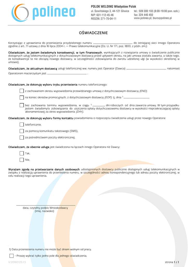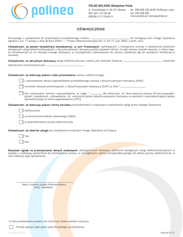 POLOK WELDING Władysław Polok ul. Sowińskiego 3, 44-121 Gliwice NIP: 631-112-45-46 REGON: 271-70-04-11 tel.: 509 300 103 (8:00-19:00 pon.-sob.) fax: 324 446 450 www.polineo.pl, [email protected] OŚWIADCZENIE Korzystając z uprawnienia do przeniesienia przydzielonego numeru ____________________________ do istniejącej sieci innego Operatora zgodnie z art. 71 ustawy z dnia 16 lipca 2004 r. — Prawo telekomunikacyjne (Dz. U. Nr 171, poz. 1800, z późn. zm.): Oświadczam, że jestem świadomy/a konsekwencji, w tym finansowych, wynikających z rozwiązania umowy o świadczenie publicznie dostępnych usług telekomunikacyjnych z dotychczasowym dostawcą przed upływem okresu, na jaki umowa została zawarta, a także tego, że konsekwencje te nie obciążą nowego dostawcy, w szczególności zobowiązania do zwrotu udzielonej ulgi (w wysokości określonej w umowie). Oświadczam, że aktualnym dostawcą usługi telefonicznej ww. numeru jest Operator (Dawca) ____________________________, natomiast Operatorem macierzystym jest ____________________________ . Oświadczam, że dokonuję wyboru trybu przeniesienia numeru telefonicznego: z zachowaniem okresu wypowiedzenia przewidzianego umową z dotychczasowym dostawcą (END), na koniec okresów promocyjnych, z dotychczasowym dostawcą (EOP), tj. dnia 1) __________________, bez zachowania terminu wypowiedzenia, w ciągu 1) _________ dni roboczych od dnia zawarcia umowy. W tym przypadku jestem świadomy/a zobowiązania do uiszczenia opłaty dotychczasowemu dostawcy w wysokości nieprzekraczającej opłaty abonamentowej za okres wypowiedzenia (DAY). Oświadczam, że dokonuję wyboru formy kontaktu powiadomienia o rozpoczęciu świadczenia usługi przez nowego Operatora: telefonicznie, za pomocą komunikatu tekstowego (SMS), za pośrednictwem poczty elektronicznej. Oświadczam, że obecnie usługa jest świadczona na łączach innego Operatora niż Dawcy: Tak, Nie, Wyrażam zgodę na przetwarzanie danych osobowych udostępnionych dostawcy publicznie dostępnych usług telekomunikacyjnych w związku z realizacją uprawnienia do przeniesienia numeru, w szczególności adresu korespondencyjnego lub adresu poczty elektronicznej, w celu realizacji tego uprawnienia. __________________________________________ data, czytelny podpis Wnioskodawcy (imię, nazwisko) 1) Data przeniesienia numeru nie może być dniem wolnym od pracy. - Proszę wybrać tylko jedno pole dla jednego oświadczenia. V:20160125.1.5 strona 1 z 1