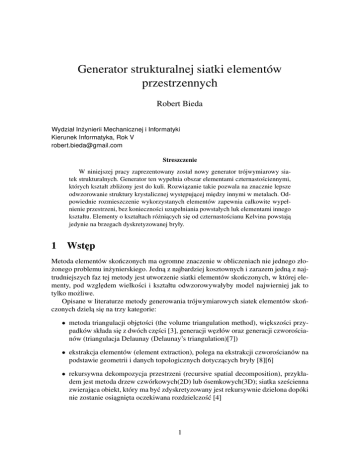 Generator strukturalnej siatki elementów przestrzennych Robert Bieda Wydział Inżynierii Mechanicznej i Informatyki Kierunek Informatyka, Rok V [email protected] Streszczenie W niniejszej pracy zaprezentowany został nowy generator trójwymiarowy siatek strukturalnych. Generator ten wypełnia obszar elementami czternastościennymi, których kształt zbliżony jest do kuli. Rozwiazanie ˛ takie pozwala na znacznie lepsze odwzorowanie struktury krystalicznej wyst˛epujacej ˛ mi˛edzy innymi w metalach. Odpowiednie rozmieszczenie wykorzystanych elementów zapewnia całkowite wypełnienie przestrzeni, bez konieczności uzupełniania powstałych luk elementami innego kształtu. Elementy o kształtach różniacych ˛ si˛e od czternastościanu Kelvina powstaja˛ jedynie na brzegach dyskretyzowanej bryły. 1 Wst˛ep Metoda elementów skończonych ma ogromne znaczenie w obliczeniach nie jednego złożonego problemu inżynierskiego. Jedna˛ z najbardziej kosztownych i zarazem jedna˛ z najtrudniejszych faz tej metody jest utworzenie siatki elementów skończonych, w której elementy, pod wzgl˛edem wielkości i kształtu odwzorowywałyby model najwierniej jak to tylko możliwe. Opisane w literaturze metody generowania trójwymiarowych siatek elementów skończonych dziela˛ si˛e na trzy kategorie: • metoda triangulacji obj˛etości (the volume triangulation method), wi˛ekszości przypadków składa si˛e z dwóch cz˛eści [3], generacji w˛ezłów oraz generacji czworościanów (triangulacja Delaunay (Delaunay’s triangulation)[7]) • ekstrakcja elementów (element extraction), polega na ekstrakcji czworościanów na podstawie geometrii i danych topologicznych dotyczacych ˛ bryły [8][6] • rekursywna dekompozycja przestrzeni (recursive spatial decomposition), przykładem jest metoda drzew czwórkowych(2D) lub ósemkowych(3D); siatka sześcienna zwierajaca ˛ obiekt, który ma być zdyskretyzowany jest rekursywnie dzielona dopóki nie zostanie osiagni˛ ˛ eta oczekiwana rozdzielczość [4] 1 W dwóch pierwszych przypadkach siatka tworzona jest wyłacznie ˛ z czworościanów, w trzecim przypadku moga˛ si˛e pojawić sześciany, graniastosłupy, ostrosłupy oraz inne elementy bryłowe[5]. Każda z wyżej wymienionych metod może generować elementy zniekształcone. Elementy te w wi˛ekszości skoncentrowane sa˛ w pobliżu brzegów modelu. Celem niniejszej pracy jest przedstawienie sposobu generowania siatki elementów przestrzennych z wykorzystaniem hybrydowych elementów czternastościennych tzw. czternastościanów Kelvina, których kształt zbliżony jest do kuli. Wykorzystane w niniejszej pracy elementy skończone moga˛ w sposób lepszy niż używane w wymienionych powyżej metodach czworościany i sześciany, odwzorować struktur˛e krystaliczna˛ metali oraz ich stopów[1]. To od struktury krystalicznej zależa˛ własności fizyczne metalu, takie jak na przykład wytrzymałość, twardość, temperatura topnienia czy przewodność elektryczna i cieplna. Opisywane elementy sa˛ bardzo przydatne do modelowania ziaren oraz warstw mi˛edzyziarnowych w stopach b˛edacych ˛ w stanie stało-ciekłym[2]. 2 Struktura krystaliczna metali Sieć krystaliczna to sposób w jaki atomy wypełniaja˛ przestrzeń tak, że pewna konfiguracja atomów zwana komórka˛ elementarna˛ jest wielokrotnie powtarzana. Wiele spośród ciał stałych ma budow˛e krystaliczna.˛ Oznacza to, że atomy, z których si˛e składaja˛ ułożone sa˛ w określonym porzadku. ˛ Od dawna wiadomo, że badanie struktury metali dostarcza wielu cennych informacji na temat rodzaju i stanu materiału. Dzi˛eki obrazom mikroskopowym rozpoznajemy odlewy, możemy si˛e również dowiedzieć, czy ich struktura jest prawidłowa, spełniajaca ˛ wymagania użytkownika, czy też posiadaja˛ one ukryte wady, widoczne tylko pod mikroskopem. Rys. 1: Ziarna w strukturze drutu wykonanego z czystego tytanu (po lewej), struktura krystaliczna miedzi (po prawej) Podstawowa˛ cecha˛ metali obok struktury krystalicznej jest wielkość ziarna b˛edace˛ go obszarem monokrystalicznego uporzadkowania. ˛ Ziarna (krystality) moga˛ układać si˛e w sposób uporzadkowany ˛ tworzac ˛ okragłe ˛ (lub sferyczne) sferolity, dendryty o budowie drzewiastej, igły i inne. Wielkości ziaren i ich orientacji ma decydujacy ˛ wpływ na struktur˛e danego materiału a tym samym na jego właściwości. Im mniejsza jest średnia wielkość ziarna, tym wi˛eksza jest granica plastyczności, wytrzymałość i twardość, natomiast 2 mniejsza plastyczność materiału. Gruboziarnistość cz˛esto powoduje kruchość i zmniejsza wytrzymałość. Niejednakowa wielkość ziarna pogarsza właściwości mechaniczne, a może też powodować wyraźna˛ kruchość materiału. 3 Generacja siatki Struktura metalu i jego stopów, a w zasadzie ich sieć krystaliczna jest zbudowana z elementów wygladem ˛ przypominajac ˛ a˛ kule. Utworzenie siatki z elementów sferycznych nie jest możliwe, nie daje ona pełnego zapełnienia obszaru. Czternastościan Kelvina (Rys. 2) kształtem zbliżony jest do sfery oraz umożliwia pełne wypełnienie obszaru. Element ten powstał poprzez ści˛ecie narożników ośmiościanu i składa si˛e z ośmiu sześciokatów ˛ i sześciu kwadratów. Zadaniem generatora siatki opisanego w tej pracy jest utworzenie, Rys. 2: Czternastościan Kelvina, od lewej: dwie pozycje ukierunkowania elementu oraz sposób powstania tetradekahedronu. siatki elementów w oparciu o opis geometrii zadanego obszaru (w przestrzeni trójwymiarowej). Siatka tworzona przez program jest strukturalna, co oznacza że liczba kraw˛edzi incydentnych do poszczególnych w˛ezłów jest stała. Sposób tworzenia siatki zależy bezpośrednio od wielkości brzegów obszaru, a także od szeregu dodatkowych parametrów pozwalajacych ˛ wpływać na ostateczny kształt siatki, jej g˛estość, a tym samy na wielkość i ilość elementów. Dzi˛eki temu możliwe jest uwzg