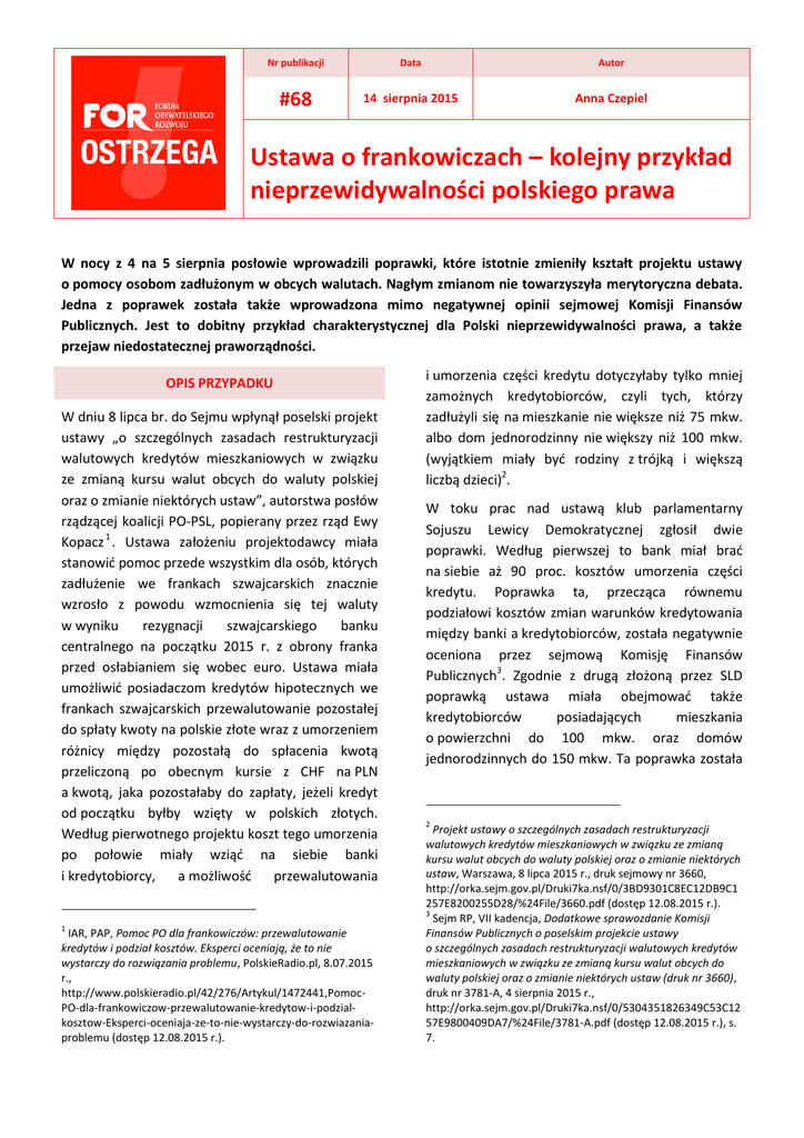 Nr publikacji Data Autor #68 14 sierpnia 2015 Anna Czepiel Ustawa o frankowiczach – kolejny przykład nieprzewidywalności polskiego prawa W nocy z 4 na 5 sierpnia posłowie wprowadzili poprawki, które istotnie zmieniły kształt projektu ustawy o pomocy osobom zadłużonym w obcych walutach. Nagłym zmianom nie towarzyszyła merytoryczna debata. Jedna z poprawek została także wprowadzona mimo negatywnej opinii sejmowej Komisji Finansów Publicznych. Jest to dobitny przykład charakterystycznej dla Polski nieprzewidywalności prawa, a także przejaw niedostatecznej praworządności. OPIS PRZYPADKU W dniu 8 lipca br. do Sejmu wpłynął poselski projekt ustawy „o szczególnych zasadach restrukturyzacji walutowych kredytów mieszkaniowych w związku ze zmianą kursu walut obcych do waluty polskiej oraz o zmianie niektórych ustaw”, autorstwa posłów rządzącej koalicji PO-PSL, popierany przez rząd Ewy Kopacz 1 . Ustawa założeniu projektodawcy miała stanowić pomoc przede wszystkim dla osób, których zadłużenie we frankach szwajcarskich znacznie wzrosło z powodu wzmocnienia się tej waluty w wyniku rezygnacji szwajcarskiego banku centralnego na początku 2015 r. z obrony franka przed osłabianiem się wobec euro. Ustawa miała umożliwić posiadaczom kredytów hipotecznych we frankach szwajcarskich przewalutowanie pozostałej do spłaty kwoty na polskie złote wraz z umorzeniem różnicy między pozostałą do spłacenia kwotą przeliczoną po obecnym kursie z CHF na PLN a kwotą, jaka pozostałaby do zapłaty, jeżeli kredyt od początku byłby wzięty w polskich złotych. Według pierwotnego projektu koszt tego umorzenia po połowie miały wziąć na siebie banki i kredytobiorcy, a możliwość przewalutowania 1 IAR, PAP, Pomoc PO dla frankowiczów: przewalutowanie kredytów i podział kosztów. Eksperci oceniają, że to nie wystarczy do rozwiązania problemu, PolskieRadio.pl, 8.07.2015 r., http://www.polskieradio.pl/42/276/Artykul/1472441,PomocPO-dla-frankowiczow-przewalutowanie-kredytow-i-podzialkosztow-Eksperci-oceniaja-ze-to-nie-wystarczy-do-rozwiazaniaproblemu (dostęp 12.08.2015 r.). i umorzenia części kredytu dotyczyłaby tylko mniej zamożnych kredytobiorców, czyli tych, którzy zadłużyli się na mieszkanie nie większe niż 75 mkw. albo dom jednorodzinny nie większy niż 100 mkw. (wyjątkiem miały być rodziny z trójką i większą liczbą dzieci)2. W toku prac nad ustawą klub parlamentarny Sojuszu Lewicy Demokratycznej zgłosił dwie poprawki. Według pierwszej to bank miał brać na siebie aż 90 proc. kosztów umorzenia części kredytu. Poprawka ta, przecząca równemu podziałowi kosztów zmian warunków kredytowania między banki a kredytobiorców, została negatywnie oceniona przez sejmową Komisję Finansów Publicznych3. Zgodnie z drugą złożoną przez SLD poprawką ustawa miała obejmować także kredytobiorców posiadających mieszkania o powierzchni do 100 mkw. oraz domów jednorodzinnych do 150 mkw. Ta poprawka została 2 Projekt ustawy o szczególnych zasadach restrukturyzacji walutowych kredytów mieszkaniowych w związku ze zmianą kursu walut obcych do waluty polskiej oraz o zmianie niektórych ustaw, Warszawa, 8 lipca 2015 r., druk sejmowy nr 3660, http://orka.sejm.gov.pl/Druki7ka.nsf/0/3BD9301C8EC12DB9C1 257E8200255D28/%24File/3660.pdf (dostęp 12.08.2015 r.). 3 Sejm RP, VII kadencja, Dodatkowe sprawozdanie Komisji Finansów Publicznych o poselskim projekcie ustawy o szczególnych zasadach restrukturyzacji walutowych kredytów mieszkaniowych w związku ze zmianą kursu walut obcych do waluty polskiej oraz o zmianie niektórych ustaw (druk nr 3660), druk nr 3781-A, 4 sierpnia 2015 r., http://orka.sejm.gov.pl/Druki7ka.nsf/0/5304351826349C53C12 57E9800409DA7/%24File/3781-A.pdf (dostęp 12.08.2015 r.), s. 7. Nagłe zmiany w projekcie ustawy o pomocy tzw. frankowiczom przykładem nieprzewidywalności polskiego prawa zaakceptowana przez komisję4, jednak, jak wynika z zapisu przebiegu posiedzenia Sejmu z dnia 4 sierpnia br., wprowadzenie ustawowej możliwości przewalutowania i umorzenia części kredytu także osobom zamożniejszym (spłacającym kredyty wzięte na kupno nieruchomości większych niż 75 mkw.) zostało uzasadnione przez sprawozdawczynię projektu ustawy Krystynę Skowrońską jedynie „krytyką kryterium powierzchni” oraz „ważnym interesem społecznym” 5 . Obie poprawki bez merytorycznego uzasadnienia zostały przyjęte przez Sejm w nocy z 4 na 5 sierpnia br. większością 281 głosów (2 posłów przeciw, 150 wstrzymujących się). Za przyjęciem ustawy z nagłymi poprawkami głosowali także posłowie, którzy byli wnioskodawcami pierwotnego projektu ustawy. Innymi sztandarowymi przykładami nieprzewidywalności polskiego prawa są zmiany w OFE z 2014 r., które dotyczyły osób już oszczędzających na emeryturę, a także kilkudziesięciokrotne nowelizacje w ustawach o PIT i VAT na przestrzeni ostatniej dekady. Przypadek ustawy o pomocy „frankowiczom” pokazuje, że nieprzewidywalność zmian w polskim prawie wynika w znacznej mierze z dążenia polityków do przypodobania się wyborcom. Co więcej, ci sami posłowie, którzy wcześniej zgłosili projekt rozsądniejszy, na posiedzeniu w dniach 4 i 5 sierpnia bez mrugnięcia okiem ulegli daleko idącym zmianom (które, nawiasem mówiąc, zostały zaproponowane przez ich politycznych oponentów). Chcąc pochwalić się przyjęciem ustawy korzystnej dla jakiejś grupy oraz pokazać się jako „wrażliwi społecznie” (ponieważ reagują na jakiś głośny medialnie problem, np. kwestię „frankowiczów”), politycy zapominają o zasadzie państwa prawa, która wymaga, aby decyzje były podejmowane w wyniku merytorycznej debaty, a uchwalane ustawy gwarantowały równość obywateli wobec prawa. OCENA EKSPERTA FOR Nagłe i pozbawione merytorycznej dyskusji przyjęcie przez Sejm zupełnie innych niż wcześniej proponowane rozwiązań w projekcie ustawy 
