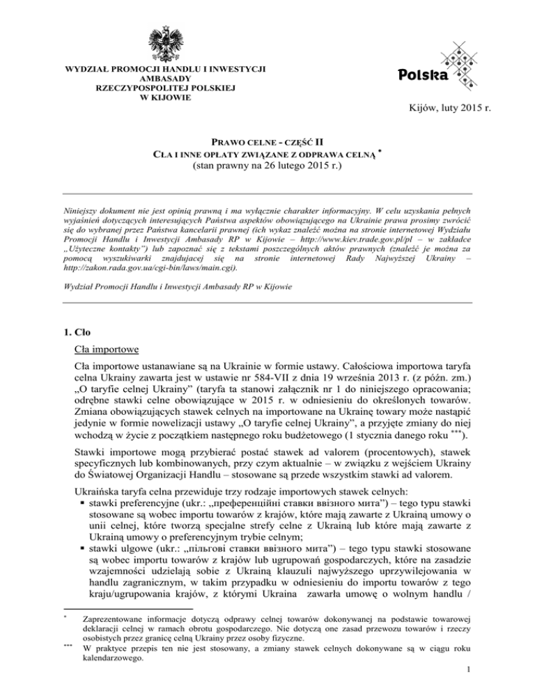 WYDZIAŁ PROMOCJI HANDLU I INWESTYCJI AMBASADY RZECZYPOSPOLITEJ POLSKIEJ W KIJOWIE Kijów, luty 2015 r. PRAWO CELNE - CZĘŚĆ II CŁA I INNE OPŁATY ZWIĄZANE Z ODPRAWA CELNĄ (stan prawny na 26 lutego 2015 r.) Niniejszy dokument nie jest opinią prawną i ma wyłącznie charakter informacyjny. W celu uzyskania pełnych wyjaśnień dotyczących interesujących Państwa aspektów obowiązującego na Ukrainie prawa prosimy zwrócić się do wybranej przez Państwa kancelarii prawnej (ich wykaz znaleźć można na stronie internetowej Wydziału Promocji Handlu i Inwestycji Ambasady RP w Kijowie – http://www.kiev.trade.gov.pl/pl – w zakładce „Użyteczne kontakty”) lub zapoznać się z tekstami poszczególnych aktów prawnych (znaleźć je można za pomocą wyszukiwarki znajdujacej się na stronie internetowej Rady Najwyższej Ukrainy – http://zakon.rada.gov.ua/cgi-bin/laws/main.cgi). Wydział Promocji Handlu i Inwestycji Ambasady RP w Kijowie 1. Cło Cła importowe Cła importowe ustanawiane są na Ukrainie w formie ustawy. Całościowa importowa taryfa celna Ukrainy zawarta jest w ustawie nr 584-VII z dnia 19 września 2013 r. (z późn. zm.) „O taryfie celnej Ukrainy” (taryfa ta stanowi załącznik nr 1 do niniejszego opracowania; odrębne stawki celne obowiązujące w 2015 r. w odniesieniu do określonych towarów. Zmiana obowiązujących stawek celnych na importowane na Ukrainę towary może nastąpić jedynie w formie nowelizacji ustawy „O taryfie celnej Ukrainy”, a przyjęte zmiany do niej wchodzą w życie z początkiem następnego roku budżetowego (1 stycznia danego roku ). Stawki importowe mogą przybierać postać stawek ad valorem (procentowych), stawek specyficznych lub kombinowanych, przy czym aktualnie – w związku z wejściem Ukrainy do Światowej Organizacji Handlu – stosowane są przede wszystkim stawki ad valorem. Ukraińska taryfa celna przewiduje trzy rodzaje importowych stawek celnych: stawki preferencyjne (ukr.: „преференційні ставки ввізного мита”) – tego typu stawki stosowane są wobec importu towarów z krajów, które mają zawarte z Ukrainą umowy o unii celnej, które tworzą specjalne strefy celne z Ukrainą lub które mają zawarte z Ukrainą umowy o preferencyjnym trybie celnym; stawki ulgowe (ukr.: „пільгові ставки ввізного мита”) – tego typu stawki stosowane są wobec importu towarów z krajów lub ugrupowań gospodarczych, które na zasadzie wzajemności udzielają sobie z Ukrainą klauzuli najwyższego uprzywilejowania w handlu zagranicznym, w takim przypadku w odniesieniu do importu towarów z tego kraju/ugrupowania krajów, z którymi Ukraina zawarła umowę o wolnym handlu / Zaprezentowane informacje dotyczą odprawy celnej towarów dokonywanej na podstawie towarowej deklaracji celnej w ramach obrotu gospodarczego. Nie dotyczą one zasad przewozu towarów i rzeczy osobistych przez granicę celną Ukrainy przez osoby fizyczne. W praktyce przepis ten nie jest stosowany, a zmiany stawek celnych dokonywane są w ciągu roku kalendarzowego. 1 Wydział Promocji Handlu i Inwestycji Ambasady RP w Kijowie umowę o unii celnej / umowę o preferencyjnym trybie celnym, zastosowanie będą miały stawki celne przewidziane w danej umowie (aktualnie tego typu rozwiązania mają zastosowanie przy imporcie towarów z wybranych krajów Wspólnoty Niepodległych Państw , Gruzji, Macedonii, krajów Europejskiego Stowarzyszenia Wolnego Handlu oraz Czarnogóry ); stawki pełne (ukr. „повні ставки ввізного мита”) – stosowane są wobec importu towarów z pozostałych krajów, stawki te będą miały również zastosowanie w przypadku nie przedstawienia certyfikatu pochodzenia towaru. W przypadku importu towarów z Polski (oraz innych krajów UE) aktualnie zastosowanie mają stawki ulgowe (ukr.: „пільгові ставки ввізного мита”) – co wynika z faktu przyznania sobie przez UE i Ukrainę klauzuli najwyższego uprzywilejowania we wzajemnym handlu (art. 10 ust 1. „Umowy o partnerstwie i współpracy pomiędzy Wspólnotami Europejskimi i ich krajami członkowskimi a Ukrainą”, podpisanej 14 czerwca 1994 r. w Luksemburgu, z późn. zm. i uzup.) oraz członkostwa Polski i Ukrainy w Światowej Organizacji Handlu. Cła eksportowe Cła eksportowe ustanawiane są w drodze przyjęcia odpowiedniej ustawy i wchodzą w życie w terminie przewidzianym w danej ustawie. Są one stosowane w odniesieniu do eksportu towarów objętych danym cłem niezależnie od kraju przeznaczenia tych towarów, za wyjątkiem eksportu do krajów, z którymi Ukraina ma podpisane umowy o wolnym handlu (w przypadku gdy umowy te przewidują zniesienie w/w ceł). Aktualnie cła eksportowe są stosowane w przypadku eksportu z Ukrainy następujących towarów: określonych rodzajów żywych zwierząt hodowlanych; określonych rodzajów skór zwierzęcych; określonych rodzajów nasion roślin oleistych; określonych rodzajów metali nieszlachetnych, złomu i odpadów z metali nieszlachetnych; określonych rodzajów gazu ziemnego. Szczegółowy wykaz towarów, w stosunku do których aktualnie ma zastosowanie cło eksportowe oraz wysokość stosowanej stawki cła eksportowego przedstawia załącznik nr 3. Сła sezonowe Cła sezonowe mogą być ustanawiane na importowane/eksportowane z Ukrainy towary, ale na okres nie krótszy niż 60 dni i nie dłuższy niż 120 dni kalendarzowych. Umowa o wolnym handlu pomiędzy krajami-członkami Wspólnoty Niepodległych Państw weszła w życie 20 września 2012 r., na dzień dzisiejszy umowę tę ratyfikowały Ukraina, Federacja Rosyjska, Białoruś, Kazachstan, Armenia i Mołdowa, finalizowany jest proces przystępowania Uzbekistanu do tej umowy. Szerzej na temat założeń tej umowy w informacji z dnia 13 sierpnia 2012 r. pt. „Nowa umowa o wolnym handlu pomiędzy krajami-członkami Wspólnoty Niepodległych Państw”, zamies