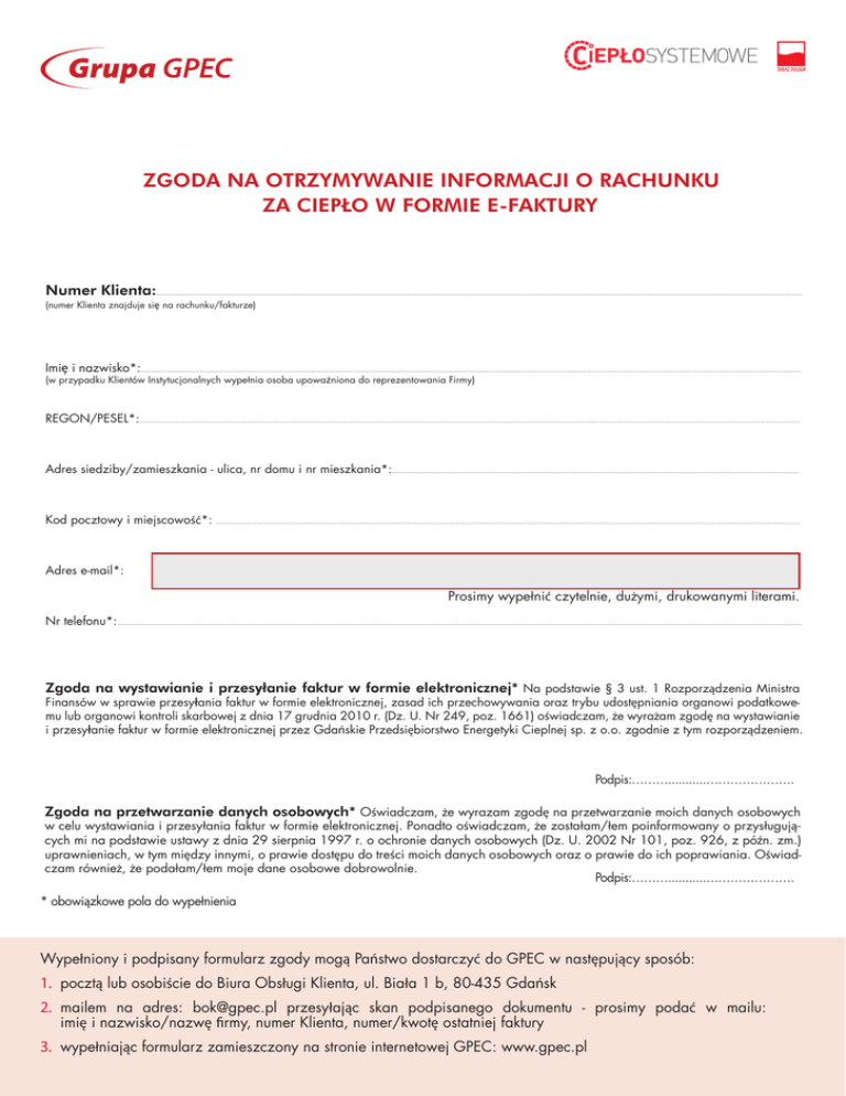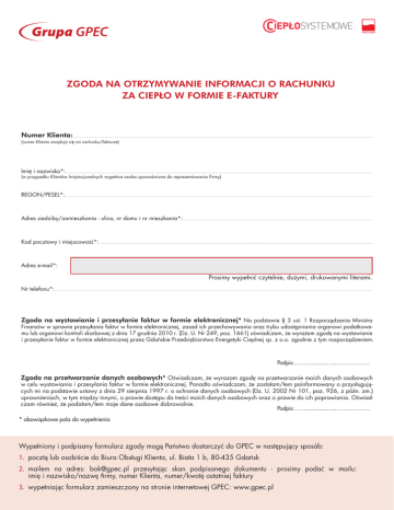ZGODA NA OTRZYMYWANIE INFORMACJI O RACHUNKU ZA CIEPŁO W FORMIE E-FAKTURY Numer Klienta:................................................................................................................................................................................................................................................................................................................ (numer Klienta znajduje siê na rachunku/fakturze) Imiê i nazwisko*:....................................................................................................................................................................................................................................................................................................................... (w przypadku Klientów Instytucjonalnych wypełnia osoba upowa¿niona do reprezentowania Firmy) REGON/PESEL*:....................................................................................................................................................................................................................................................................................................................... Adres siedziby/zamieszkania - ulica, nr domu i nr mieszkania*:................................................................................................................................................................................................ Kod pocztowy i miejscowość*: ................................................................................................................................................................................................................................................................................... Adres e-mail*: Prosimy wypełnić czytelnie, dużymi, drukowanymi literami. Nr telefonu*:.................................................................................................................................................................................................................................................................................................................................. Zgoda na wystawianie i przesyłanie faktur w formie elektronicznej* Na podstawie § 3 ust. 1 Rozporządzenia Ministra Finansów w sprawie przesyłania faktur w formie elektronicznej, zasad ich przechowywania oraz trybu udostępniania organowi podatkowemu lub organowi kontroli skarbowej z dnia 17 grudnia 2010 r. (Dz. U. Nr 249, poz. 1661) oświadczam, że wyrażam zgodę na wystawianie i przesyłanie faktur w formie elektronicznej przez Gdańskie Przedsiębiorstwo Energetyki Cieplnej sp. z o.o. zgodnie z tym rozporządzeniem. Podpis:………...........…………………. Zgoda na przetwarzanie danych osobowych* Oświadczam, że wyrazam zgodę na przetwarzanie moich danych osobowych w celu wystawiania i przesyłania faktur w formie elektronicznej. Ponadto oświadczam, że zostałam/łem poinformowany o przysługujących mi na podstawie ustawy z dnia 29 sierpnia 1997 r. o ochronie danych osobowych (Dz. U. 2002 Nr 101, poz. 926, z późn. zm.) uprawnieniach, w tym między innymi, o prawie dostępu do treści moich danych osobowych oraz o prawie do ich poprawiania. Oświadczam również, że podałam/łem moje dane osobowe dobrowolnie. Podpis:………...........…………………. * obowiązkowe pola do wypełnienia Wypełniony i podpisany formularz zgody mogą Państwo dostarczyć do GPEC w następujący sposób: 1. pocztą lub osobiście do Biura Obsługi Klienta, ul. Biała 1 b, 80-435 Gdańsk 2. mailem na adres: [email protected] przesyłając skan podpisanego dokumentu - prosimy podać w mailu: imię i nazwisko/nazwę firmy, numer Klienta, numer/kwotę ostatniej faktury 3. wypełniając formularz zamieszczony na stronie internetowej GPEC: www.gpec.pl