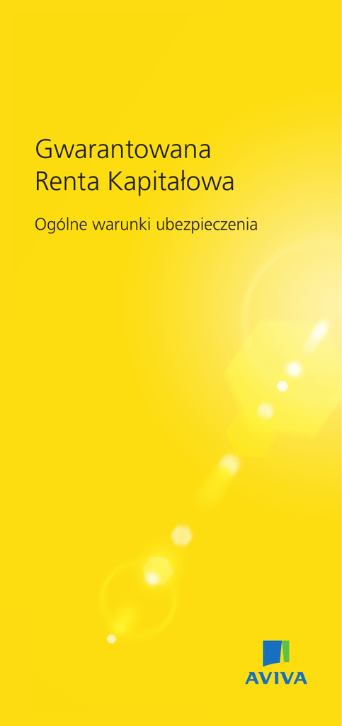 Gwarantowana Renta Kapitałowa Ogólne warunki ubezpieczenia OGÓLNE WARUNKI UBEZPIECZENIA GWARANTOWANEJ RENTY KAPITAŁOWEJ GRK/R/4/2007 § 1. DEFINICJE Ilekroć w niniejszych ogólnych warunkach ubezpieczenia, wniosku o zawarcie umowy ubezpieczenia na ich podstawie, dokumencie potwierdzającym zawarcie umowy ubezpieczenia oraz w innych oświadczeniach składanych w związku z zawarciem tej umowy lub w jej wykonaniu używa się wymienionych poniżej terminów, należy przez nie rozumieć w odpowiednim przypadku i liczbie: 1) gwarantowany okres płatności – określony w umowie ubezpieczenia okres, przez który Towarzystwo wypłaca świadczenie rentowe, niezależnie od tego, czy ubezpieczony pozostaje przy życiu; 2) OWU – niniejsze ogólne warunki ubezpieczenia; 3) polisa – dokument potwierdzający zawarcie umowy ubezpieczenia lub jej zmianę, doręczany ubezpieczającemu przez Towarzystwo; 4) rocznica ubezpieczenia – dzień rozpoczynający drugi i każdy kolejny rok obowiązywania umowy ubezpieczenia; 5) świadczenie rentowe – kwota, do której wypłaty zobowiązane jest Towarzystwo, w wysokości i terminach określonych w umowie ubezpieczenia; 6) Towarzystwo – Aviva Towarzystwo Ubezpieczeń na Życie Spółka Akcyjna; 7) ubezpieczający – osoba fizyczna, osoba prawna oraz jednostka organizacyjna niebędąca osobą prawną, lecz posiadająca zdolność prawną, która zawiera z Towarzystwem umowę ubezpieczenia; 8) ubezpieczony – osoba, na rzecz której jest zawierana umowa ubezpieczenia i która jest uprawniona, na warunkach opisanych w OWU, do otrzymywania świadczeń rentowych; 9) uposażony – osoba wskazana przez ubezpieczonego jako uprawniona do otrzymania, na warunkach opisanych w OWU, świadczeń rentowych w razie śmierci ubezpieczonego przez czas pozostający do upływu gwarantowanego okresu płatności; 10) uposażony zastępczy – osoba wskazana przez ubezpieczonego jako uprawniona do otrzymania, na warunkach opisanych w OWU, świadczeń rentowych w razie śmierci uposażonego przez czas pozostający do upływu gwarantowanego okresu płatności. 1 § 2. PRZEDMIOT I ZAKRES UBEZPIECZENIA Przez umowę ubezpieczenia zawartą na podstawie OWU Towarzystwo zobowiązuje się do regularnych wypłat dożywotniego lub czasowego świadczenia rentowego w wysokości i terminach określonych w umowie ubezpieczenia. § 3. ZAWARCIE UMOWY UBEZPIECZENIA 1. Umowa ubezpieczenia może być zawarta na rzecz jednej osoby – w przypadku czasowej życiowej renty kapitałowej lub dożywotniej renty kapitałowej, albo dwóch osób – w przypadku dożywotniej renty kapitałowej. 2. Umowa ubezpieczenia zawierana jest na czas określony w przypadku czasowej życiowej renty kapitałowej albo na czas nieokreślony – w przypadku dożywotniej renty kapitałowej. 3. W celu zawarcia umowy ubezpieczenia ubezpieczający składa pisemny wniosek na formularzu Towarzystwa. Do wniosku należy dołączyć urzędowy dokument potwierdzający wiek ubezpieczonego oraz wskazanie przez ubezpieczonego dwóch osób zobowiązanych do niezwłocznego powiadomienia Towarzystwa o śmierci ubezpieczonego, wraz z oświadczeniami tych osób o przyjęciu na siebie takiego obowiązku. W razie śmierci jednej z tych osób lub powstania trwałej przeszkody uniemożliwiającej wywiązanie się z powyższego zobowiązania, ubezpieczony jest zobowiązany do wskazania w miejsce tej osoby innej osoby, która powinna również złożyć oświadczenie, o którym mowa w zdaniu poprzedzającym. 4. Po zaakceptowaniu wniosku Towarzystwo, na podstawie informacji w nim zawartych, przedstawia ubezpieczającemu ofertę zawarcia umowy. Oferta jest ważna 14 (czternaście) dni od dnia jej doręczenia. 5. Umowa ubezpieczenia zostaje zawarta, jeżeli w okresie ważności oferty Towarzystwa ubezpieczający złoży pisemne oświadczenie o przyjęciu oferty oraz w tym okresie zostanie opłacona składka ubezpieczeniowa zgodnie z postanowieniami § 4. Umowę ubezpieczenia uważa się za zawartą z dniem otrzymania przez Towarzystwo powyższego oświadczenia ubezpieczającego, nie wcześniej jednak niż z dniem opłacenia składki ubezpieczeniowej. § 4. SKŁADKA UBEZPIECZENIOWA 1. Składka ubezpieczeniowa płatna jest jednorazowo w wysokości wybranej przez ubezpieczającego i wskazanej we wniosku ubezpieczeniowym, nie niższej niż składka minimalna określona przez Towarzystwo. 2. Z zastrzeżeniem ust. 3, składka powinna być opłacona wraz z przyjęciem przez ubezpieczającego oferty Towarzystwa – przelewem lub przekazem pocztowym na rachunek bankowy Towarzystwa lub w inny sposób uzgodniony z Towarzystwem. 2 3. Ubezpieczający może zobowiązać Towarzystwo do przekazania na poczet składki kwoty z tytułu wartości odstąpienia lub innego świadczenia ubezpieczeniowego należnego ubezpieczającemu na podstawie zawartej z Towarzystwem umowy ubezpieczenia. 4. W okresie obowiązywania umowy ubezpieczający może wpłacić składkę dodatkową w celu podwyższenia wysokości świadczenia rentowego. Podwyższenie wysokości podstawowego świadczenia rentowego odbywa się na warunkach uzgodnionych z Towarzystwem. § 5. CZASOWA ŻYCIOWA RENTA KAPITAŁOWA Okres i częstotliwość wypłacania świadczeń rentowych są określone w umowie ubezpieczenia, pod warunkiem że ubezpieczony dożył terminu płatności świadczenia rentowego, z zastrzeżeniem § 7 ust. 1. § 6. DOŻYWOTNIA RENTA KAPITAŁOWA 1. Świadczenia rentowe są płatne do końca życia ubezpieczonego z częstotliwością określoną w umowie ubezpieczenia, pod warunkiem że ubezpieczony dożył terminu płatności świadczenia rentowego, z zastrzeżeniem § 7 ust. 1. 2. Jeżeli umowa ubezpieczenia zostanie zawarta na rzecz dwóch ubezpieczonych, świadczenie rentowe jest wypłacane, jeżeli przynajmniej jeden z ubezpieczonych dożył terminu płatności świadczenia. Świadczenie rentowe dla ubezpieczonego pozostającego przy życiu wypłacane jest w dotychczasowej wysokoś