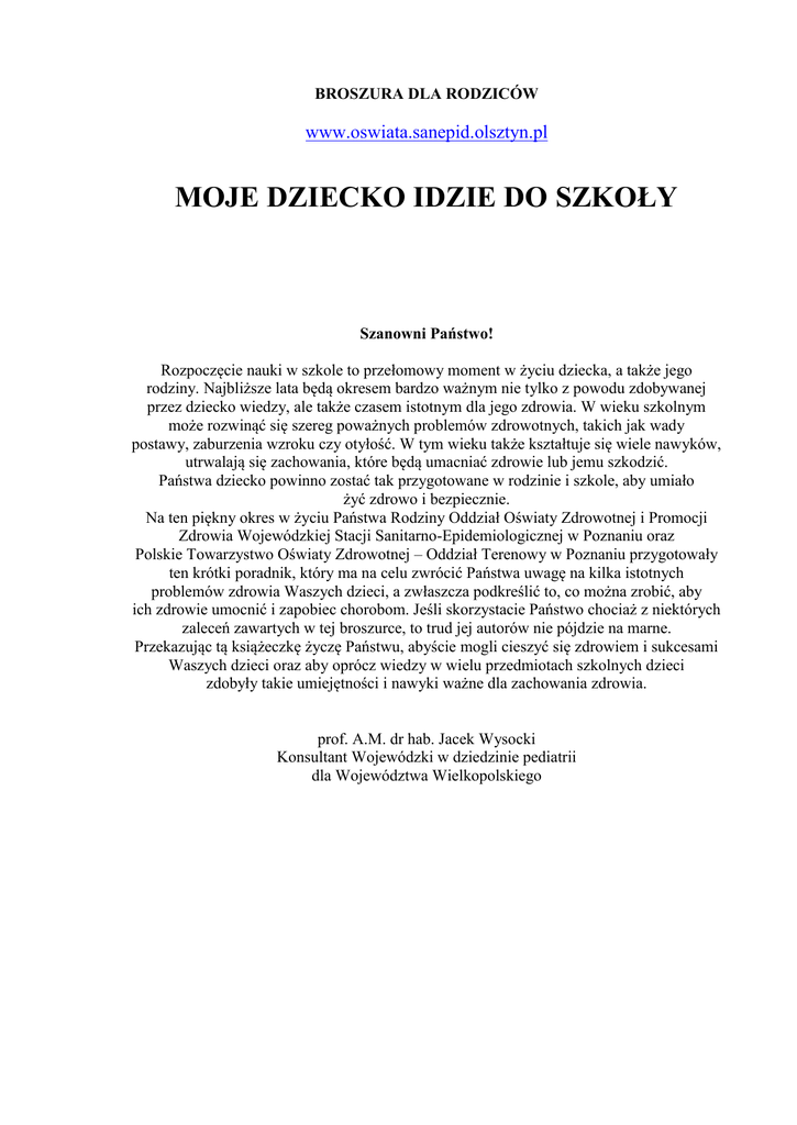 BROSZURA DLA RODZICÓW www.oswiata.sanepid.olsztyn.pl MOJE DZIECKO IDZIE DO SZKOŁY Szanowni Państwo! Rozpoczęcie nauki w szkole to przełomowy moment w życiu dziecka, a także jego rodziny. Najbliższe lata będą okresem bardzo ważnym nie tylko z powodu zdobywanej przez dziecko wiedzy, ale także czasem istotnym dla jego zdrowia. W wieku szkolnym może rozwinąć się szereg poważnych problemów zdrowotnych, takich jak wady postawy, zaburzenia wzroku czy otyłość. W tym wieku także kształtuje się wiele nawyków, utrwalają się zachowania, które będą umacniać zdrowie lub jemu szkodzić. Państwa dziecko powinno zostać tak przygotowane w rodzinie i szkole, aby umiało żyć zdrowo i bezpiecznie. Na ten piękny okres w życiu Państwa Rodziny Oddział Oświaty Zdrowotnej i Promocji Zdrowia Wojewódzkiej Stacji Sanitarno-Epidemiologicznej w Poznaniu oraz Polskie Towarzystwo Oświaty Zdrowotnej – Oddział Terenowy w Poznaniu przygotowały ten krótki poradnik, który ma na celu zwrócić Państwa uwagę na kilka istotnych problemów zdrowia Waszych dzieci, a zwłaszcza podkreślić to, co można zrobić, aby ich zdrowie umocnić i zapobiec chorobom. Jeśli skorzystacie Państwo chociaż z niektórych zaleceń zawartych w tej broszurce, to trud jej autorów nie pójdzie na marne. Przekazując tą książeczkę życzę Państwu, abyście mogli cieszyć się zdrowiem i sukcesami Waszych dzieci oraz aby oprócz wiedzy w wielu przedmiotach szkolnych dzieci zdobyły takie umiejętności i nawyki ważne dla zachowania zdrowia. prof. A.M. dr hab. Jacek Wysocki Konsultant Wojewódzki w dziedzinie pediatrii dla Województwa Wielkopolskiego Przygotowanie dziecka do szkoły - co zrobić, aby dziecko cieszyło się, że idzie do szkoły? Większość dzieci w wieku 6-7 lat uwielbia się bawić. Podczas zabawy w grupie dzielą się rolami, wymyślają scenariusze odtwarzające w mniejszym bądź większym stopniu rzeczywistość. Potrafią wyrażać swoje zdanie, argumentować i spierać się. Są ciekawe świata, zadają pytania. Dojrzałość układu nerwowego przejawiająca się w zdolnościach do myślenia, systematycznego uczenia się, skupiania uwagi świadczy o gotowości do podjęcia nauki w szkole. Nauka w szkole stanowi dla dziecka ogromne wyzwanie, może być źródłem stresu, niepokoju, a pierwsze niepowodzenia - na gruncie zadań szkolnych czy kontaktów z rówieśnikami - mogą wpłynąć znacząco na dalsze życie i rozwój człowieka. Ważne jest, aby Rodzice pomagali dzieciom pokonać trudności i przygotowali je do nauki w szkole. Pierwszym i zasadniczym źródłem stresu dla dziecka jest nowość miejsca - klasy, nauczycielki, innych dzieci, brak wiedzy na temat tego, co będzie się działo w szkole. Napięcie i lęk są często wzmagane przez starsze dzieci albo innych dorosłych, którzy straszą dziecko szkołą , mówiąc „teraz skończyło się dzieciństwo”, „koniec zabawy” itp. Najlepiej byłoby przed rozpoczęciem nauki pozytywnie wyrażać się o szkole, opowiadać dziecku że nauczy się tam bardzo dużo o świecie, o tym, jak skonstruowane są maszyny, skąd się biorą wulkany, co to są dinozaury itp. Początek szkoły jest trudny również dlatego, że część dzieci po raz pierwszy rozstaje się na dłuższy czas z Rodzicami. Może to wzbudzać u dziecka lęk. Warto już wcześniej przyzwyczajać dziecko do rozstań, zawsze umawiając się na określoną godzinę powrotu, a potem dotrzymywać umowy. Po pewnym czasie chodzenia do szkoły np. dwóch tygodniach, można dziecko odbierać później, ale zawsze powinno wiedzieć o której godzinie. Pewność siebie buduje u dzieci także przekonanie, że już coś umieją. Jedną z ważniejszych umiejętności, z którą dziecko powinno przyjść do szkoły jest samodzielność – w jedzeniu, ubieraniu, myciu się itp. Dzięki temu dziecko nigdy nie będzie ostatnie i nie będzie oceniać siebie negatywnie. Poczucie kompetencji wzmacnia dziecko w relacjach rówieśniczych. Należy zatem zachęcać je do nawiązywania przyjaźni w klasie, wspólnej zabawy, a nie tylko rywalizacji i walki np. o zabawki. Początki nauki w szkole zawsze są dla dziecka sytuacją trudną. Prędzej czy później będzie narażone na niepowodzenia –w kontaktach z innymi dziećmi, nauczycielem, który nie zawsze dostrzeże zaangażowanie dziecka, czy też czegoś po prostu nie będzie umiało. Rodzice powinni pamiętać o rozmowie z dzieckiem, pytać je często o to co robi, się zdarzyło. Warto przyzwyczaić je do tego typu rozmowy jeszcze przed rozpoczęciem nauki. Dzięki temu można rozpoznać niepokojące stany emocjonalne i wesprzeć dziecko, pocieszyć je, podpowiedzieć nowe sposoby rozwiązania trudności. Najważniejsze jest jednak przyjęcie przez Rodziców podstawowego założenia, że początki szkoły są trudne. Prędzej czy później dziecko napotka trudności. Emocje wówczas pojawiające się są prawdziwe, a zadaniem Rodzica jest udzielenie dziecku pomocy i wsparcia. Gdy po upływie miesiąca nauki dziecko nadal ma problemy z adaptacją, pojawią się nowe zachowania np. agresja lub nauczyciel zauważy trudności w opanowaniu materiału szkolnego wówczas warto zastanowić się nad wizytą u psychologa. Specjalista zdiagnozuje przyczyny trudności szkolnych i wdroży określone działania. Pamiętajmy ! Dobry start szkolny ma zasadnicze znaczenie dla dalszej edukacji, która może trwać kolejne 16 lat lub nawet dłużej. Dziecko pozytywnie nastawione do nauki chętniej będzie się uczyło i cieszyło z każdej nowej informacji. Zdrowe odżywianie dziecka w wieku szkolnym Każdy rodzic troszczy się o swoje dziecko najlepiej jak potrafi. Wiedząc, że rozwijający się młody organizm potrzebuje szczególnej opieki i troski, w naturalny sposób zwracamy uwagę na to co i kiedy zjada nasze dziecko. Niestety nie wystarczy postanowić sobie – „od dziś karmię moje dziecko zgodnie z najnowszymi don