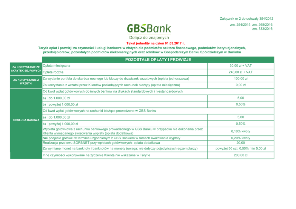 Załącznik nr 2 do uchwały 354/2012 zm. 254/2015; zm. 268/2016; zm. 333/2016; Tekst jednolity na dzień 01.03.2017 r. Taryfa opłat i prowizji za czynności i usługi bankowe w złotych dla podmiotów sektora finansowego, podmiotów instytucjonalnych, przedsiębiorców, pozostałych podmiotów niekomercyjnych oraz rolników w Gospodarczym Banku Spółdzielczym w Barlinku POZOSTAŁE OPŁATY I PROWIZJE ZA KORZYSTANIE ZE SKRYTEK SEJFOWYCH ZA KORZYSTANIE Z WRZUTNI Opłata miesięczna 30,00 zł + VAT Opłata roczna 240,00 zł + VAT Za wydanie portfela do skarbca nocnego lub kluczy do drzwiczek wrzutowych (opłata jednorazowa) Za korzystanie z wrzutni przez Klientów posiadających rachunek bieżący (opłata miesięczna) 100,00 zł 0,00 zł Od kwot wpłat gotówkowych do innych banków na drukach standardowych i niestandardowych a) do 1.000,00 zł b) powyżej 1.000,00 zł 5,00 0,50% Od kwot wpłat gotówkowych na rachunki bieżące prowadzone w GBS Banku OBSŁUGA KASOWA a) do 1.000,00 zł b) powyżej 1.000,00 zł Wypłata gotówkowa z rachunku bankowego prowadzonego w GBS Banku w przypadku nie dokonania przez Klienta wymaganego awizowania wypłaty (opłata dodatkowa) Nie podjęcie gotówki w terminie uzgodnionym z GBS Bankiem w ramach awizowania wypłaty Realizacja przelewu SORBNET przy wpłatach gotówkowych- opłata dodatkowa Za wymianę monet na banknoty i banknotów na monety (uwaga: nie dotyczy pojedyńczych egzemplarzy) Inne czynności wykonywane na życzenie Klienta nie wskazane w Taryfie 5,00 0,50% 0,10% kwoty 0,20% kwoty 20,00 powyżej 50 szt. 0,50% min 5,00 zł 200,00 zł POZOSTAŁE OPŁATY I PROWIZJE Sporządzenie opinii o Kliencie (posiadanie rachunku, saldo, obroty na rachunku, historia kredytu, stan zadłużenia, obsługa kredytu, zajęcia na rachunku i inne) 150,00 zł Dokonanie wypłaty z konta "Uznania do wyjaśnienia" 10,00 zł Opłata za prowadzenie obsługi zastępczej bezgotówkowej oraz przyjmowanie wpłat lub wypłat na rachunki lub z rachunku Klienta (opłata pobierana raz w miesiącu) INNE USŁUGI a) do 50,00 zł 4,00% b) do 100,00 zł 2,00% c) do 200,00 zł 1,00% d) do 300,00 zł 0,70% e) powyżej 300,00 zł 0,50% Za wydanie na żądanie Posiadacza rachunku lokat terminowych zaświadczenia (w jednym egzemplarzu): a) zaświadczenie o posiadaniu rachunku lokat terminowych b) INNE USŁUGI zaświadczenia: o obrotach, o stanie rachunku lokat terminowych za wyjątkiem zaświadczeń związanych z realizacją i zabezpieczeniem umów kredytowych w GBS Banku 50,00 zł c) za każdy kolejny egzemplarz 20,00 zł Za wydanie na żądanie Klienta różnego rodzaju zaświadczeń i ich duplikatów nie wymienionych we wcześniejszych punktach taryfy opłat i prowizji 50,00 zł Opłata za weryfikację tożsamości Klienta przy ubieganiu się o certyfikat kwalifikowany (za każdą osobę) 20,00 zł Opłata za weryfikację tożsamości Klienta wynikającą ze zmiany danych dotyczących Klienta (za każdą osobę) 20,00 zł Opłata za weryfikację tożsamości Klienta niezbędną przy odnowieniu certyfikatu kwalifikowanego (za każdą osobę) 20,00 zł Instalacja i konfiguracja czytnika i aplikacji do użytkowania podpisu elektronicznego (za każdą godzinę) Wypełnianie wniosków o wpis do ewidencji producentów rolnych (opłata za każdy wniosek) a) posiadaczy rachunku bieżącego w GBS Banku b) pozostałych Klientów PUNKT DORADZTWA UNIJNEGO 20,00 zł 70,00 zł + koszty dojazdu 10,00 zł 15,00 zł Dostarczenie wypełnionych wniosków o wpis do ewidencji producentów rolnych do Biura Powiatowego ARiMR a) posiadaczy rachunku bieżącego w GBS Banku 10,00 zł b) pozostałych Klientów Usługi konsultacyjne w zakresie wypełniania wniosków (opłata za 1 godzinę) 15,00 zł a) posiadaczy rachunku bieżącego w GBS Banku b) pozostałych Klientów 30,00 zł 50,00 zł Opłata od obrotów pobierana pierwszego dnia po zakończeniu miesiąca 1,00% od obrotów Opłata od ilości sztuk pobierana pierwszego dnia po zakończeniu miesiąca (stawka za 1 szt.) RACHUNKI MASOWE a) do 2.000 szt. 2,00 zł b) od 2.001 szt. do 3.000 szt. 1,50 zł c) od 3.001 szt. do 4.000 szt. 1,20 zł d) od 4.001 szt. do 5.000 szt. 1,00 zł e) od 5.001 szt. do 10.000 szt. 0,80 zł f) 0,50 zł od 10.001 szt.