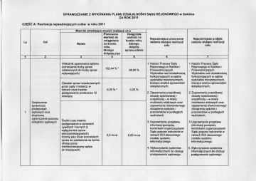SPRAWOZDANIE Z WYKONANIA PLANU DZIAŁALNOŚCI SĄDU REJONOWEGO w Sokółce ZA ROK 2011 CZĘŚĆ A: Realizacja n a j w a ż n i e j s z y c h c e l ó w w r o k u 2011 Lp Cel 1 2 1 Zwiększenie sprawności postępowań sądowych oraz stopniowe ograniczenie poziomu zaległości sądowych Mierniki określające stopień realizacji celu Planowana Osiągnięta wartość do wartość na osiągnięcia koniec roku, na koniec którego Nazwa roku, dotyczy którego sprawozdanie dotyczy plan 4 5 3 Wskaźnik opanowania wpływu (odniesienie liczby spraw załatwionych do liczby spraw wpływających) 102,44%* Odsetek spraw rozpatrywanych przez sądy I instancji, w których czas trwania postępowania przekracza 12 miesięcy 0,25 % * Średni czas trwania postępowania w sprawach cywilnych i karnych (z wyłączeniem spraw wieczystoksięgowych) liczony jako iloraz pozostałych spraw do załatwienia na koniec okresu przez średniomiesięczny wpływ (w miesiącach) 0,5 m-ca 98,85 % 0,33 % 0,83 m-ca Najważniejsze planowane zadania służące realizacji celu Najważniejsze podjęte zadania służące realizacji celu 6 7 1. Nadzór Prezesa Sądu Rejonowego w Sokółce i Przewodniczących Wydziałów nad działalnością funkcjonujących w sądzie wydziałów merytorycznych, bieżąca analiza sprawozdań statystycznych; 1. Nadzór Prezesa Sądu Rejonowego w Sokółce i Przewodniczących Wydziałów nad działalnością funkcjonujących w sądzie wydziałów merytorycznych, bieżąca analiza sprawozdań statystycznych; 2. Zapewnienie prawidłowej obsady sędziowskiej i urzędniczej - w miarę możliwości etatowych oraz zapewnienie równomiernego obciążenia sędziów i pracowników w podległych wydziałach; 2. Zapewnienie prawidłowej obsady sędziowskiej i urzędniczej - w miarę możliwości etatowych oraz zapewnienie równomiernego obciążenia sędziów i pracowników w podległych wydziałach; 3. Usprawnienie przepływu informacji pomiędzy komórkami organizacyjnymi Sądu poprzez wdrożenie w ramach BOI stosownego modułu systemu informatycznego. 3. Usprawnienie przepływu informacji pomiędzy komórkami organizacyjnymi Sądu poprzez wdrożenie w ramach BOI stosownego modułu systemu informatycznego. 4. Wykorzystanie systemów informatycznych do obsługi postępowania sądowego. 4. Wykorzystanie systemów informatycznych do obsługi postępowania sądowego. Planowana liczba ksiąg wieczystych zapisanych w Centralnej Bazie Danych na koniec 2011r 2 19 000 30 581 1. Zapewnienie stałej aktualizacji danych i informacji udostępnianych na stronie internetowej sądu; 2.Wdrożenie elektronicznego sposobu wnoszenia opłat sądowych po wejściu w życie odpowiednich zmian ustawodawczych; Ułatwienie dostępu obywateli do wymiaru sprawiedliwości oraz wzmacnianie ochrony prawnej obywateli 3. Propagowanie alternatywnych metod rozwiązywania sporów (mediacje); 4. Uczestnictwo w kampaniach edukacyjnych i informacyjnych na temat funkcjonowania wymiaru sprawiedliwości (prezentacja broszur i poradników). 1. Zapewnienie stałej aktualizacji danych i informacji udostępnianych na stronie internetowej sądu; 2. Propagowanie alternatywnych metod rozwiązywania sporów (mediacje); 3. Uczestnictwo w kampaniach edukacyjnych i informacyjnych na temat funkcjonowania wymiaru sprawiedliwości (prezentacja broszur i poradników). * planowana wartość mierników na koniec roku została skorygowana zgodnie z założeniami przyjętymi do budżetu zadaniowego na 201 lr w naszej jednostce. CZĘŚĆ D: Informacje dotyczące realizacji celów objętych planem działalności na 2011 r Zakładany poziom mierników nie został osiągnięty z uwagi na - zmniejszenie ilości etatów orzeczniczych z 13 do 12 etatów zgodnie z decyzją Prezesa Sądu Okręgowego z dnia 19.01.2011r oraz wakatem w tej grupie od dnia 01.05.2011r; - zwiększonym wpływem spraw (kategorii Ns o symbolu 251 w I Wydziale Cywilnym ) w ostatnich dniach miesiąca grudnia; - wzrostem udziału spraw z elementem zagranicznym, w których czas trwania postępowania uzależniony jest od skutecznego doręczania wezwań stronom ; zamieszkałym za granicą oraz zwiększającą się ilością spraw karnych w których postępowanie jest zawieszane w związku z poszukiwaniem oskarżonych ENA. Podstawą prawną sporządzenia sprawozdania z wykonania planu działalności jest § 7 ust 14 Komunikatu Nr 1/11 /OB Ministra Sprawiedliwości z dnia 16.11.2011r w sprawie szczegółowych wytycznych w zakresie kontroli zarządczej dla działu administracji rządowej - sprawiedliwość, zgodnie z którym do 3 kwietnia każdego roku jest sporządzane sprawozdanie z wykonania planu działalności za rok poprzedni. Kierownik Finansowy Sądu Rejonowego w Sokółce Data : 03.04.2012r Iwona Gudi Gąsowski