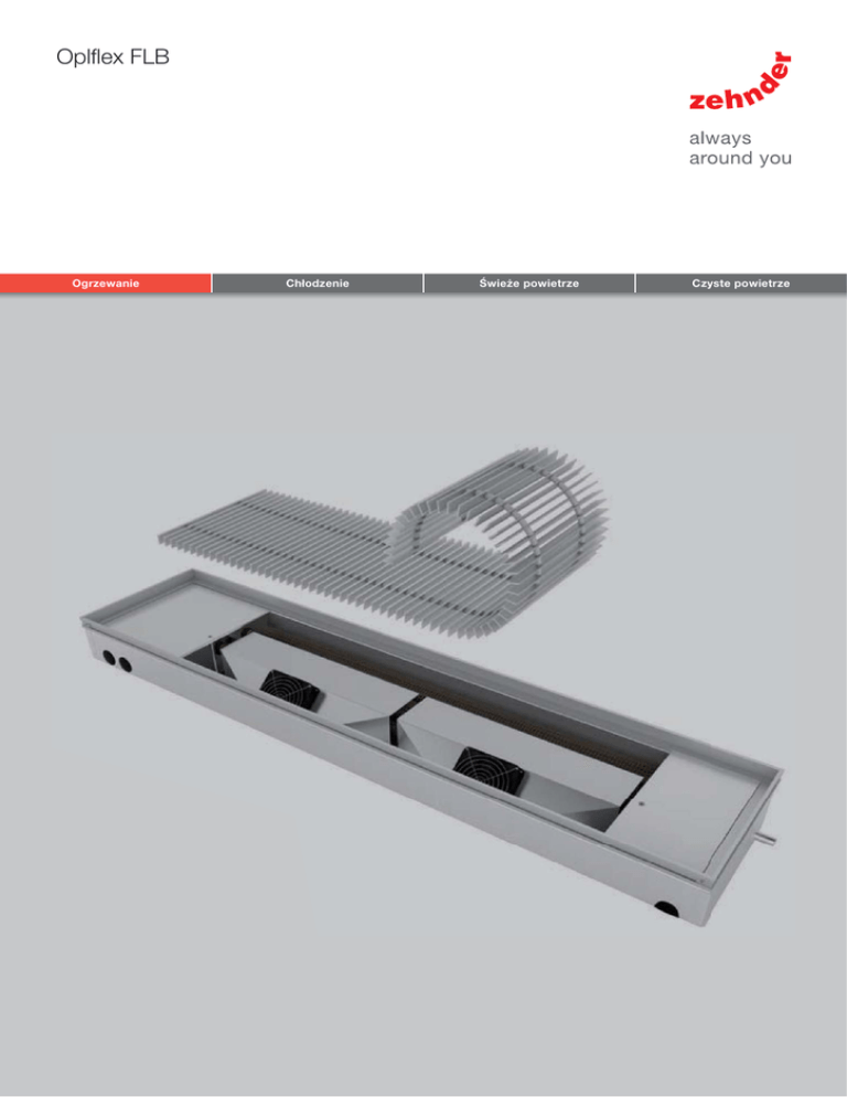 Oplflex FLB Ogrzewanie Chłodzenie Świeże powietrze Czyste powietrze Oplflex FLB Dynamic Dynamic FCT 24 DC Oplflex FLB Grzejnik kanałowy do wilgotnego środowiska - basenów, ogrodów zimowych itd. Odporny na krótkotrwałe zalanie, odprowadzanie wilgoci otworem do odprowadzania kondensatu. Materiał odporny na działanie czynników właściwych dla środowiska wilgotnego. Wymiary i przekroje Oplflex FLB FLB 20-12 2 Oplflex FLB FLB 20-12 Aby uzyskać wartość mocy przy parametrach 90/70/20 należy pomnożyć wartość mocy grzewczej przy 75/65/20 przez współczynnik korekcji 1,21, analogicznie dla 55/45/20 współczynnik korekcji wynosi 0,59. Ti – temperatura w pomieszczeniu Standardowe wyposażenie grzejnika Zakres dostawy: - wanna grzejnika ze stali nierdzewnej DIN 1,4404 gr. 1 mm z odprowadzeniem kondensatu wewnątrz lakierowana na kolor czarny matt, materiał odporny na środowisko agresywne - górna ramka okalająca z anodyzowanego aluminium - krata górna (grill) ze standardowej oferty zehnder wg specyfikacji klienta - wysokowydajny wymiennik spiralny Cu-Cu lakierowany na kolor czarny matt z zaworem odpowietrzającym - listwa zaciskowa złącz el. 12V DC - wentylatory punktowe 12V odporne na chwilowe zalanie wodą - połączenia gwintowane z funkcją odcięcia (prosty i kątowy) - blacha osłaniająca podłączenia C.O. - śruby poziomujące - montażowa płyta wiórowa (zabezpieczenie) - instrukcja montażowa - opakowanie transportowe 3 Kratki Oplflex Kratki aluminiowe (wliczone w cenę) Kratki linearne Kratka linearna: aluminium naturalne Ramka: aluminium naturalne Tuleje dystansowe: szare Kratka linearna: brąz Ramka: brąz Tuleje dystansowe: czarne Kratka linearna: czarny Ramka: czarny Tuleje dystansowe: czarny Kratka rolowana: brąz Ramka: brąz Tuleje dystansowe: czarny Kratka rolowana: czarny Ramka: czarny Tuleje dystansowe: czarny Kratki rolowane Kratka rolowana: aluminium naturalne Ramka: aluminium naturalne Tuleje dystansowe: szare Kratki drewniane (wliczone w cenę) Kratki rolowane Kratka rolowana: buk naturalny Ramka: aluminium naturalne Tuleje dystansowe: beżowe Kratka rolowana: buk bejcowany Ramka: brąz Tuleje dystansowe: czarny Kratka rolowana: dąb naturalny Ramka: aluminium naturalne Tuleje dystansowe: beżowe Kratka ze stali nierdzewnej (dostępna za dodatkową opłatą) Kratka rolowana Kratka: Stal szlachetna Inox Ramka: aluminium naturalne Tuleje dystansowe: szare Zehnder Polska Sp. z o.o. · ul. Kurpiów 14a · 52-214 Wrocław · Polska T +48 71 367-64-24 · F +48 71 367-64-25 · [email protected] · www.zehnder.pl Kratka rolowana: dąb bejcowany Ramka: brąz Tuleje dystansowe: czarny