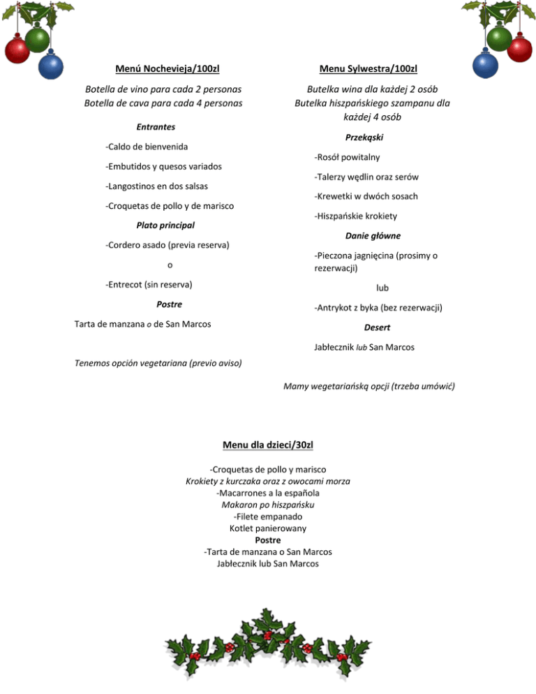 Menú Nochevieja/100zl Menu Sylwestra/100zl Botella de vino para cada 2 personas Botella de cava para cada 4 personas Entrantes Butelka wina dla każdej 2 osób Butelka hiszpańskiego szampanu dla każdej 4 osób Przekąski -Caldo de bienvenida -Rosół powitalny -Embutidos y quesos variados -Talerzy wędlin oraz serów -Langostinos en dos salsas -Krewetki w dwóch sosach -Croquetas de pollo y de marisco -Hiszpańskie krokiety Plato principal Danie główne -Cordero asado (previa reserva) -Pieczona jagnięcina (prosimy o rezerwacji) o -Entrecot (sin reserva) lub Postre -Antrykot z byka (bez rezerwacji) Tarta de manzana o de San Marcos Desert Jabłecznik lub San Marcos Tenemos opción vegetariana (previo aviso) Mamy wegetariańską opcji (trzeba umówić) Menu dla dzieci/30zl -Croquetas de pollo y marisco Krokiety z kurczaka oraz z owocami morza -Macarrones a la española Makaron po hiszpańsku -Filete empanado Kotlet panierowany Postre -Tarta de manzana o San Marcos Jabłecznik lub San Marcos