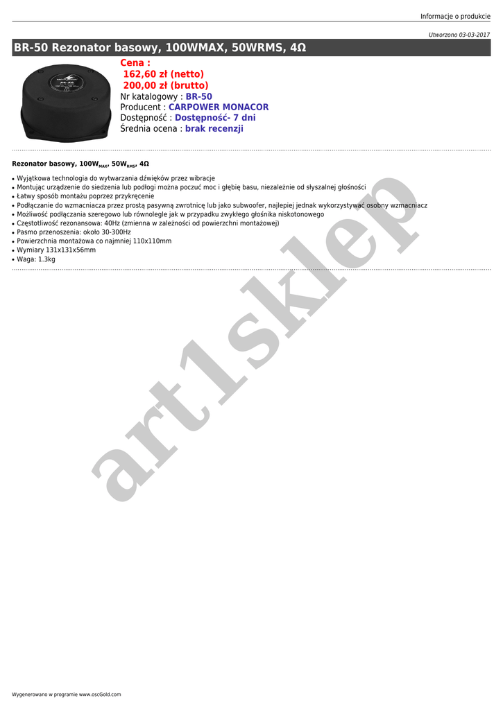 Informacje o produkcie Utworzono 03-03-2017 BR-50 Rezonator basowy, 100WMAX, 50WRMS, 4Ω Cena : 162,60 zł (netto) 200,00 zł (brutto) Nr katalogowy : BR-50 Producent : CARPOWER MONACOR Dostępność : Dostępność- 7 dni Średnia ocena : brak recenzji Rezonator basowy, 100WMAX, 50WRMS, 4Ω ● ● ● ● ● ● ● ● ar t1 sk ● Wyjątkowa technologia do wytwarzania dźwięków przez wibracje Montując urządzenie do siedzenia lub podłogi można poczuć moc i głębię basu, niezależnie od słyszalnej głośności Łatwy sposób montażu poprzez przykręcenie Podłączanie do wzmacniacza przez prostą pasywną zwrotnicę lub jako subwoofer, najlepiej jednak wykorzystywać osobny wzmacniacz Możliwość podłączania szeregowo lub równolegle jak w przypadku zwykłego głośnika niskotonowego Częstotliwość rezonansowa: 40Hz (zmienna w zależności od powierzchni montażowej) Pasmo przenoszenia: około 30-300Hz Powierzchnia montażowa co najmniej 110x110mm Wymiary 131x131x56mm Waga: 1.3kg le p ● Wygenerowano w programie www.oscGold.com