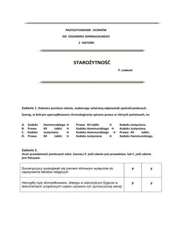 PRZYGOTOWANIE UCZNIÓW DO EGZAMINU GIMNAZJALNEGO Z HISTORII STAROŻYTNOŚĆ P. Ledwoń Zadanie 1. Dokończ poniższe zdanie, wybierając właściwą odpowiedź spośród podanych. Szereg, w którym uporządkowano chronologicznie spisane prawa w różnych państwach, to: A. B. C. D. Kodeks Prawo Kodeks Prawo Hammurabiego → XII tablic → Justyniana → XII tablic → Prawo XII tablic → Kodeks Hammurabiego → Kodeks Hammurabiego → Kodeks Justyniana → Kodeks Justyniana. Kodeks Justyniana. Prawo XII tablic. Kodeks Hammurabiego. Zadanie 2. Oceń prawdziwość poniższych zdań. Zaznacz P, jeśli zdanie jest prawdziwe, lub F, jeśli zdanie jest fałszywe. Sumeryjczycy posługiwali się pismem klinowym wyłącznie do zapisywania tekstów religijnych P F Hieroglify były skomplikowane, dlatego w starożytnym Egipcie w dokumentach urzędowych często używano ich uproszczonej wersji P F Tekst do zadania 3. Był naczelnym wodzem i najwyższym kapłanem, uznawanym za wcielenie boga Horusa. Zarządzał państwem przy pomocy urzędników, dowódców wojskowych i kapłanów. Zadanie 3. Dokończ poniższe zdanie, wybierając właściwą odpowiedź spośród podanych. W tekście opisano zakres władzy należący do monarchy panującego w starożytności oznaczonym numerem: A. 1. B. 2. C. 3. na obszarze D. 4. Tekst do zadania 4. Proces przemian rozpoczął się ok. 10 tysięcy lat p.n.e. w kilku rejonach Bliskiego Wschodu i południowej Azji. Niósł ze sobą zmiany w gospodarce, technice i organizacji społecznej. Zastosowano nowe metody wytwarzania żywności poprzez wykorzystanie dziko rosnących zbóż i innych roślin, a następnie ich uprawę. Udomowiono dzikie zwierzęta. Do obróbki narzędzi zaczęto stosować technikę szlifowania. Gruntowne przemiany gospodarcze wymusiły osiadły tryb życia. Po upływie kilku tysiącleci zaczęła również rozwijać się metalurgia. Zadanie 4. Oceń, które z poniższych zdań odnoszących się do skutków przemian w życiu człowieka jest prawdziwe. Zaznacz P przy zdaniu prawdziwym. 1. W wyniku przemian, które opisano w tekście, tryb życia zmienił się na koczowniczy. 2. W wyniku przemian, które opisano w tekście, doszło do powstania osiadłych wspólnot rolników. 3. W wyniku przemian, które opisano w tekście, wykształciły się pierwsze organizacje zbieracko-łowieckie. P P P Mapy do zadania 5. I 6. Zadanie 5. Dokończ poniższe zdanie – wybierz właściwą odpowiedź spośród podanych. Obie mapy informują, że początki rolnictwa związane są z obszarem: A. Afryki Południowej. B. Europy Zachodniej. C. Bliskiego Wschodu. D. basenu Morza Czarnego. Zadanie 6. Dokończ poniższe zdanie – wybierz właściwą odpowiedź spośród podanych. Okres, w którym kultura neolityczna pojawiła się na terenie Egiptu, oznaczony jest na taśmie chronologicznej numerem A. 1 B. 2 C. 3 D. 4 Zadanie 7. Jakie państwo leży dzisiaj na terenach starożytnej Mezopotamii? A. Irak B. Indie C. Izrael D. Turcja Zadanie 8. Tutanchamon władał Egiptem w XIV w. p.n.e., czyli: A. Pomiędzy 1500 a 1401 pne C. 1400 lat temu B. pomiędzy 1400 a 1301pne D. ponad 3500 lat temu Zadanie 9. Słowa „na naszej ziemi po raz pierwszy zastosowano koło” mógł wypowiedzieć przedstawiciel ludu: A. Fenickiego B. izraelskiego C. babilońskiego D. egipskiego Zadanie 10. Wybierz cywilizację, dla której charakterystyczne są budowle przedstawione na ilustracjach, i wskaż uzasadnienie wyboru spośród podanych. Zaznacz literę A albo B oraz numer 1, 2 albo 3. Mapa do zadania 11. Tekst do zadania 11. Jednostka od urodzenia podporządkowana była nieubłaganym prawom państwowym. O życiu bowiem nowo narodzonego dziecka decydowało państwo; jedynie zdrowe dzieci miały prawo do życia, natomiast słabe, ułomne, porzucano w górach. Te twarde prawa stosowano w dalszym życiu młodzieży, zwłaszcza wobec chłopców. Pozostawali oni tylko do siódmego roku życia w domu, później, aż do podeszłego wieku męskiego (50–60 lat), pędzili tryb życia obozowego. Cały wolny czas spędzali na ćwiczeniach wojskowych. W ten sposób zahartowani, przyzwyczajeni do krótkich, jasnych odpowiedzi (zwanych lakonicznymi od starej nazwy kraju, Lakonii), z pogardą śmierci szli do walki. Zadanie 12. Dokończ poniższe zdanie – wybierz właściwą odpowiedź spośród podanych. Opisany system wychowania chłopców dotyczy państwa-miasta położonego na obszarze A. Tesalii. C. Peloponezu. B. Azji Mniejszej. D. Macedonii. Zadanie 13. W którym szeregu zapisano w poprawnej kolejności nazwy religii, zaczynając od tej religii, która pojawiła się na świecie najwcześniej, kończąc na tej, która pojawiła się najpóźniej? A. judaizm, islam, chrześcijaństwo, buddyzm B. buddyzm, islam, judaizm, chrześcijaństwo C. judaizm, buddyzm, chrześcijaństwo, islam D. chrześcijaństwo, islam, judaizm, buddyzm Teksty do zadania 14. 1. Polski Komitet Olimpijski ogłosił skład reprezentacji na Igrzyska Olimpijskie, które odbędą się w Londynie. Wśród sportowców znaleźli się: Otylia Jędrzejczak, Tomasz Majewski i Mateusz Kusznierewicz. 2. Powrót antycznej tragedii na deski Teatru Miejskiego w Gdyni wypadł imponująco. Publiczność gorącymi brawami nagrodziła aktorów i reżysera spektaklu. Owacjom nie było końca. 3. Prawo nie działa wstecz, nieznajomość prawa szkodzi, umów należy dotrzymywać, gdzie społeczeństwo tam prawo – to kilka zasad prawniczych, które omówiono w czasie wykładu na temat Łacińskie sentencje prawnicze a polski wymiar sprawiedliwości. 4. Kilka dni temu odbył się tatarski festyn w Kruszynianach na Podlasiu. Ważnym elementem obchodów było muzułmańskie nabożeństwo, które odbyło się w tamtejszym zabytkowym meczecie. Zadanie 15. Dokończ poniższe zdanie – wybierz właściwą odpowiedź spośród podanych. Opisy przedstawiające przykłady współczesnej kultury na ziemiach polskich wywodzące się z tradycji starożytnej Gr