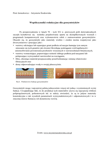 Piotr Jermołowicz – Inżynieria Środowiska Współczynniki redukcyjne dla geosyntetyków Po przeprowadzeniu w latach 70 – tych XX w. pierwszych prób doświadczalnych zaczęła kształtować się technika projektowania oparta na skomplikowanych wzorach i programach komputerowych oraz wykonawstwie robót z zastosowaniem geosyntetyków. Okazało się, że geosyntetyki jako materiały wiotkie i cienkie można rozpatrywać jako dwuwymiarowe i pracujące jako : • warstwy odcinające lub separujące grunt podłoża od nasypu hamując tym samym mieszanie się tych gruntów jak również likwidując podciąganie wód kapilarnych i uniemożliwianie powstawania przełomów wiosennych w nawierzchniach bitumicznych, • warstwy wzmacniające, poprawiające nośność słabego podłoża pod nasypami lub polepszające wytrzymałość nawierzchni na rozciąganie, • filtry, chroniące materiał przepuszczalny przed kolmatacją i zmianą właściwości filtracyjnych oraz • dreny odprowadzające wodę w swojej płaszczyźnie. Rys1. Podstawowe funkcje geosyntetyków Geosyntetyki mogą i najczęściej pełnią jednocześnie więcej niż jedną z wymienionych wyżej funkcji. Uwzględniając fakt, że do produkcji tych materiałów używa się najczęściej włókien polipropylenowych, poliestrowych itd. to należy stwierdzić, że są to jedyne materiały konstrukcyjne o tak wysokich parametrach wytrzymałościowych i odpornościowych i to w znacznej mierze tłumaczy ich dynamiczny rozwój. Źródło: www.inzynieriasrodowiska.com.pl Rys. 2 Wykres wytrzymałości poszczególnych rodzajów włókien polimerowych w układzie ich wydłużenia.[17] Tab.1. Właściwości fizyczne polimerów Dotychczas opisano w różnych publikacjach ponad 600 zastosowań geosyntetyków. Otworzyły się przed nimi szerokie możliwości zastosowania przy budowie dróg i autostrad, podtorzy, nasypów, pasów startowych, placów składowych, ochrony skarp, zbrojenia korpusów ziemnych , murów oporowych i zbrojenia nawierzchni bitumicznych. Technologie stosowane w produkcji geosyntetyków są bardzo zróżnicowane – można jednak wyróżnić dwie zasadnicze grupy produktów : I geosyntetyki klasyczne : • tkaniny i • włókniny II geosyntetyki specjalne : • siatki, maty, taśmy, geokraty • geokompozyty złożone z dwóch i większej liczby warstw różnych geosyntetyków. • Źródło: www.inzynieriasrodowiska.com.pl W trakcie projektowania obiektów inżynierskich najistotniejsze są następujące parametry geosyntetyków: • wytrzymałość na rozciąganie, • wydłużalność, • wodoprzepuszczalność. • otwartość porów, • wytrzymałość na przebicie. Podstawowym czynnikiem decydującym o wyborze geosyntetyków do danej konstrukcji jest możliwość jej wzmocnienia ochrony antyerozyjnej i zapewnienia długotrwałej stateczności oraz obniżenia kosztów inwestycji. Połączenie wiedzy o właściwościach fizyko - mechanicznych geosyntetyków, kryteriach ich doboru do danych warunków gruntowo - wodnych jak i pełnionych funkcjach oraz umiejętność dokonywania obliczeń złożonych układów gruntowo - geosyntetycznych z doświadczeniem inżynierskim w tej dziedzinie daje dopiero pożądane efekty. Bazując na obowiązującej w Polsce normie PN-EN ISO 10318:2007 podział geosyntetyków można przedstawić według poniższego schematu. Rys.3. Schemat podziału geosyntetyków Najbardziej rozpowszechnioną pod względem funkcjonalności jest grupa wyrobów zwanych geotekstyliami. Geotekstylia – płaskie i przepuszczalne polimerowe wyroby tekstylne stosowane w kontakcie z gruntem w szeroko pojętej branży budowlanej w tym materiały nietkane, tkane lub dziane. Geowłókniny – są to nietkane wyroby tekstylne otrzymywane z bezładnie, przypadkowo ułożonych włókien ciągłych lub ciętych połączonych mechanicznie, chemicznie lub termicznie. Ze względu na swoją strukturę i właściwości mechaniczne przeznaczone są do wszelkiego rodzaju funkcji separujących, drenujących i filtracji. Ich stosunkowo niskie wytrzymałości na rozciąganie i duża wydłużalność wykluczają z wszelkich zastosowań wzmacniających podłoże. Źródło: www.inzynieriasrodowiska.com.pl Fot.1. Geowłóknina w powiększeniu 100x Fot.2. Geowłókniny Geotkaniny – materiały wytwarzane techniką tkacką z dwóch lub większej ilości przędz, włókien ciągłych, taśm i układu taśm przeplatanych pod kątem prostym. Geotkaniny sa jedynym materiałem mogącym pełnić wszystkie funkcje jednocześnie. Ze względu na bardzo wysokie wytrzymałości na rozciąganie są nie zastąpione przy wzmacnianiu podłoży gruntowych dróg, linii kolejowych, wysokich nasypów lub wałów ppow. Są najbardziej optymalnym rozwiązaniem pod względem organizacyjno-kosztowym każdego przedsięwzięcia inwestycyjnego. Fot. 3. Geotkanina w powiększeniu 30x Fot. 4. Geotkaniny Drugą najbardziej znaną grupą geosyntetyków są geotekstylne wyroby pokrewne. Również w tym przypadku są to płaskie wyroby do których zalicza się : Źródło: www.inzynieriasrodowiska.com.pl Fot.5. Geosiatki Fot.6. Georuszty drenażowe Fot. 7. Geomaty Geosiatki – płaski wyrób o otwartej strukturze z trwale połączonych elementów wcześniej naciąganych i łączonych w procesach wytłaczania, spajania lub przeplatania. Ich zastosowanie łączy się z funkcją zbrojenia (wzmocnienia) we wszelkich robotach ziemnych. Ze względu na układ działania sił rozciągających stosuje się siatki jedno- lub dwukierunkowe , przeplatane lub o sztywnych węzłach. Pod względem funkcjonalności mogą samodzielnie pełnić tylko funkcję zbrojenia. Dla zapewnienia oddzielenia dwóch różnych warstw gruntowych geosiatki muszą być użyte z geowłókninami lub geotkaninami. Dodatkowym mankamentem jest konieczność dokonywania właściwego doboru uziarnienia gruntu dla uzyskania maksymalnego efektu zazębiania żeber siatki i wypełniającego kruszywa. W p