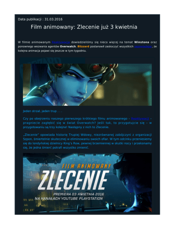Data publikacji : 31.03.2016 Film animowany: Zlecenie już 3 kwietnia W filmie animowanym Reaktywacja dowiedzieliśmy się nieco więcej na temat Winstona oraz ponownego wezwania agentów Overwatch. Blizzard postanowił zaskoczyć wszystkich zapowiadając, że kolejna animacja pojawi się jeszcze w tym tygodniu. Jeden strzał, jeden trup . . . Czy po obejrzeniu naszego pierwszego krótkiego filmu animowanego – Reaktywacji – pragniecie zagłębić się w świat Overwatch? Jeśli tak, to przygotujcie się – w przygotowaniu są trzy kolejne! Następny z nich to Zlecenie. „Zlecenie” opowiada historię Trupiej Wdowy, niezrównanej zabójczyni z organizacji Szpon, śmiertelnie skutecznej w eliminowaniu swoich ofiar. W tym odcinku przeniesiemy się do londyńskiej dzielnicy King’s Row, pewnej brzemiennej w skutki nocy i przekonamy się, że jedna śmierć potrafi wszystko zmienić. Wstrzymajcie oddech: premiera "Zlecenia" już 3 kwietnia o godz. 21:00 czasu polskiego, ekskluzywnie na kanałach YouTube PlayStation. Źródło: Battle.net Autor: Sigmar Liczba wyświetleń strony: 502 Data publikacji : 31.03.2016 Tagi: black widow, trupia wdowa, zlecenie, Film animowany Komentarz (0) dodaj komentarz Brak komentarzy dodaj komentarz Pozostałe nowości DreamHack Open: Valencia 2016 - Nerchio w półfinale - live! DreamHack Valencia to jedno z największych e-sportowych wydarzeń w Europie - dlatego nie mogło zabraknąć na nim StarCrafta II! W czasie rozgrywek 96 graczy będzie konkurować o 50 000 USD oraz 5 000 punktów WCS.Data publikacji: 16.07.20161 Aktualizacja 3.4 – Duże zmiany w rankingu StarCrafta II Na oficjalnym blogu Blizzarda pojawił się nowy wpis dotyczący tym razem zmian w rankingach: Ranking StarCrafta II jest areną dla niezwykle zaciętej rywalizacji. Do walki rusza wielu uczestników, ale tylko nieliczni awansują do ścisłej czołówki.Data publikacji: 03.07.20160 Rozpoczęcie trzeciego sezonu rankingowego 2016 Trzeci sezon tegorocznych rozgrywek ligowych w StarCrafta II uważamy za otwarty! Zresetowano pulę punktów premiowych oraz rankingi i przyznano nagrody za sezon drugi roku 2016.Data publikacji: 26.06.20160 Filmowy „Warcraft” już wkrótce w księgarniach! Powieść „Warcraft”, której wydanie zbiega się z polską premierą filmu „Warcraft. Początek” w reżyserii Duncana Jonesa, do księgarń trafi już 15 czerwca. Na kartach książki czytelnicy wkroczą w nowy wymiar emocji towarzyszących bohaterom fikcyjnych światów Azeroth i Draenor. Za sprawą Christie Golden, pisarki od lat cenionej przez fanów świata Warcraft, konflikt ludzi i orków nabierze jeszcze większej intensywności.Data publikacji: 13.06.20160 Blokada obecnego sezonu i darmowa zmiana nazwy postaci Jak czytamy na oficjalnym blogu Blizzarda: Obecny sezon rankingowy zbliża się ku końcowi i wkrótce zamknięte zostaną wszystkie ligi i dywizje. Kilka dni przed rozpoczęciem nowego sezonu, darmowa zmiana nazwy postaci w StarCraft II zostanie ponownie dodana do wszystkich kont, dla których funkcja ta nie jest obecnie dostępna.Data publikacji: 12.06.20160 Wszystkie nowości