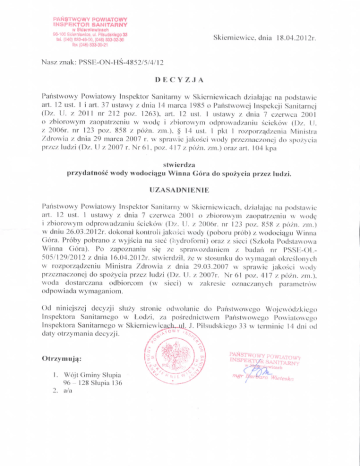 PANSTWOWY POWIATOWY iNSPEKTOR SANITARNY w Skltrntewlcach 96-100 Sklemlewlce, ul. Ptlsudsklego 33 Skierniewice, dnia 18.04.2012r tel. (048) 833-46-00, (046) 833-32-30 fax (046) 833-30-21 Nasz znak: PSSH-ON-IIS-4852/5/4/12 D E C Y Z .1 A Panstwowy Powiatowy Inspektor Sanitarny w Skierniewicach d/ialajac na podstawic art. 12 list. 1 i art. 37 ustawy / dnia 14 marca 1985 o Panstwowej Inspekcji Sanitarnej (Dz. U. z 2011 nr 212 po/. 1263), art. 12 usl. 1 ustawy / dnia 7 c/ervvca 2001 0 zbiorowym zaopatrzeniu w wode i zbiorowym odprowadzaniu sciekow (I)/. U. / 2006r. nr 123 po/,. 858 /. pozn. zm.), § 14 usl. 1 pkt 1 rozporzatlzenia Ministra /drowia /, dnia 29 marca 2007 r. w sprawie jakosci vvody przeznaczonej do spozycia przcz lud/i (Dz. U / 2007 r. Nr 6 1 , po/. 4 1 7 / pozn. zm.) ora/ art. 1 04 kpa stwierdza przydatnosc wody wodochjgu Winna Cora do spozycia przc/ lud/i. UZASADNIENIE Panstwowy Powiatowy Inspektor Sanitarny \ Skierniewicach, d/ialaj^e na podstawie art. 12 ust. 1 ustawy z dnia 7 c/erwea 2001 o zbiorowym zaopatrzeniu w \\ode 1 zbiorowym odprowadzaniu sciekow (O/. U. / 2()0ftr. nr 123 po/. 858 z po/n. zm.) w dniu 26.03.2012r. dokonai kontroli jakosci wody (poboru prob) z wodociajgu Winna Gora. Proby pobrano / wyjscia na siec (hydroforni) ora/ / sieci (Szkola Podstawowa Winna Gora). Po zapoznaniu si^ /e sprawozdanicm / budah nr PSSli-()l,505/129/2012 z dnia 1 6.04.201 2r. stwierdzil, ze vv stosunku do wymagan okrcslonych \ rozpor/t\d/eniu Ministra Zdrowia / dnia 29.03.2007 w sprawie jakosci wody przeznaczonej do spozycia przcz ludzi (Dz. U. / 2007r. Nr 61 po/. 417 / po/n. zm.). \\oda dostarczana odbiorcom fw sicci) w zakresie o/nae/anych parametrow odpowiada wymaganiom. ()d niniejszcj decy/ji slu/y stronie odwolanie do Panstwowego Wojewodzkiego Inspcklora Sanitarnego w Lod/i. za posrednietwem Panslwowego Powiatowego Pilsudskiego 33 vv terminie 14 dni od Inspektora Sanitarnego w SkicrnicwicacJo daty otr/y mania dccyzji. Otrzymujij: 1. Wojt Gminy Skipia 96- 128Slupia 136 2. a/a