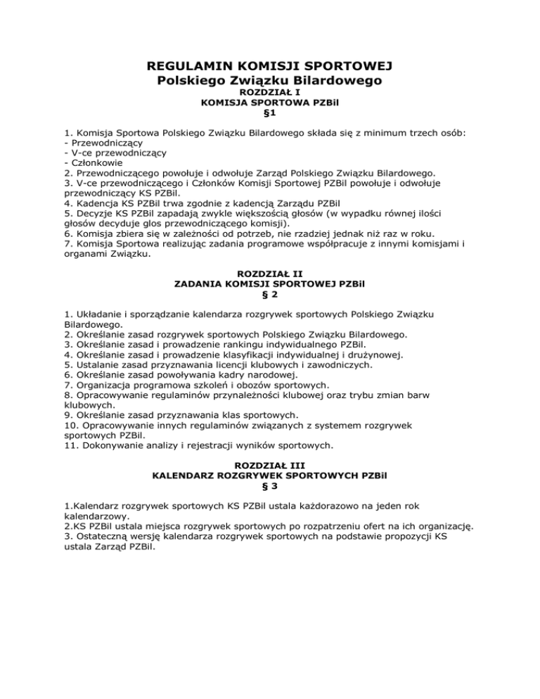 REGULAMIN KOMISJI SPORTOWEJ Polskiego Związku Bilardowego ROZDZIAŁ I KOMISJA SPORTOWA PZBil §1 1. Komisja Sportowa Polskiego Związku Bilardowego składa się z minimum trzech osób: - Przewodniczący - V-ce przewodniczący - Członkowie 2. Przewodniczącego powołuje i odwołuje Zarząd Polskiego Związku Bilardowego. 3. V-ce przewodniczącego i Członków Komisji Sportowej PZBil powołuje i odwołuje przewodniczący KS PZBil. 4. Kadencja KS PZBil trwa zgodnie z kadencją Zarządu PZBil 5. Decyzje KS PZBil zapadają zwykle większością głosów (w wypadku równej ilości głosów decyduje glos przewodniczącego komisji). 6. Komisja zbiera się w zależności od potrzeb, nie rzadziej jednak niż raz w roku. 7. Komisja Sportowa realizując zadania programowe współpracuje z innymi komisjami i organami Związku. ROZDZIAŁ II ZADANIA KOMISJI SPORTOWEJ PZBil §2 1. Układanie i sporządzanie kalendarza rozgrywek sportowych Polskiego Związku Bilardowego. 2. Określanie zasad rozgrywek sportowych Polskiego Związku Bilardowego. 3. Określanie zasad i prowadzenie rankingu indywidualnego PZBil. 4. Określanie zasad i prowadzenie klasyfikacji indywidualnej i drużynowej. 5. Ustalanie zasad przyznawania licencji klubowych i zawodniczych. 6. Określanie zasad powoływania kadry narodowej. 7. Organizacja programowa szkoleń i obozów sportowych. 8. Opracowywanie regulaminów przynależności klubowej oraz trybu zmian barw klubowych. 9. Określanie zasad przyznawania klas sportowych. 10. Opracowywanie innych regulaminów związanych z systemem rozgrywek sportowych PZBil. 11. Dokonywanie analizy i rejestracji wyników sportowych. ROZDZIAŁ III KALENDARZ ROZGRYWEK SPORTOWYCH PZBil §3 1.Kalendarz rozgrywek sportowych KS PZBil ustala każdorazowo na jeden rok kalendarzowy. 2.KS PZBil ustala miejsca rozgrywek sportowych po rozpatrzeniu ofert na ich organizację. 3. Ostateczną wersję kalendarza rozgrywek sportowych na podstawie propozycji KS ustala Zarząd PZBil. §4 1. Kalendarz rozgrywek sportowych PZBil ustalany jest z uwzględnieniem: - podziału na poszczególne odmiany gry w pool-bilard i karambol, - podziału na kategorie wiekowe, - podziału na kobiety i mężczyzn i osoby niepełnosprawne (ON) 2. W zawodach indywidualnych i drużynowych mężczyzn mogą brać udział kobiety (z wyjątkiem Mistrzostw Polski), w zawodach dla kobiet nie mogą brać udziału mężczyźni. 3. KS PZBil wnioskuje o przydzielenie organizacji poszczególnych zawodów sportowych do Zarządu PZBil w terminie do 30 września roku poprzedzającego dany kalendarz. 4. Kalendarz rozgrywek sportowych PZBil może uwzględniać turnieje regionalne i klubowe. Organizatorzy w/w turniejów chcący mieć rezerwację i wyłączność terminu w kalendarzu sportowym zobowiązani są zgłosić propozycje do KS PZBil w terminie do 15 września poprzedzającego ustalenie kalendarza sportowego. Szczegółowy tryb przyznawania terminów tych imprez zawiera regulamin sankcjonowania turniejów. 5. Biuro PZBil zobowiązane jest opracować umowy prawne z organizatorami poszczególnych zawodów. ROZDZIAŁ IV ROZGRYWKI SPORTOWE PZBil §5 1. W roku kalendarzowym odbywają się następujące zawody sportowe: A) Mistrzostwa Polski Mężczyzn w Pool-bilard „9", „8", „10” B) Mistrzostwa Polski Juniorów w Pool-bilard „9", „8", „14/1", „10” z podziałem na kategorie wiekowe: a) do lat 16 (w SWS) b) od 17 do 18 lat (poza SWS) C) Mistrzostwa Polski w Karambol, D) Mistrzostwa Polski Dziewcząt: a) w kategorii wiekowej do 18 lat w Pool bilard „10”, (poza SWS) b) w kategorii wiekowej 17-18 lat w Pool Bilard „9”, (poza SWS) c) w kategorii wiekowej do lat 16 w Pool Bilard „8” i „9” (w SWS) E) Polska Liga Bilardowa, F) Indywidualne Mistrzostwa Polski Biznesu, G) Drużynowe Mistrzostwa Polski Biznesu, H) Turnieje rankingowe Pol – Tour, I) Turnieje rankingowe Junior – Tour, J) Turnieje rankingowe w karambol, K) Drużynowy Puchar Polski, L) Drużynowe i Indywidualne Mistrzostwa Uczniowskich Klubów Sportowych – w ramach programu sportu dzieci i młodzieży dopuszcza sie organizacje innych imprez sportowych, Ł) Mistrzostwa Polski Old Boys M) Turnieje rankingowe Old Boys N) Mistrzostwa Polski Amatorów, O) Mistrzostwa Polski Kobiet w Pool Bilard „9”, „10” i „8”, P) Puchar Polski Kobiet, 2. Kalendarz imprez ON ustalony jest corocznie przez Komisję do spraw osób niepełnosprawnych. 3. Dopuszcza się organizację zawodów sportowych sygnowanych przez PZBil, nie objętych kalendarzem rozgrywek sportowych na dany rok. Zawody takie muszą być zgłoszone do KS na co najmniej 30 dni przed terminem ich organizacji i uzyskać pozytywną opinię KS §6 1. W Mistrzostwach Polski Mężczyzn (dot. Roz. 4, § 5, pkt.1 A) w 8-bil, 9-bil, 10-bil uczestniczy w każdą z odmian: - aktualny Mistrz Polski - 24 najwyżej sklasyfikowanych w Rankingu Polski (sezonu), uwzględniającym odjęcie najsłabszego wyniku w zawodach Pol-Tour - 12 zawodników wyłonionych w turniejach eliminacyjnych - 3 zawodników z tzw. "dzikiej karty" przydzielanej przez KS PZBil Decyzja o przyznaniu „Dzikich Kart” leży w gestii Komisji Sportowej i Zarządu PZBil. 2. W Mistrzostwach Polski Juniorów uczestniczy 16 zawodników w grupie starszej w każdej odmianie. W grupie młodszej w odmianę "9" i "8" i „10”wystepuje po 32 zawodników zaś w "14/1” szesnastu zawodników. Zasady kwalifikacji do Mistrzostw określa na każdy rok komunikatem KSDiM PZBil. 3. Szczegółowe zasady pozostałych zawodów rozgrywek sportowych opracowuje KS PZBil i przedstawia w Zarządzeniu lub regulaminach turniejów. 4. Przewodniczący KS PZBil przedkłada Zarządowi PZBil propozycje Dyrektora Generalnego zawodów odpowiedzialnego za przebieg sportowy i opracowanie szczegółowego regulaminu zawodów. W przypadku Mistrzostw Polski Dyrektora powołuje Zarząd PZBil. 5. Zasady udziału w Mistrzostwach Polski osób niepełnosprawnych ustala Komisja do spraw osób n
