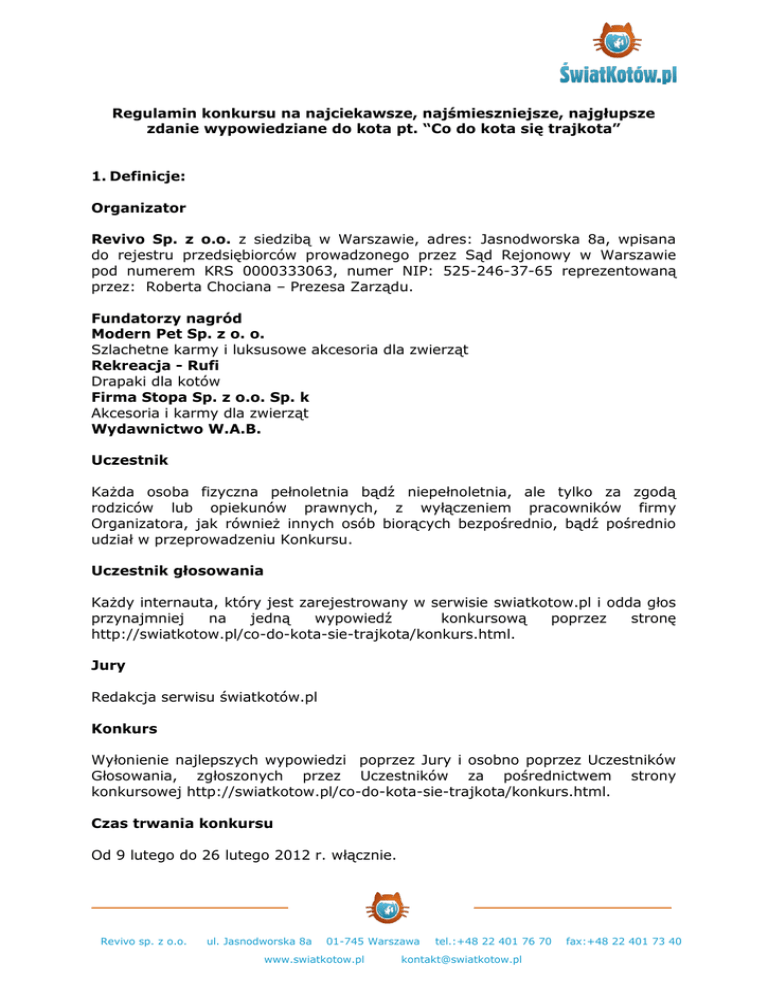 Regulamin konkursu na najciekawsze, najśmieszniejsze, najgłupsze zdanie wypowiedziane do kota pt. “Co do kota się trajkota” 1. Definicje: Organizator Revivo Sp. z o.o. z siedzibą w Warszawie, adres: Jasnodworska 8a, wpisana do rejestru przedsiębiorców prowadzonego przez Sąd Rejonowy w Warszawie pod numerem KRS 0000333063, numer NIP: 525-246-37-65 reprezentowaną przez: Roberta Chociana – Prezesa Zarządu. Fundatorzy nagród Modern Pet Sp. z o. o. Szlachetne karmy i luksusowe akcesoria dla zwierząt Rekreacja - Rufi Drapaki dla kotów Firma Stopa Sp. z o.o. Sp. k Akcesoria i karmy dla zwierząt Wydawnictwo W.A.B. Uczestnik Każda osoba fizyczna pełnoletnia bądź niepełnoletnia, ale tylko za zgodą rodziców lub opiekunów prawnych, z wyłączeniem pracowników firmy Organizatora, jak również innych osób biorących bezpośrednio, bądź pośrednio udział w przeprowadzeniu Konkursu. Uczestnik głosowania Każdy internauta, który jest zarejestrowany w serwisie swiatkotow.pl i odda głos przynajmniej na jedną wypowiedź konkursową poprzez stronę http://swiatkotow.pl/co-do-kota-sie-trajkota/konkurs.html. Jury Redakcja serwisu światkotów.pl Konkurs Wyłonienie najlepszych wypowiedzi poprzez Jury i osobno poprzez Uczestników Głosowania, zgłoszonych przez Uczestników za pośrednictwem strony konkursowej http://swiatkotow.pl/co-do-kota-sie-trajkota/konkurs.html. Czas trwania konkursu Od 9 lutego do 26 lutego 2012 r. włącznie. Revivo sp. z o.o. ul. Jasnodworska 8a 01-745 Warszawa www.swiatkotow.pl tel.:+48 22 401 76 70 [email protected] fax:+48 22 401 73 40 2. WARUNKI KONKURSU 2.1. 2.2. 2.3. Konkurs ma charakter otwarty, a udział w nim jest bezpłatny. Celem konkursu jest wyłonienie najlepszych wypowiedzi poprzez ocenę Jury i niezależnie Uczestników Głosowania. Zgłoszenie prac konkursowych odbywa się przez wypełnienie formularza przez Użytkownika na stronie konkursowej http://swiatkotow.pl/co-do-kota-sie-trajkota/dodaj.html Zgłaszane wypowiedzi muszą odpowiadać tematyce Konkursu i nie naruszać dobrych obyczajów. 3. WARUNKI UCZESTNICTWA W KONKURSIE 3.1. 3.2. 3.2. 3.3. 3.4. 3.5. Uczestnik zgłasza swoje prace poprzez wejście na stronę konkursową i uzupełnienie formularza. Formularz zgłoszeniowy wymaga podania wszystkich następujących informacji: - imię i nazwisko lub pseudonim - adres e-mail - zdanie wypowiedziane do kota - zdjęcie kota Przez wypełnienie formularza konkursowego Uczestnik oświadcza, że zgłoszona przez niego wypowiedź jest jego autorstwa i przysługuje mu do niej pełnia praw autorskich. Przez wypełnienie formularza konkursowego Uczestnik wyraża zgodę na warunki uczestnictwa w Konkursie i akceptuje zawarte w Regulaminie postanowienia. Przystępując do konkursu Uczestnik wyraża zgodę na zamieszczenie zgłoszonych przez niego wypowiedzi wraz ze zdjęciem na stronie konkursowej http://swiatkotow.pl/co-do-kota-sie-trajkota/ oraz na ich publiczne wystawienie przedstawiające szerszej publiczności wyniki Konkursu oraz na ich bezpłatne wykorzystanie w pozostałych celach promocyjnych i marketingowych Organizatora. Po zgłoszeniu prac przez Uczestnika Organizator niezwłocznie akceptuje do publikacji na stronie konkursowej http://swiatkotow.pl/co-do-kota-sie-trajkota/konkurs.html przesłane wypowiedzi. Zastrzega sobie jednak prawo do niepublikowania, a tym samym do niedopuszczenia do konkursu wypowiedzi nieodpowiadających kryteriom Konkursu. 4. OCENA PRAC KONKURSOWYCH 4.1 4.2 4.3 Najlepsze prace konkursowe zostaną wybrane przez Jury, która nagrodzi pięć najlepszych wypowiedzi. Decyzje Jury są niepodważalne i ostateczne. Wyniki Konkursu zostaną ogłoszone na portalu konkursowym do 29 lutego 2012 roku. Każdy ze zwycięzców zostanie o tym fakcie niezwłocznie indywidualnie Revivo sp. z o.o. ul. Jasnodworska 8a 01-745 Warszawa www.swiatkotow.pl tel.:+48 22 401 76 70 [email protected] fax:+48 22 401 73 40 4.4. 4.5. poinformowany za pośrednictwem e-maila. Spośród wszystkich wypowiedzi zostanie wyłonionych poprzez wybór Uczestników Głosowania pięć wypowiedzi, które uzyskają największą liczbę głosów, a tym samym zostaną wyróżnione. Uczestnik Głosownia może głosować raz podczas trwania konkursu na niezliczoną ilość kandydatów. 5. NAGRODY 5.1 Nagrodami w konkursie są: a) Nagroda Jury: I miejsce: II miejsce: III miejsce: IV i V miejsce: obróżka Funky Fish, zestaw składający się z 3 paczek karmy suchej oraz 3 puszek karmy ZiwiPeak+ legowisko namiot dla kota + legowisko + koszulka Horacego+ Książka „Kot Simona i Kociokwik” koszulka Horacego + namiot koszulka i kubek Horacego b) Nagroda Uczestników Głosowania: I miejsce: II miejsce: III miejsce: IV i V miejsce: 5.2. 5.3. 5.4 5.5 6. Drapak D-3A + Książka „Kot Simona i Kociokwik” + Kalendarz Kota Simona zestaw składający się z 3 paczek karmy suchej oraz 3 puszek karmy ZiwiPeak+ legowisko + Książka „Kot Simona i Kociokwik” namiot dla kota + legowisko + koszulka Horacego koszulka i kubek Horacego Organizator zastrzega, że wartość nagród jak i sama ich tematyka może ulec zmianie. Nagrodzony Uczestnik Konkursu jest zobowiązany do potwierdzenia przyjęcia nagrody w ciągu 7 dni kalendarzowych, od poinformowania go o jej zdobyciu za pośrednictwem poczty elektronicznej. W przypadku braku potwierdzenia akceptacji odbioru nagrody, bądź wyróżnienia Organizator przekaże to miejsce autorowi pracy, która uzyskała kolejną liczbę głosów w pracach Jury, bądź Uczestników Głosowania. Nagrody zostaną przesłane pocztą na podany przez użytkownika adres wysyłki. ODPOWIEDZIALNOŚĆ ORGANIZATORA Organizator nie ponosi odpowiedzialności za opoźnienia, bądź przeszkody w komunikacji z Uczestnikami oraz Uczestnikami Głosowania, ktore mogłyby wyniknąć z przyczyn od niego niezależnych. Organizator nie odpowiada za nagrody Fundatorów. Revivo sp. z o.o. ul. Jasnodworska 8a 01-745 Warszawa www.swiatkotow.pl tel.:+48 22 401