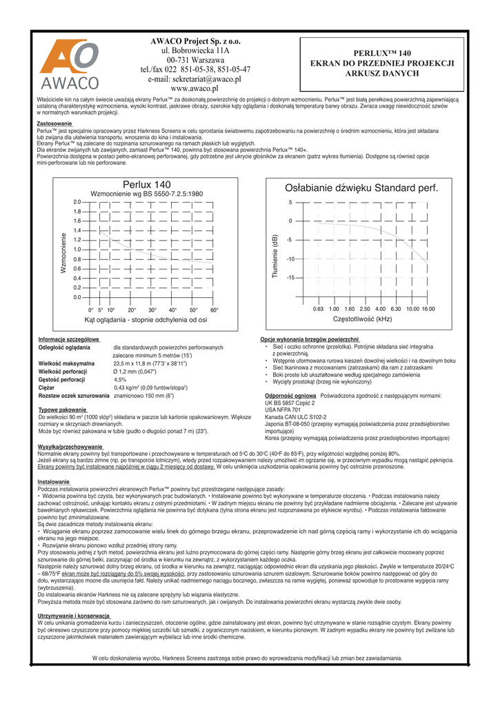 AWACO Project Sp. z o.o. ul. Bobrowiecka 11A 00-731 Warszawa tel./fax 022 851-05-38, 851-05-47 e-mail: [email protected] www.awaco.pl AWACO PERLUX™ 140 EKRAN DO PRZEDNIEJ PROJEKCJI ARKUSZ DANYCH Właściciele kin na całym świecie uważają ekrany Perlux™ za doskonałą powierzchnię do projekcji o dobrym wzmocnieniu. Perlux™ jest białą perełkową powierzchnią zapewniającą ustaloną charakterystykę wzmocnienia, wysoki kontrast, jaskrawe obrazy, szerokie kąty oglądania i doskonałą temperaturę barwy obrazu. Zwraca uwagę niewidoczność szwów w normalnych warunkach projekcji. Zastosowanie Perlux™ jest specjalnie opracowany przez Harkness Screens w celu sprostania światowemu zapotrzebowaniu na powierzchnię o średnim wzmocnieniu, która jest składana lub zwijana dla ułatwienia transportu, wnoszenia do kina i instalowania. Ekrany Perlux™ są zalecane do rozpinania sznurowanego na ramach płaskich lub wygiętych. Dla ekranów zwijanych lub zawijanych, zamiast Perlux™ 140, powinna być stosowana powierzchnia Perlux™ 140+. Powierzchnia dostępna w postaci pełno-ekranowej perforowanej, gdy potrzebne jest ukrycie głośników za ekranem (patrz wykres tłumienia). Dostępne są również opcje mini-perforowane lub nie perforowane. Perlux 140 2.0 Osłabianie dźwięku Standard perf. Wzmocnienie wg BS 5550-7.2.5:1980 5 1.8 0 1.4 Tłumienie (dB) Wzmocnienie 1.6 1.2 1.0 0.8 0.6 0.4 -5 -10 -15 0.2 0.0 0° 5° 10° 20° 30° 40° 50° 60° Kąt oglądania - stopnie odchylenia od osi Informacje szczegółowe Odległość oglądania dla standardowych powierzchni perforowanych zalecane minimum 5 metrów (15ʼ) Wielkość maksymalna 23,5 m x 11,8 m (77ʼ3ʼ x 38ʼ11”) Wielkość perforacji Ø 1,2 mm (0,047”) Gęstość perforacji 4,5% 0,43 kg/m2 (0,09 funtów/stopa2) Ciężar Rozstaw oczek sznurowania znamionowo 150 mm (6”) Typowe pakowanie Do wielkości 90 m2 (1000 stóp2) składana w paczce lub kartonie opakowaniowym. Większe rozmiary w skrzyniach drewnianych. Może być również pakowana w tubie (pudło o długości ponad 7 m) (23”). 0.63 1.00 1.60 2.50 4.00 6.30 10.00 16.00 Częstotliwość (kHz) Opcje wykonania brzegów powierzchni • Sieć i oczko ochronne (przelotka). Potrójnie składana sieć integralna z powierzchnią. • Wstępnie uformowana rurowa kieszeń dowolnej wielkości i na dowolnym boku • Sieć tkaninowa z mocowaniami (zatrzaskami) dla ram z zatrzaskami • Boki proste lub ukształtowane według specjalnego zamówienia • Wycięty prostokąt (brzeg nie wykończony) Odporność ogniowa Poświadczona zgodność z następującymi normami: UK BS 5857 Część 2 USA NFPA 701 Kanada CAN ULC S102-2 Japonia BT-08-050 (przepisy wymagają poświadczenia przez przedsiębiorstwo importujące) Korea (przepisy wymagają poświadczenia przez przedsiębiorstwo importujące) Wysyłka/przechowywanie Normalnie ekrany powinny być transportowane i przechowywane w temperaturach od 5oC do 30oC (40oF do 85oF), przy wilgotności względnej poniżej 80%. Jeżeli ekrany są bardzo zimne (np. po transporcie lotniczym), wtedy przed rozpakowywaniem należy umożliwić im ogrzanie się, w przeciwnym wypadku mogą nastąpić pęknięcia. Ekrany powinny być instalowane najpóźniej w ciągu 2 miesięcy od dostawy. W celu uniknięcia uszkodzenia opakowania powinny być ostrożnie przenoszone. Instalowanie Podczas instalowania powierzchni ekranowych Perlux™ powinny być przestrzegane następujące zasady: • Widownia powinna być czysta, bez wykonywanych prac budowlanych. • Instalowanie powinno być wykonywane w temperaturze otoczenia. • Podczas instalowania należy zachować ostrożność, unikając kontaktu ekranu z ostrymi przedmiotami. • W żadnym miejscu ekranu nie powinny być przykładane nadmierne obciążenia. • Zalecane jest używanie bawełnianych rękawiczek. Powierzchnia oglądania nie powinna być dotykana (tylna strona ekranu jest rozpoznawana po etykiecie wyrobu). • Podczas instalowania fałdowanie powinno być zminimalizowane. Są dwie zasadnicze metody instalowania ekranu: • Wciąganie ekranu poprzez zamocowanie wielu linek do górnego brzegu ekranu, przeprowadzenie ich nad górną częścią ramy i wykorzystanie ich do wciągania ekranu na jego miejsce. • Rozwijanie ekranu pionowo wzdłuż przedniej strony ramy. Przy stosowaniu jednej z tych metod, powierzchnia ekranu jest luźno przymocowana do górnej części ramy. Następnie górny brzeg ekranu jest całkowicie mocowany poprzez sznurowanie do górnej belki, zaczynając od środka w kierunku na zewnątrz, z wykorzystaniem każdego oczka. Następnie należy sznurować dolny brzeg ekranu, od środka w kierunku na zewnątrz, naciągając odpowiednio ekran dla uzyskania jego płaskości. Zwykle w temperaturze 20/24oC – 68/75oF ekran może być rozciągany do 5% swojej wysokości, przy zastosowaniu sznurowania sznurem sizalowym. Sznurowanie boków powinno następować od góry do dołu, wystarczająco mocne dla usunięcia fałd. Należy unikać nadmiernego naciągu bocznego, zwłaszcza na ramie wygiętej, ponieważ spowoduje to prostowanie wygięcia ramy (wybrzuszenia). Do instalowania ekranów Harkness nie są zalecane sprężyny lub wiązania elastyczne. Powyższa metoda może być stosowana zarówno do ram sznurowanych, jak i owijanych. Do instalowania powierzchni ekranu wystarczą zwykle dwie osoby. Utrzymywanie i konserwacja W celu unikania gromadzenia kurzu i zanieczyszczeń, otoczenie ogólne, gdzie zainstalowany jest ekran, powinno być utrzymywane w stanie rozsądnie czystym. Ekrany powinny być okresowo czyszczone przy pomocy miękkiej szczotki lub szmatki, z ograniczonym naciskiem, w kierunku pionowym. W żadnym wypadku ekrany nie powinny być zwilżane lub czyszczone jakimkolwiek materiałem zawierającym wybielacz lub inne środki chemiczne. W celu doskonalenia wyrobu, Harkness Screens zastrzega sobie prawo do wprowadzania modyfikacji lub zmian bez zawiadamiania.