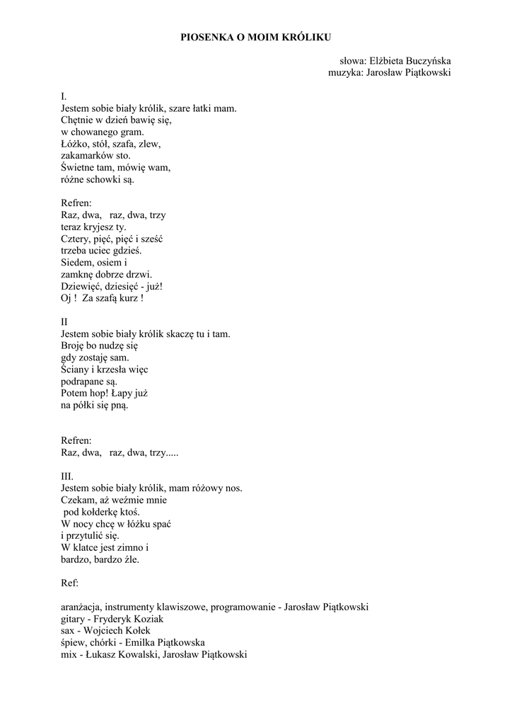 PIOSENKA O MOIM KRÓLIKU słowa: Elżbieta Buczyńska muzyka: Jarosław Piątkowski I. Jestem sobie biały królik, szare łatki mam. Chętnie w dzień bawię się, w chowanego gram. Łóżko, stół, szafa, zlew, zakamarków sto. Świetne tam, mówię wam, różne schowki są. Refren: Raz, dwa, raz, dwa, trzy teraz kryjesz ty. Cztery, pięć, pięć i sześć trzeba uciec gdzieś. Siedem, osiem i zamknę dobrze drzwi. Dziewięć, dziesięć - już! Oj ! Za szafą kurz ! II Jestem sobie biały królik skaczę tu i tam. Broję bo nudzę się gdy zostaję sam. Ściany i krzesła więc podrapane są. Potem hop! Łapy już na półki się pną. Refren: Raz, dwa, raz, dwa, trzy..... III. Jestem sobie biały królik, mam różowy nos. Czekam, aż weźmie mnie pod kołderkę ktoś. W nocy chcę w łóżku spać i przytulić się. W klatce jest zimno i bardzo, bardzo źle. Ref: aranżacja, instrumenty klawiszowe, programowanie - Jarosław Piątkowski gitary - Fryderyk Koziak sax - Wojciech Kołek śpiew, chórki - Emilka Piątkowska mix - Łukasz Kowalski, Jarosław Piątkowski