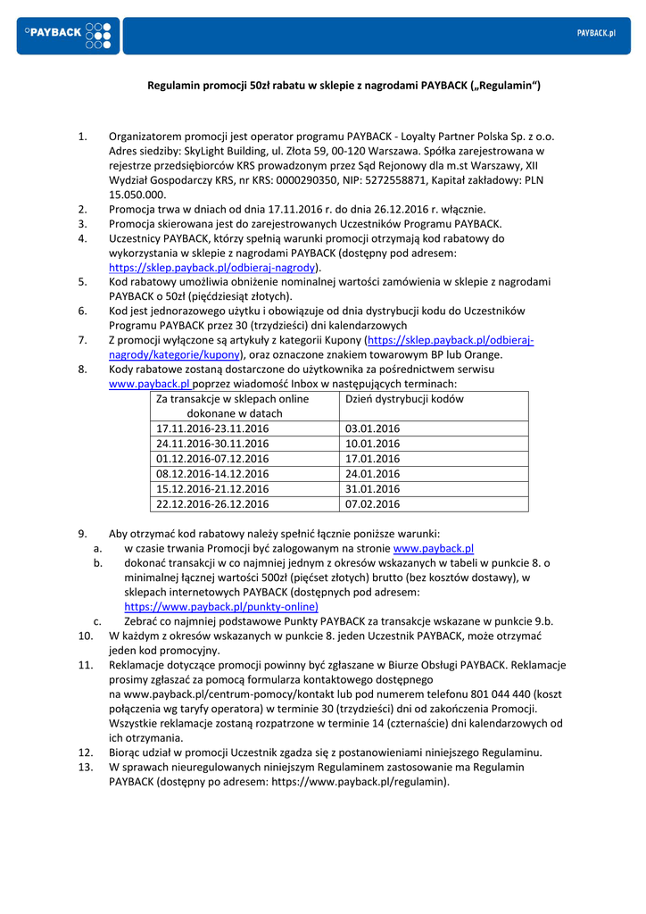 Regulamin promocji 50zł rabatu w sklepie z nagrodami PAYBACK („Regulamin“) 1. 2. 3. 4. 5. 6. 7. 8. 9. Organizatorem promocji jest operator programu PAYBACK - Loyalty Partner Polska Sp. z o.o. Adres siedziby: SkyLight Building, ul. Złota 59, 00-120 Warszawa. Spółka zarejestrowana w rejestrze przedsiębiorców KRS prowadzonym przez Sąd Rejonowy dla m.st Warszawy, XII Wydział Gospodarczy KRS, nr KRS: 0000290350, NIP: 5272558871, Kapitał zakładowy: PLN 15.050.000. Promocja trwa w dniach od dnia 17.11.2016 r. do dnia 26.12.2016 r. włącznie. Promocja skierowana jest do zarejestrowanych Uczestników Programu PAYBACK. Uczestnicy PAYBACK, którzy spełnią warunki promocji otrzymają kod rabatowy do wykorzystania w sklepie z nagrodami PAYBACK (dostępny pod adresem: https://sklep.payback.pl/odbieraj-nagrody). Kod rabatowy umożliwia obniżenie nominalnej wartości zamówienia w sklepie z nagrodami PAYBACK o 50zł (pięćdziesiąt złotych). Kod jest jednorazowego użytku i obowiązuje od dnia dystrybucji kodu do Uczestników Programu PAYBACK przez 30 (trzydzieści) dni kalendarzowych Z promocji wyłączone są artykuły z kategorii Kupony (https://sklep.payback.pl/odbierajnagrody/kategorie/kupony), oraz oznaczone znakiem towarowym BP lub Orange. Kody rabatowe zostaną dostarczone do użytkownika za pośrednictwem serwisu www.payback.pl poprzez wiadomość Inbox w następujących terminach: Za transakcje w sklepach online Dzień dystrybucji kodów dokonane w datach 17.11.2016-23.11.2016 03.01.2016 24.11.2016-30.11.2016 10.01.2016 01.12.2016-07.12.2016 17.01.2016 08.12.2016-14.12.2016 24.01.2016 15.12.2016-21.12.2016 31.01.2016 22.12.2016-26.12.2016 07.02.2016 Aby otrzymać kod rabatowy należy spełnić łącznie poniższe warunki: a. w czasie trwania Promocji być zalogowanym na stronie www.payback.pl b. dokonać transakcji w co najmniej jednym z okresów wskazanych w tabeli w punkcie 8. o minimalnej łącznej wartości 500zł (pięćset złotych) brutto (bez kosztów dostawy), w sklepach internetowych PAYBACK (dostępnych pod adresem: https://www.payback.pl/punkty-online) c. Zebrać co najmniej podstawowe Punkty PAYBACK za transakcje wskazane w punkcie 9.b. 10. W każdym z okresów wskazanych w punkcie 8. jeden Uczestnik PAYBACK, może otrzymać jeden kod promocyjny. 11. Reklamacje dotyczące promocji powinny być zgłaszane w Biurze Obsługi PAYBACK. Reklamacje prosimy zgłaszać za pomocą formularza kontaktowego dostępnego na www.payback.pl/centrum-pomocy/kontakt lub pod numerem telefonu 801 044 440 (koszt połączenia wg taryfy operatora) w terminie 30 (trzydzieści) dni od zakończenia Promocji. Wszystkie reklamacje zostaną rozpatrzone w terminie 14 (czternaście) dni kalendarzowych od ich otrzymania. 12. Biorąc udział w promocji Uczestnik zgadza się z postanowieniami niniejszego Regulaminu. 13. W sprawach nieuregulowanych niniejszym Regulaminem zastosowanie ma Regulamin PAYBACK (dostępny po adresem: https://www.payback.pl/regulamin).