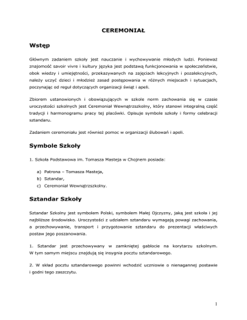 CEREMONIAŁ Wstęp Głównym zadaniem szkoły jest nauczanie i wychowywanie młodych ludzi. Ponieważ znajomość savoir vivre i kultury języka jest podstawą funkcjonowania w społeczeństwie, obok wiedzy i umiejętności, przekazywanych na zajęciach lekcyjnych i pozalekcyjnych, należy uczyć dzieci i młodzież zasad postępowania w różnych miejscach i sytuacjach, poczynając od reguł dotyczących organizacji świąt i apeli. Zbiorem ustanowionych i obowiązujących w szkole norm zachowania się w czasie uroczystości szkolnych jest Ceremoniał Wewnątrzszkolny, który stanowi integralną część tradycji i harmonogramu pracy tej placówki. Opisuje symbole szkoły i formy celebracji sztandaru. Zadaniem ceremoniału jest również pomoc w organizacji ślubowań i apeli. Symbole Szkoły 1. Szkoła Podstawowa im. Tomasza Masteja w Chojnem posiada: a) Patrona – Tomasza Masteja, b) Sztandar, c) Ceremoniał Wewnątrzszkolny. Sztandar Szkoły Sztandar Szkolny jest symbolem Polski, symbolem Małej Ojczyzny, jaką jest szkoła i jej najbliższe środowisko. Uroczystości z udziałem sztandaru wymagają powagi zachowania, a przechowywanie, transport i przygotowanie sztandaru do prezentacji właściwych postaw jego poszanowania. 1. Sztandar jest przechowywany w zamkniętej gablocie na korytarzu szkolnym. W tym samym miejscu znajdują się insygnia pocztu sztandarowego. 2. W skład pocztu sztandarowego powinni wchodzić uczniowie o nienagannej postawie i godni tego zaszczytu. 1 Skład pocztu sztandarowego: chorąży: jeden uczeń, zastępca chorążego: jeden uczeń, asysta: dwie uczennice. zastępstwo asysty: dwie uczennice. Kandydatury składu pocztu zgłaszane są przez opiekuna pocztu sztandarowego za zgodą wychowawcy, nauczycieli. Uczniowie wybierani są z klasy programowo najwyższej. Kadencja pocztu trwa jeden rok - począwszy od ślubowania w dniu uroczystego zakończenia roku szkolnego klas szóstych. Po skończeniu kadencji uczniowie otrzymują pamiątkowe dyplomy oraz nagrody książkowe, a ich nazwiska zostają wpisane do kroniki szkoły. Decyzją rady pedagogicznej uczniowie mogą być odwołani ze składu pocztu sztandarowego. W takim wypadku należy dokonać kolejnego wyboru. 3. Insygnia pocztu sztandarowego to: biało - czerwone szarfy założone przez prawe ramię, białe rękawiczki. Uczniowie, uczestnicząc w uroczystościach szkolnych i pozaszkolnych, powinni być ubrani odświętnie: chłopcy: białe koszule i ciemne spodnie, dziewczęta: białe bluzki i ciemne spódnice. 4. Sztandar uczestniczy we wszystkich apelach, które odbywają się w szkole. Opuszcza miejsce uroczystości przed częścią artystyczną. Na apelach szkolnych poświęconych uroczystościom państwowym śpiewany jest hymn Polski "Mazurek Dąbrowskiego". 5. Poczet sztandarowy uczestniczy również w mszach świętych z okazji: a) uroczystości rozpoczęcia i zakończenia roku szkolnego, b) Dnia Patrona Szkoły, c) ceremonii ślubowania klas pierwszych. 2 6. Postawy sztandaru i pocztu sztandarowego: "zasadnicza" - na baczność, chorąży trzyma przed sobą sztandar w pozycji pionowej, jest to również postawa przyjmowana przez asystę w czasie salutowania i prezentowania sztandaru oraz w trakcie marszu, "prezentuj" - chorąży unosi sztandar pionowo do góry, ta postawa przyjmowana jest tuż przed wprowadzeniem, wyprowadzeniem i wystąpieniem pocztu sztandarowego, "salutowanie sztandarem" - chorąży trzyma sztandar przed sobą pod kątem około 45 stopni, sztandar znajduje się w tej postawie w momencie ślubowania, składania przyrzeczeń, w kościele w czasie Podniesienia, Komunii Świętej i błogosławieństwa oraz odczytywania apelu poległych, czy salwy honorowej, "na ramię" - w czasie marszu sztandar znajduje się na prawym ramieniu chorążego pod kątem około 45 stopni, "spocznij" - postawa pocztu sztandarowego. 7. Ceremoniał przekazania opieki nad sztandarem odbywa się w czasie uroczystego zakończenia roku szkolnego klas szóstych. Najpierw występuje poczet sztandarowy ze sztandarem, a następnie wychodzi nowy skład pocztu i ustawia się w następującym porządku : chorąży i jego zastępca z przodu sztandaru, asysta przodem do bocznych płaszczyzn sztandaru. Jako pierwszy zabiera głos szóstoklasista - dotychczasowy chorąży pocztu sztandarowego, który mówi: Przekazujemy Wam sztandar - symbol Szkoły Podstawowej im. Tomasza Masteja w Chojnem. Opiekujcie się nim i godnie reprezentujcie naszą szkołę. Na co piątoklasista - chorąży nowego pocztu sztandarowego odpowiada: Przyjmujemy od was sztandar szkoły. Obiecujemy dbać o niego, sumiennie wypełniać swoje obowiązki i być godnymi reprezentantami Szkoły Podstawowej w Chojnem. Po tych słowach dotychczasowa asysta przekazuje insygnia. Chorąży salutuje sztandarem, nowy chorąży przyklęka na prawe kolano, całuje róg sztandaru, po tym szóstoklasista przekazuje sztandar. 3 Pasowanie na ucznia 1. Ślubowanie uczniów klas pierwszych odbywa się w postawie zasadniczej. Wszyscy - uczniowie, nauczyciele i goście stoją na baczność. Przedstawiciele klas pierwszych podchodzą do sztandaru, który stoi na środku sali. Każdy pierwszoklasista trzyma uniesioną do góry na wysokości oczu prawą rękę z wyciągniętymi jak do salutowania dwoma palcami i powtarza rotę przysięgi. Rota przysięgi: Ślubuję być dobrym Polakiem, dbać o imię swojej klasy i szkoły. Będę uczyć się w szkole, jak kochać Ojczyznę, jak dla niej pracować, kiedy dorosnę. Będę się starać być dobrym kolegą, swym zachowaniem i nauką sprawiać radość rodzicom i nauczycielom. Tak mi dopomóż Bóg. 2. Pasowanie na ucznia następuje tuż po ślubowaniu złożonym przez pierwszoklasistów. Dyrektor Szkoły na lewe ramię każdego pierwszoklasisty, kładzie duży ołówek i mówi: Pasuję Ciebie na ucznia Szkoły Podstawowej im. Tomasza Masteja w Chojnem. Pożegnanie absolwentów 1. Na uroczystym apelu kończącym rok szkolny wszy