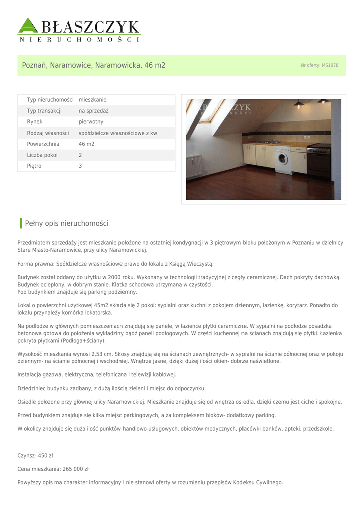 Poznań, Naramowice, Naramowicka, 46 m2 Nr oferty: MS1078 Typ nieruchomości mieszkanie Typ transakcji na sprzedaż Rynek pierwotny Rodzaj własności spółdzielcze własnościowe z kw Powierzchnia 46 m2 Liczba pokoi 2 Piętro 3 Pełny opis nieruchomości Przedmiotem sprzedaży jest mieszkanie położone na ostatniej kondygnacji w 3 piętrowym bloku położonym w Poznaniu w dzielnicy Stare Miasto-Naramowice, przy ulicy Naramowickiej. Forma prawna: Spółdzielcze własnościowe prawo do lokalu z Księgą Wieczystą. Budynek został oddany do użytku w 2000 roku. Wykonany w technologii tradycyjnej z cegły ceramicznej. Dach pokryty dachówką. Budynek ocieplony, w dobrym stanie. Klatka schodowa utrzymana w czystości. Pod budynkiem znajduje się parking podziemny. Lokal o powierzchni użytkowej 45m2 składa się 2 pokoi: sypialni oraz kuchni z pokojem dziennym, łazienkę, korytarz. Ponadto do lokalu przynależy komórka lokatorska. Na podłodze w głównych pomieszczeniach znajdują się panele, w łazience płytki ceramiczne. W sypialni na podłodze posadzka betonowa gotowa do położenia wykładziny bądź paneli podłogowych. W części kuchennej na ścianach znajdują się płytki. Łazienka pokryta płytkami (Podłoga+ściany). Wysokość mieszkania wynosi 2,53 cm. Skosy znajdują się na ścianach zewnętrznych- w sypialni na ścianie północnej oraz w pokoju dziennym- na ścianie północnej i wschodniej. Wnętrze jasne, dzięki dużej ilości okien- dobrze naświetlone. Instalacja gazowa, elektryczna, telefoniczna i telewizji kablowej. Dziedziniec budynku zadbany, z dużą ilością zieleni i miejsc do odpoczynku. Osiedle połozone przy głównej ulicy Naramowickiej. Mieszkanie znajduje się od wnętrza osiedla, dzięki czemu jest ciche i spokojne. Przed budynkiem znajduje się kilka miejsc parkingowych, a za kompleksem bloków- dodatkowy parking. W okolicy znajduje się duża ilość punktów handlowo-usługowych, obiektów medycznych, placówki banków, apteki, przedszkole. Czynsz- 450 zł Cena mieszkania: 265 000 zł Powyższy opis ma charakter informacyjny i nie stanowi oferty w rozumieniu przepisów Kodeksu Cywilnego. Skontaktuj się z nami Mateusz Tarnowy Numer licencji: e-mail: [email protected] tel: + 48 61 852 68 66 tel: + 48 516 020 271 fax: + 48 61 851 52 51 ul. Młyńska 3, 61-729 Poznań tel. 61 852 68 66 | fax. 61 851 52 51 e-mail: [email protected] www.blaszczyk.com.pl