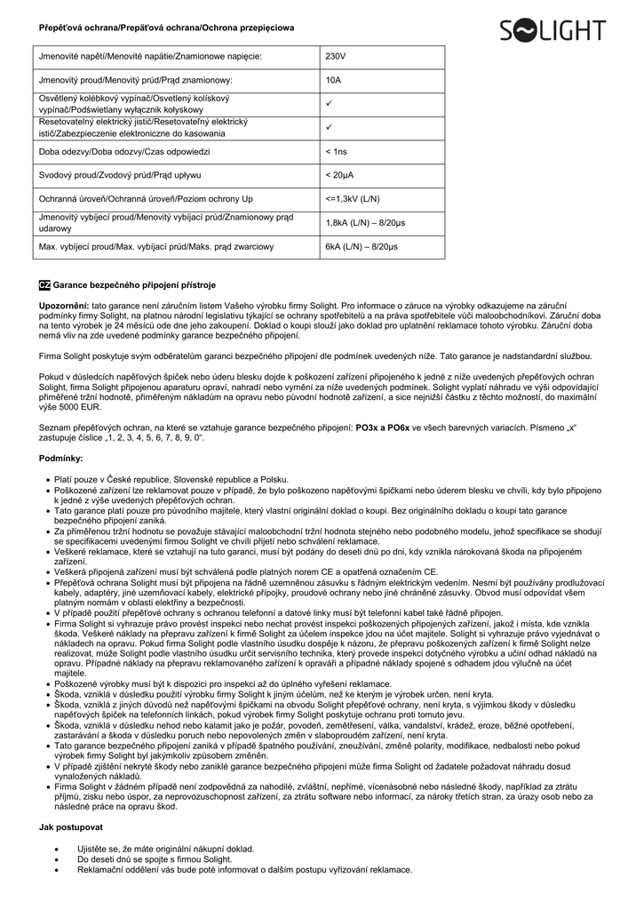 Přepěťová ochrana/Prepäťová ochrana/Ochrona przepięciowa Jmenovité napětí/Menovité napätie/Znamionowe napięcie: 230V Jmenovitý proud/Menovitý prúd/Prąd znamionowy: 10A Osvětlený kolébkový vypínač/Osvetlený kolískový vypínač/Podświetlany wyłącznik kołyskowy Resetovatelný elektrický jistič/Resetovateľný elektrický istič/Zabezpieczenie elektroniczne do kasowania Doba odezvy/Doba odozvy/Czas odpowiedzi < 1ns Svodový proud/Zvodový prúd/Prąd upływu < 20µA Ochranná úroveň/Ochranná úroveň/Poziom ochrony Up <=1,3kV (L/N) Jmenovitý vybíjecí proud/Menovitý vybíjací prúd/Znamionowy prąd udarowy 1,8kA (L/N) – 8/20µs Max. vybíjecí proud/Max. vybíjací prúd/Maks. prąd zwarciowy 6kA (L/N) – 8/20µs CZ Garance bezpečného připojení přístroje Upozornění: tato garance není záručním listem Vašeho výrobku firmy Solight. Pro informace o záruce na výrobky odkazujeme na záruční podmínky firmy Solight, na platnou národní legislativu týkající se ochrany spotřebitelů a na práva spotřebitele vůči maloobchodníkovi. Záruční doba na tento výrobek je 24 měsíců ode dne jeho zakoupení. Doklad o koupi slouží jako doklad pro uplatnění reklamace tohoto výrobku. Záruční doba nemá vliv na zde uvedené podmínky garance bezpečného připojení. Firma Solight poskytuje svým odběratelům garanci bezpečného připojení dle podmínek uvedených níže. Tato garance je nadstandardní službou. Pokud v důsledcích napěťových špiček nebo úderu blesku dojde k poškození zařízení připojeného k jedné z níže uvedených přepěťových ochran Solight, firma Solight připojenou aparaturu opraví, nahradí nebo vymění za níže uvedených podmínek. Solight vyplatí náhradu ve výši odpovídající přiměřené tržní hodnotě, přiměřeným nákladům na opravu nebo původní hodnotě zařízení, a sice nejnižší částku z těchto možností, do maximální výše 5000 EUR. Seznam přepěťových ochran, na které se vztahuje garance bezpečného připojení: PO3x a PO6x ve všech barevných variacích. Písmeno „x“ zastupuje číslice „1, 2, 3, 4, 5, 6, 7, 8, 9, 0“. Podmínky: • Platí pouze v České republice, Slovenské republice a Polsku. • Poškozené zařízení lze reklamovat pouze v případě, že bylo poškozeno napěťovými špičkami nebo úderem blesku ve chvíli, kdy bylo připojeno k jedné z výše uvedených přepěťových ochran. • Tato garance platí pouze pro původního majitele, který vlastní originální doklad o koupi. Bez originálního dokladu o koupi tato garance bezpečného připojení zaniká. • Za přiměřenou tržní hodnotu se považuje stávající maloobchodní tržní hodnota stejného nebo podobného modelu, jehož specifikace se shodují se specifikacemi uvedenými firmou Solight ve chvíli přijetí nebo schválení reklamace. • Veškeré reklamace, které se vztahují na tuto garanci, musí být podány do deseti dnů po dni, kdy vznikla nárokovaná škoda na připojeném zařízení. • Veškerá připojená zařízení musí být schválená podle platných norem CE a opatřená označením CE. • Přepěťová ochrana Solight musí být připojena na řádně uzemněnou zásuvku s řádným elektrickým vedením. Nesmí být používány prodlužovací kabely, adaptéry, jiné uzemňovací kabely, elektrické přípojky, proudové ochrany nebo jiné chráněné zásuvky. Obvod musí odpovídat všem platným normám v oblasti elektřiny a bezpečnosti. • V případě použití přepěťové ochrany s ochranou telefonní a datové linky musí být telefonní kabel také řádně připojen. • Firma Solight si vyhrazuje právo provést inspekci nebo nechat provést inspekci poškozených připojených zařízení, jakož i místa, kde vznikla škoda. Veškeré náklady na přepravu zařízení k firmě Solight za účelem inspekce jdou na účet majitele. Solight si vyhrazuje právo vyjednávat o nákladech na opravu. Pokud firma Solight podle vlastního úsudku dospěje k názoru, že přepravu poškozených zařízení k firmě Solight nelze realizovat, může Solight podle vlastního úsudku určit servisního technika, který provede inspekci dotyčného výrobku a učiní odhad nákladů na opravu. Případné náklady na přepravu reklamovaného zařízení k opraváři a případné náklady spojené s odhadem jdou výlučně na účet majitele. • Poškozené výrobky musí být k dispozici pro inspekci až do úplného vyřešení reklamace. • Škoda, vzniklá v důsledku použití výrobku firmy Solight k jiným účelům, než ke kterým je výrobek určen, není kryta. • Škoda, vzniklá z jiných důvodů než napěťovými špičkami na obvodu Solight přepěťové ochrany, není kryta, s výjimkou škody v důsledku napěťových špiček na telefonních linkách, pokud výrobek firmy Solight poskytuje ochranu proti tomuto jevu. • Škoda, vzniklá v důsledku nehod nebo kalamit jako je požár, povodeň, zemětřesení, válka, vandalství, krádež, eroze, běžné opotřebení, zastarávání a škoda v důsledku poruch nebo nepovolených změn v slaboproudém zařízení, není kryta. • Tato garance bezpečného připojení zaniká v případě špatného používání, zneužívání, změně polarity, modifikace, nedbalosti nebo pokud výrobek firmy Solight byl jakýmkoliv způsobem změněn. • V případě zjištění nekryté škody nebo zaniklé garance bezpečného připojení může firma Solight od žadatele požadovat náhradu dosud vynaložených nákladů. • Firma Solight v žádném případě není zodpovědná za nahodilé, zvláštní, nepřímé, vícenásobné nebo následné škody, například za ztrátu příjmů, zisku nebo úspor, za neprovozuschopnost zařízení, za ztrátu software nebo informací, za nároky třetích stran, za úrazy osob nebo za následné práce n